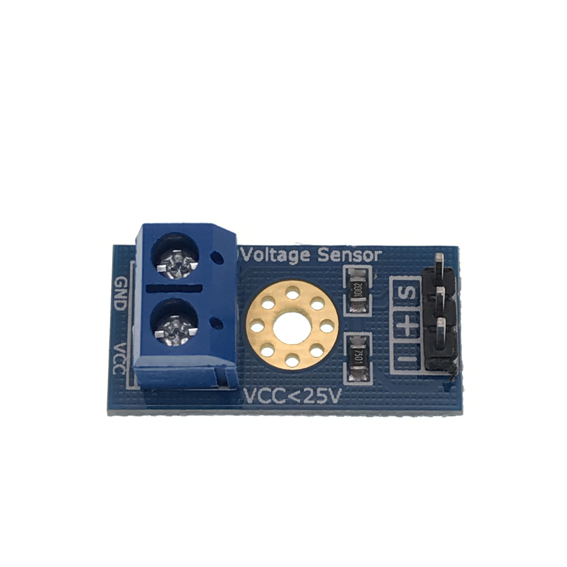 This module is designed based on the resistance voltage division principle, which can reduce the input voltage of the terminal interface by 5 times, and the voltage of Arduino analog input is 5V, then the input voltage of the voltage detection module cannot be greater than 5V × 5=25V (if 3.3V system is used, the input voltage cannot be greater than 3.3 vx5 = 16.5V). The analog resolution of this module is 0.00489V(5V/1023) because the AVR chip used in Arduino is 10-bit AD, therefore, the voltage detection module detects that the input small voltage is 0.00489V × 5=0.02445V.