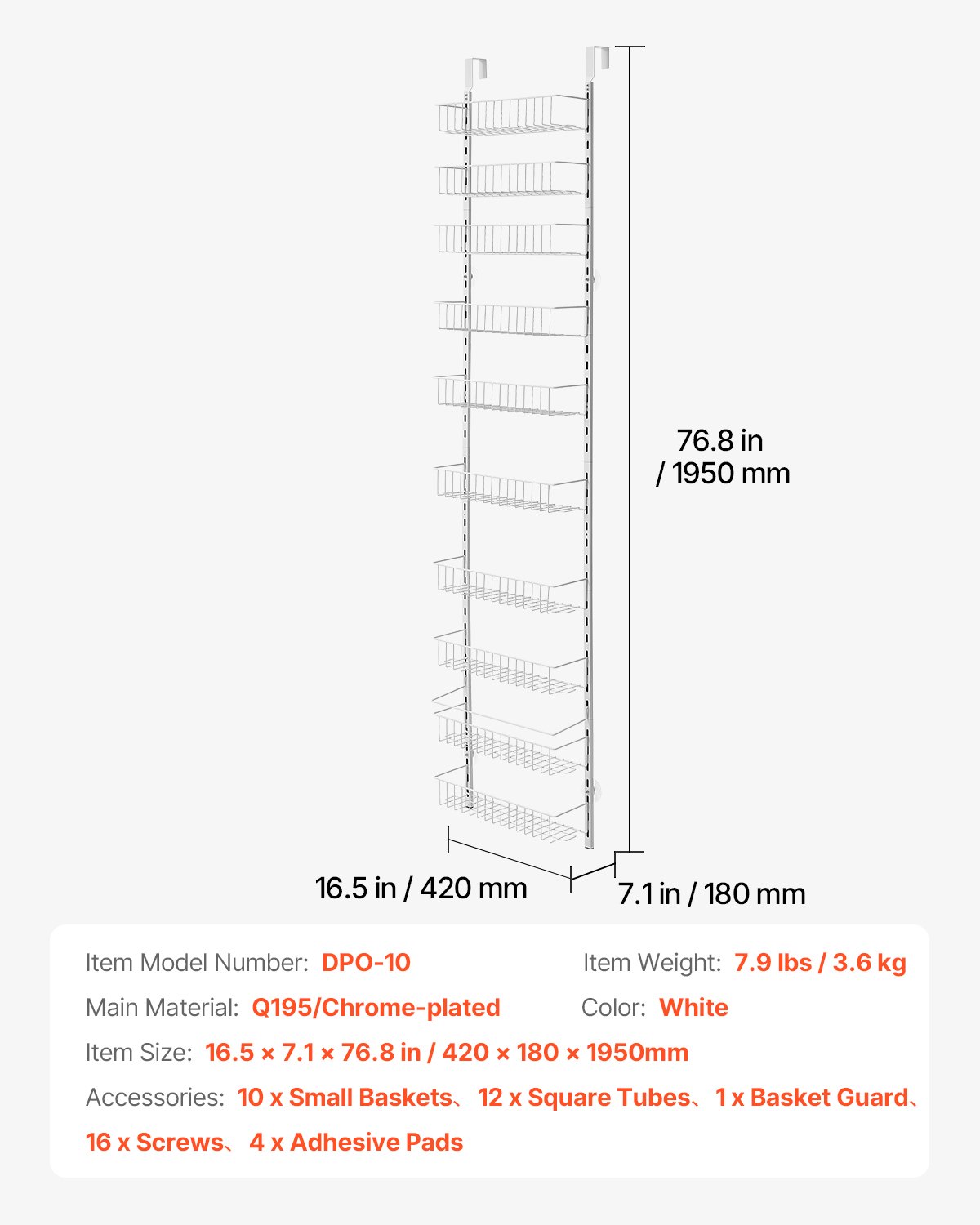 VEVOR Vorratsschrank Speisekammer-Organizer Aufbewahrung über der Tür, 10-stufige Gewürzregale zum Aufhängen aus Stahl, verstellbare Lagerregale für die Wand, für Zuhause Küche Badezimmer, Wei_
