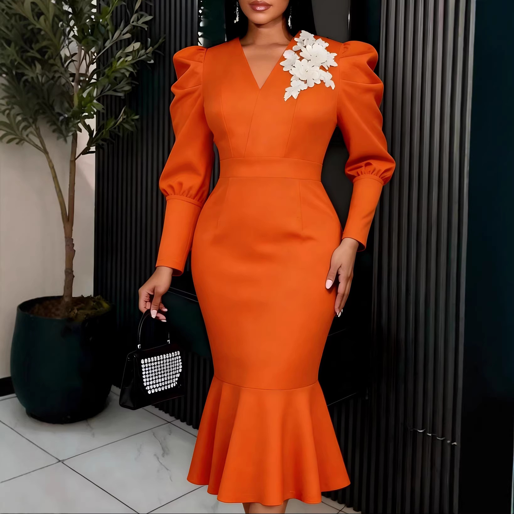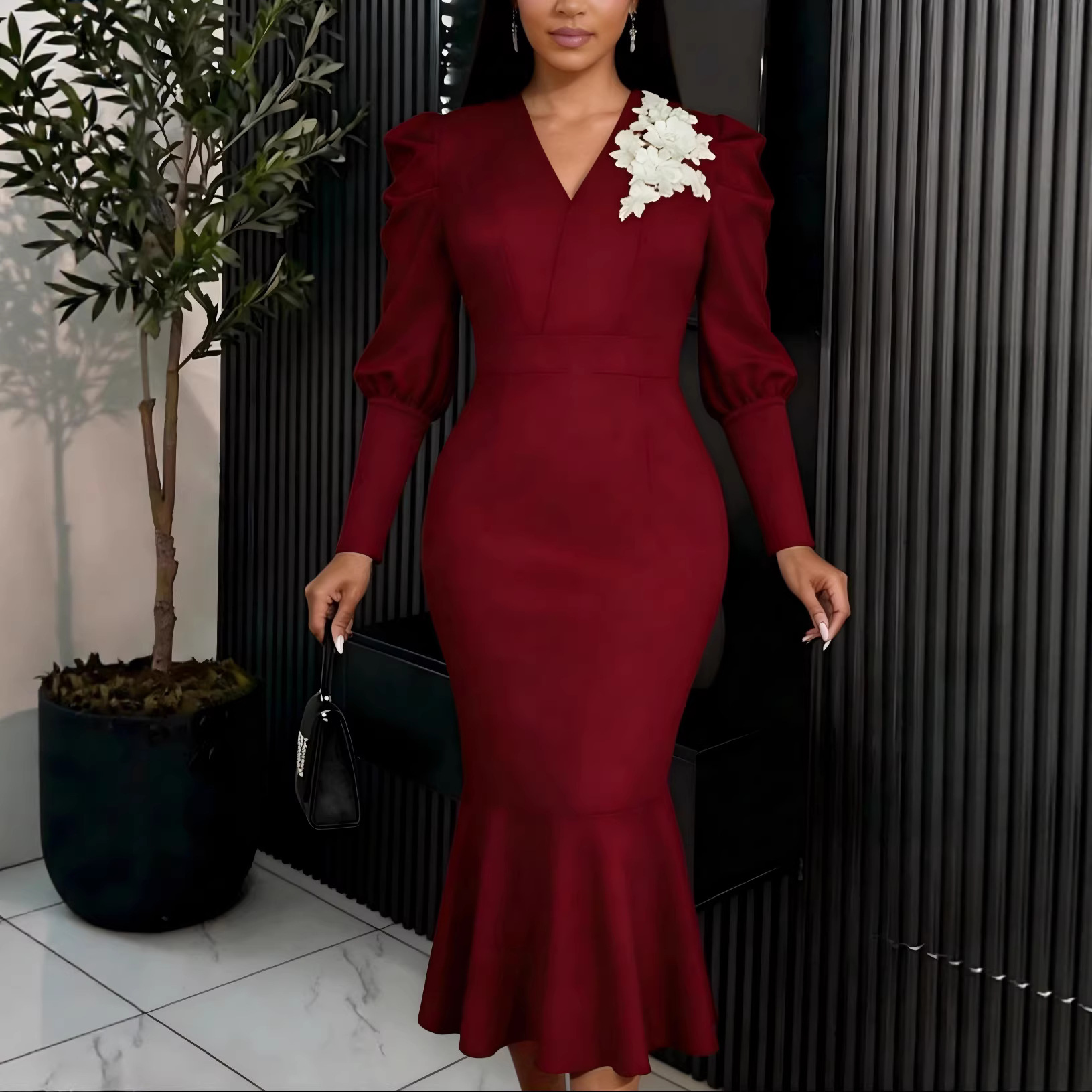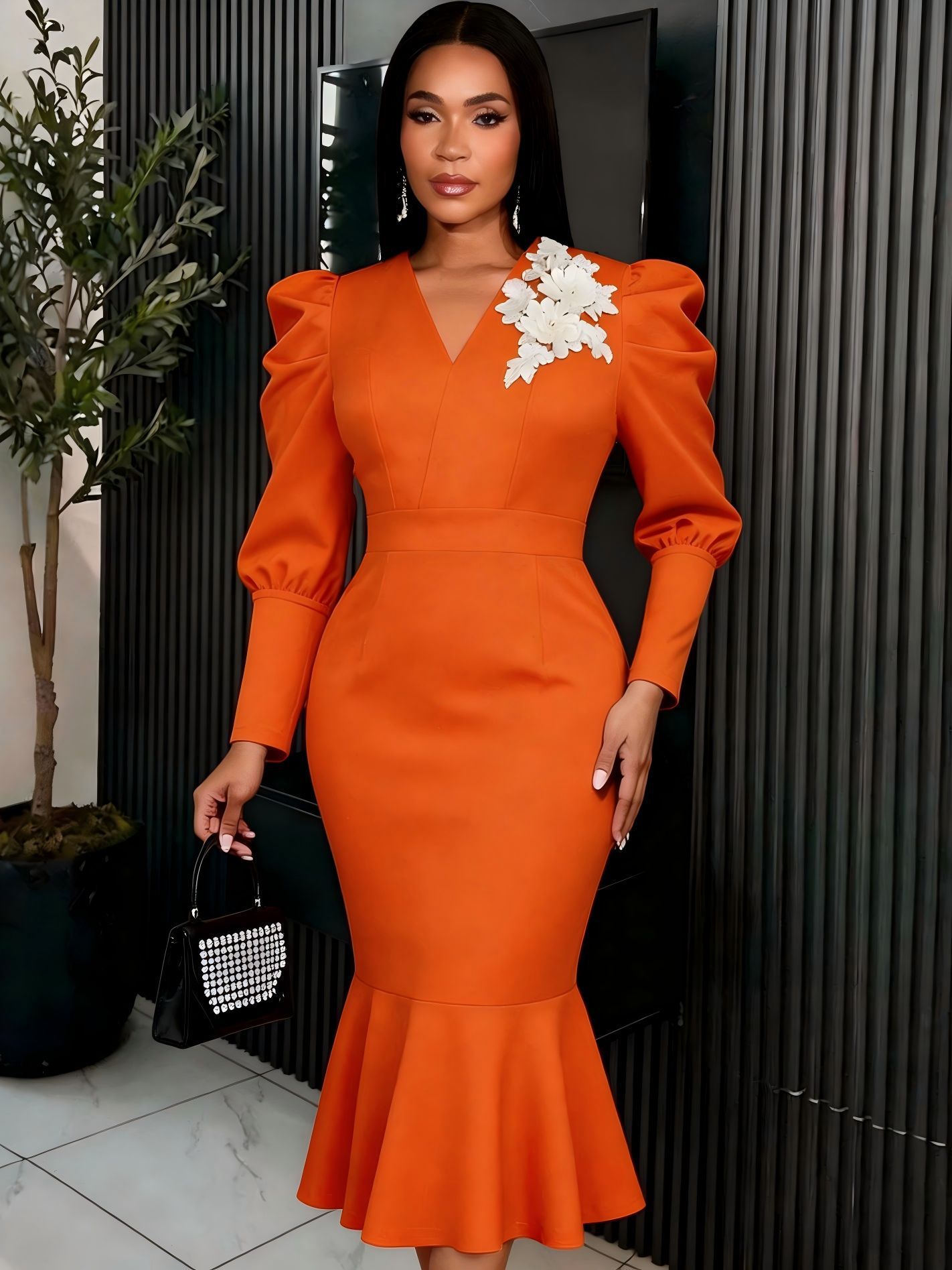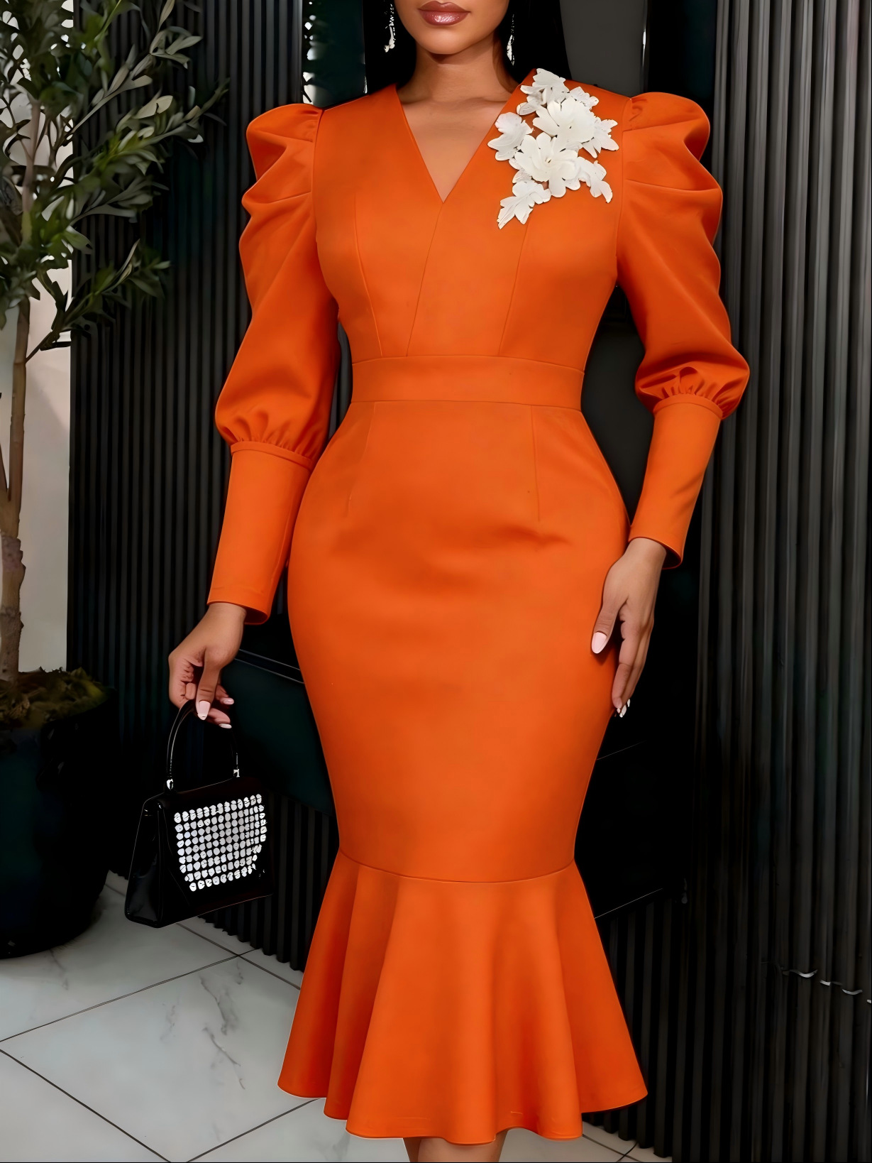 Fashion Elements: V-neck, Solid Color, Floral Design, Stylish, Defined Waist, Three-Dimensional Embellishments