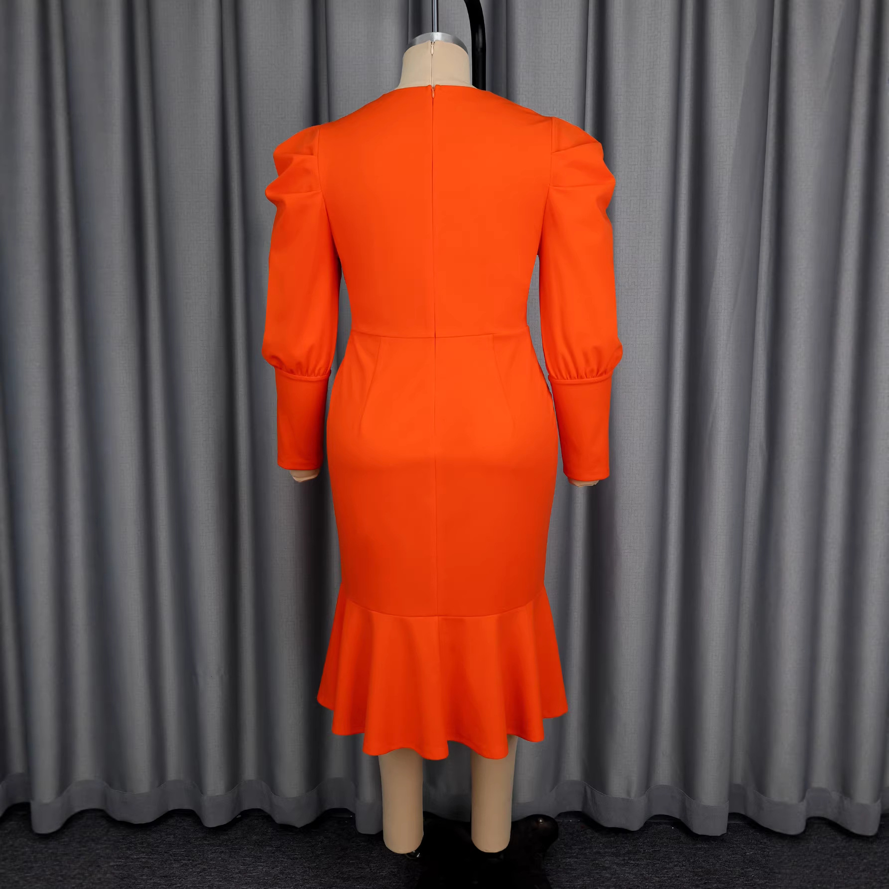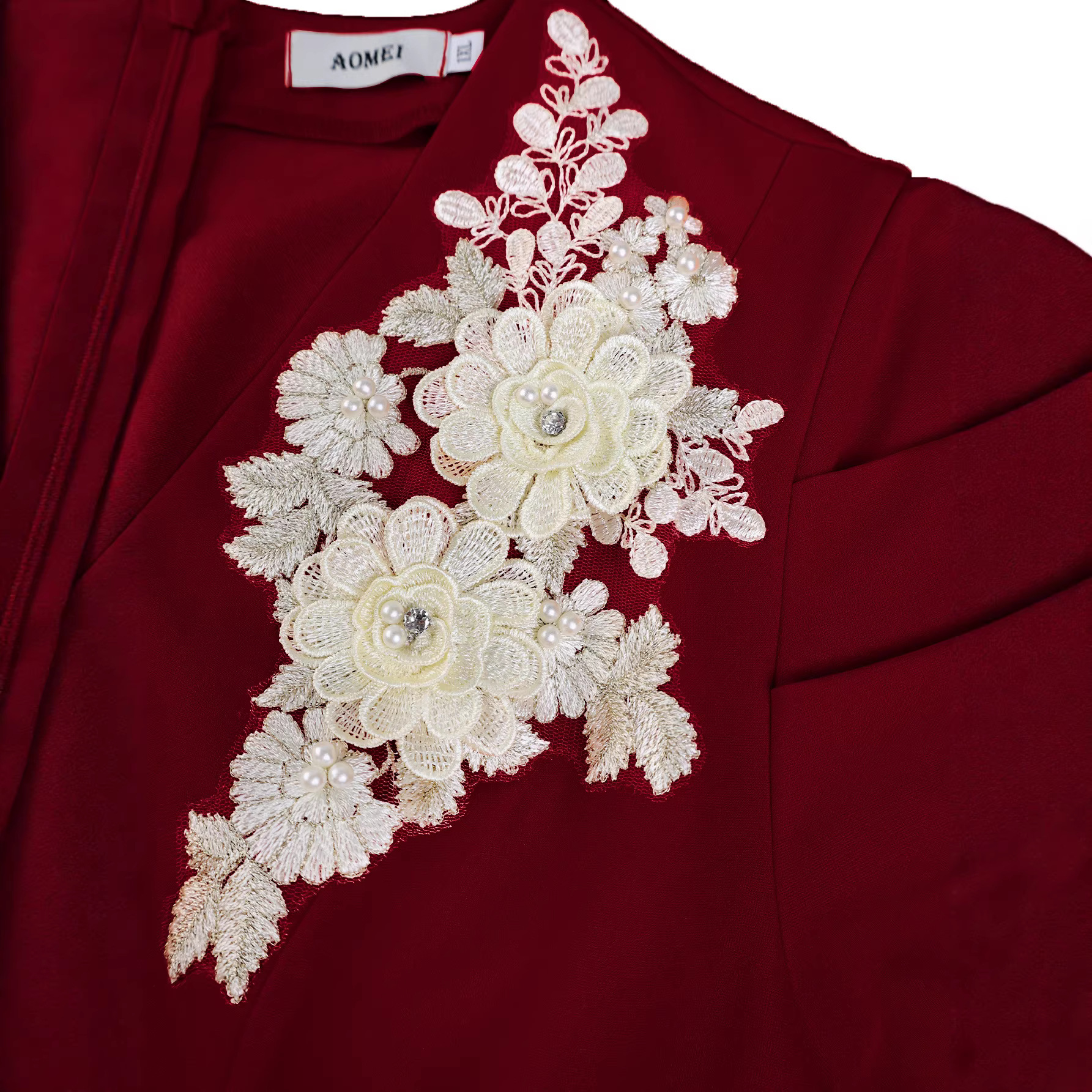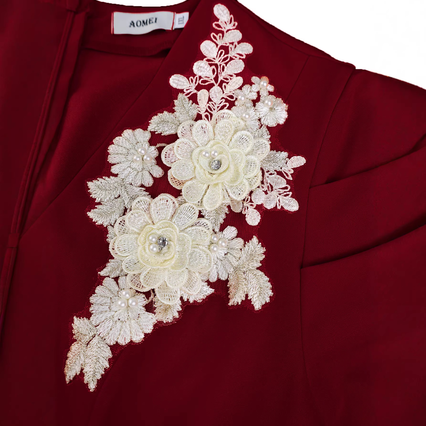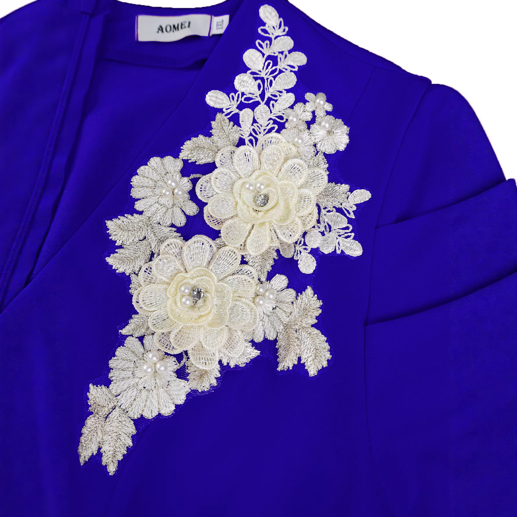 Fashion Elements: V-neck, Solid Color, Floral Design, Stylish, Defined Waist, Three-Dimensional Embellishments