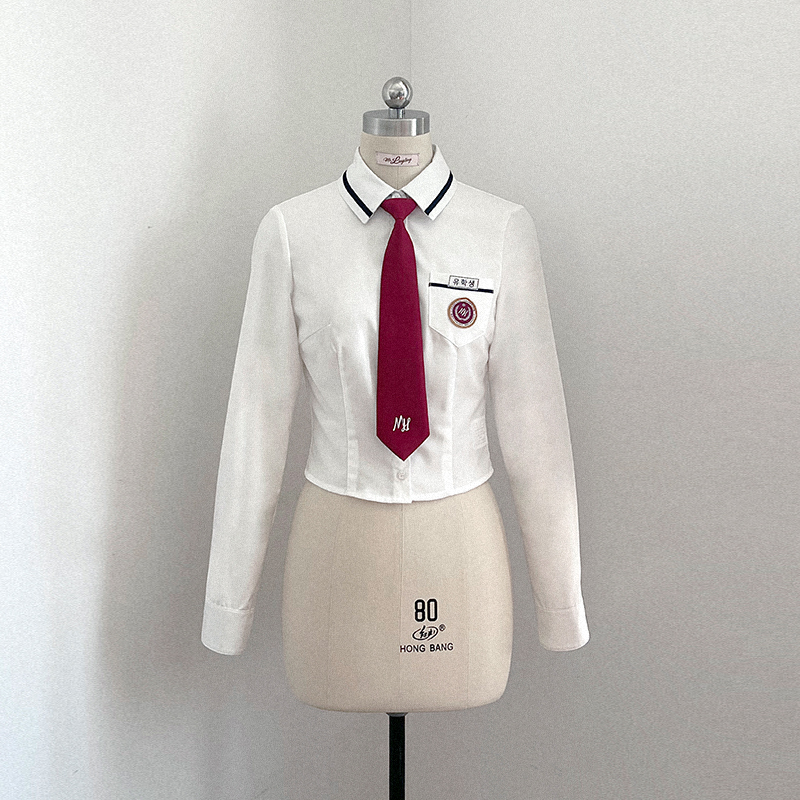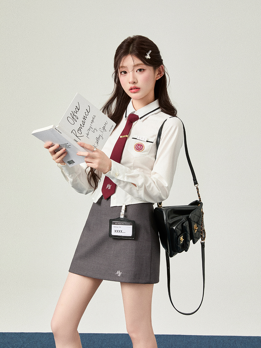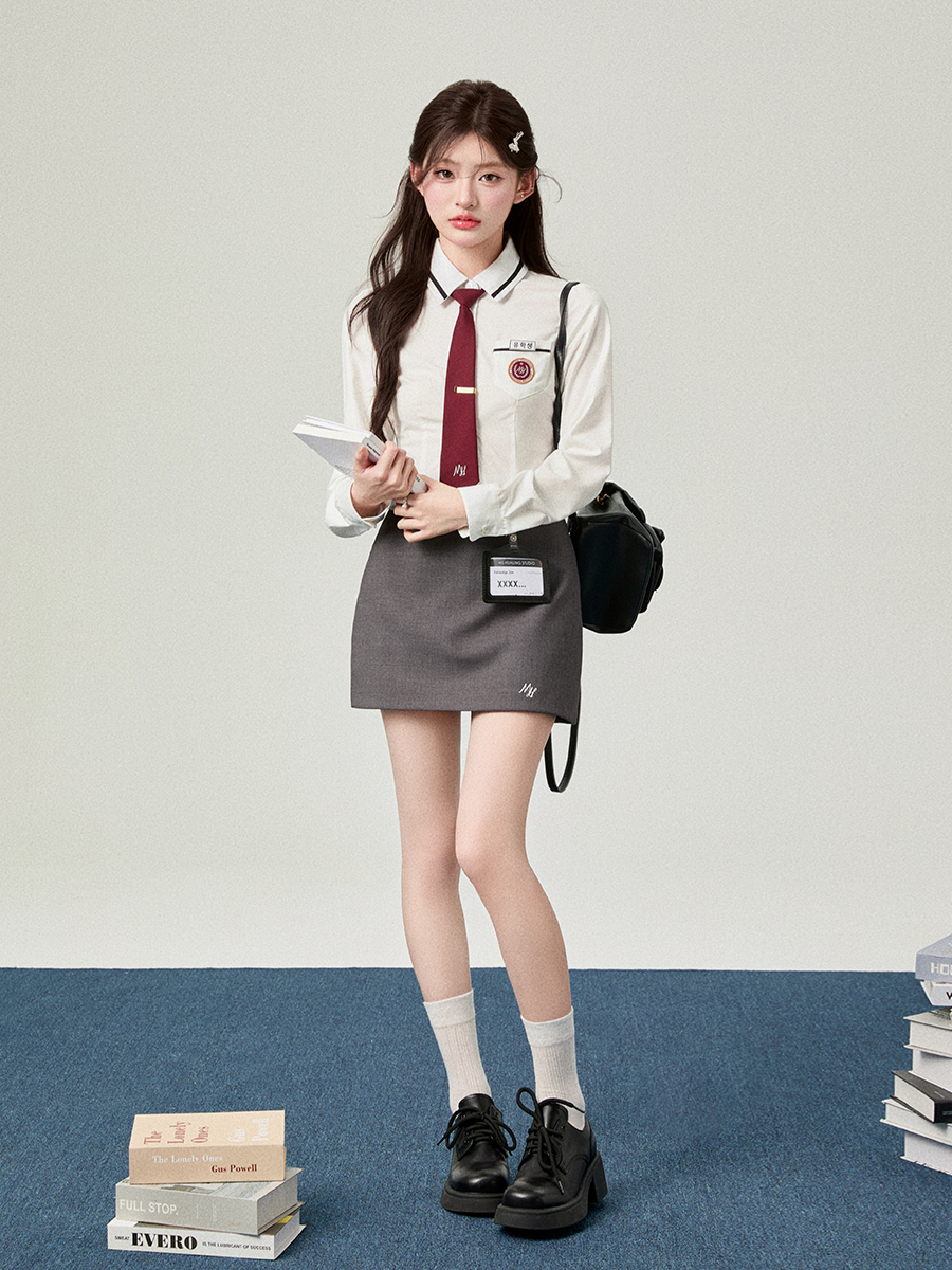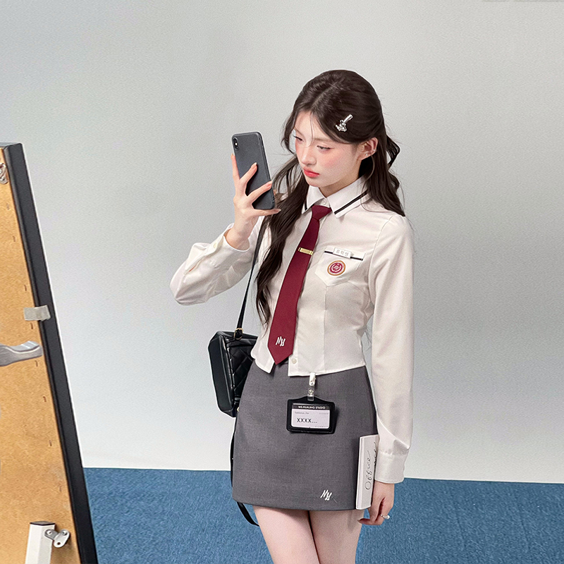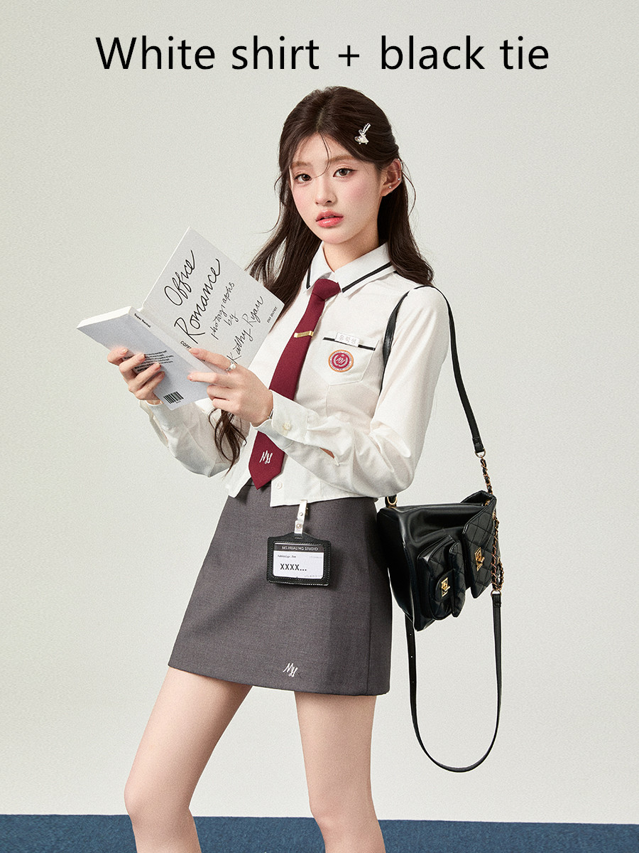 Color classification: white shirt, gray hip skirt, white shirt with black tie