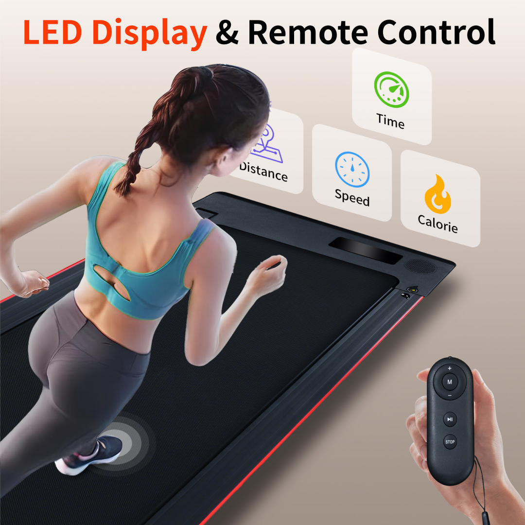 Multi-Functional LED Display & Dual Remote Control Mode: The portable walking pad treadmill features a multi-functional LED screen that displays speed, distance, time, and calories in real time. Adjust speed conveniently using the included remote control. Note: The treadmill’s audio port is for decoration only and does not have speaker functionality.
