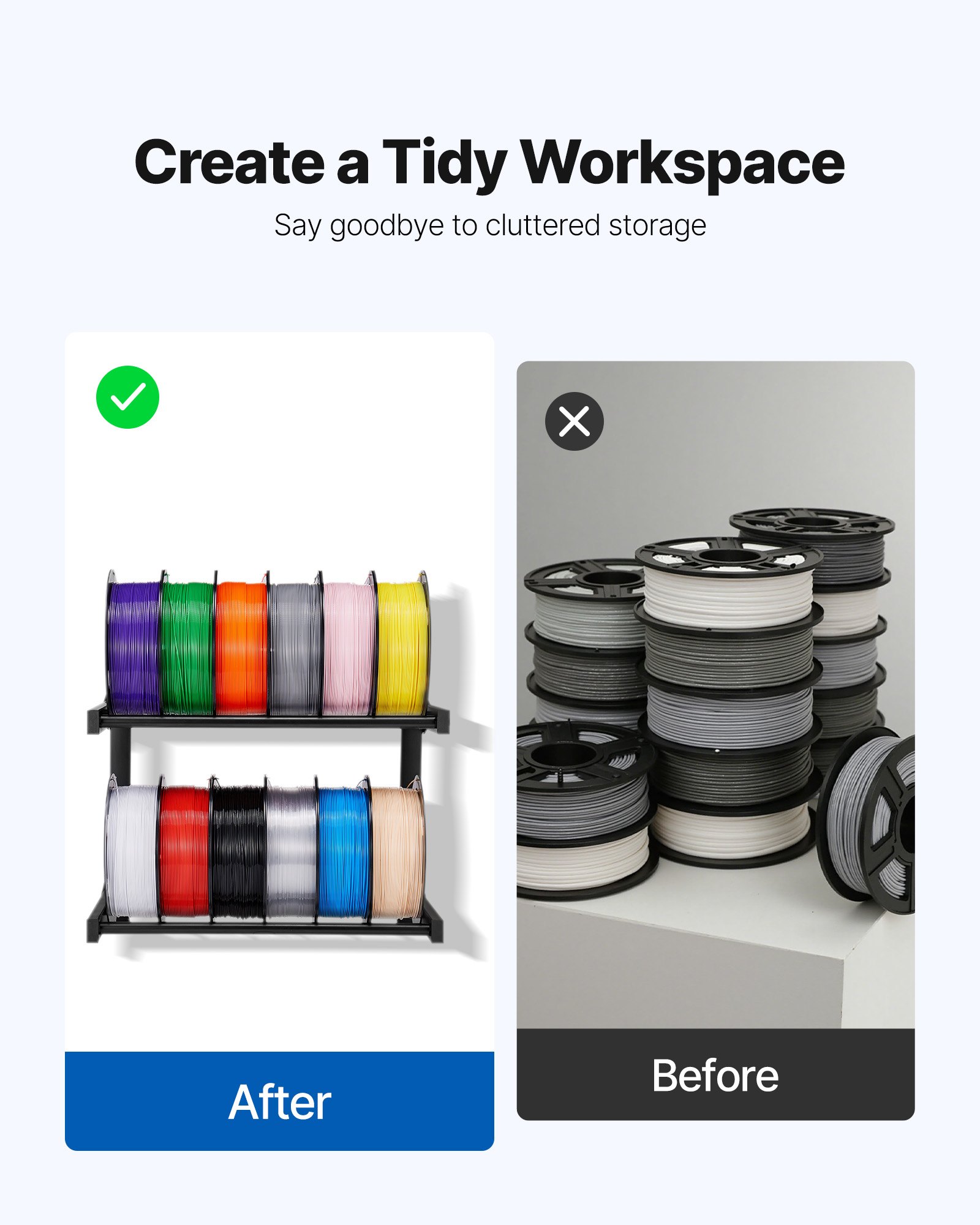 Neat Storage Solution: This wall-mounted filament rack features two tiers, each holding 6 spools, with a total capacity of 12 spools. It keeps your workspace tidy and efficient, making it easy to access your 3D materials when you need them