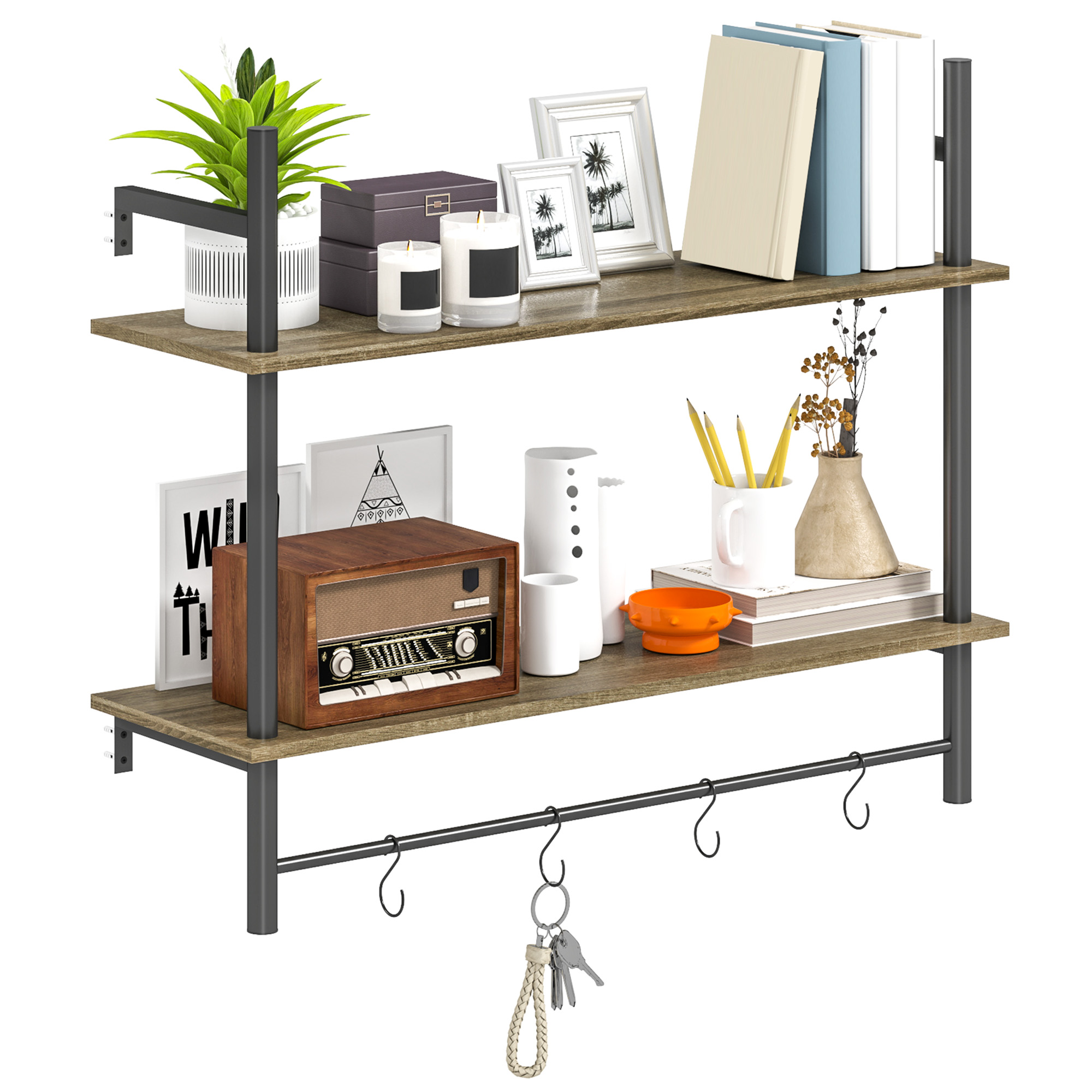 Transform your walls into a stylish and practical display with hanging shelf. The two-tier wall shelves, paired with four snazzy S-shaped hooks, cater to all your storage needs. The chic melamine finish ensures easy cleaning, while the stable build with guardrails adds a layer of safety. Maximise space effortlessly with this sleek wall shelf unit!