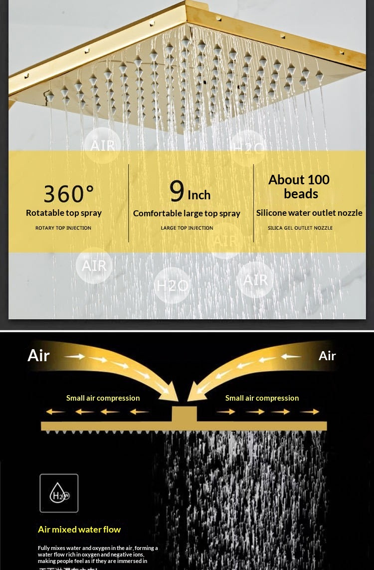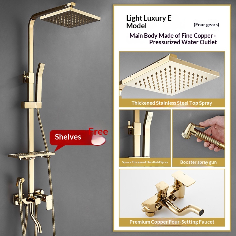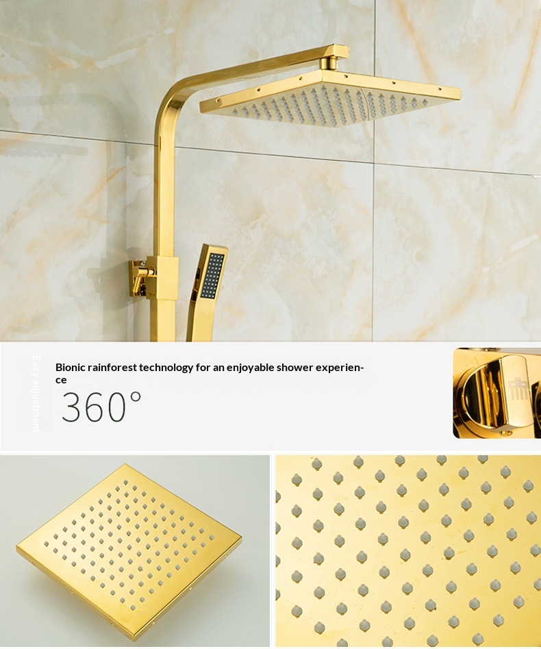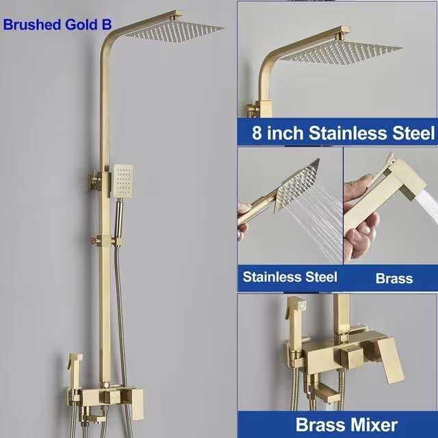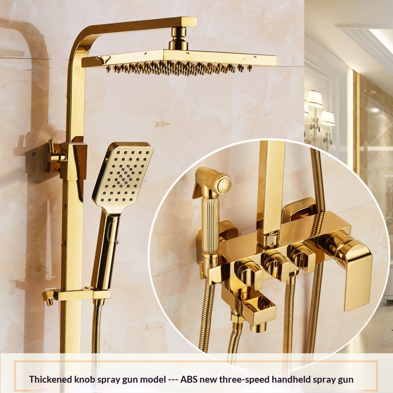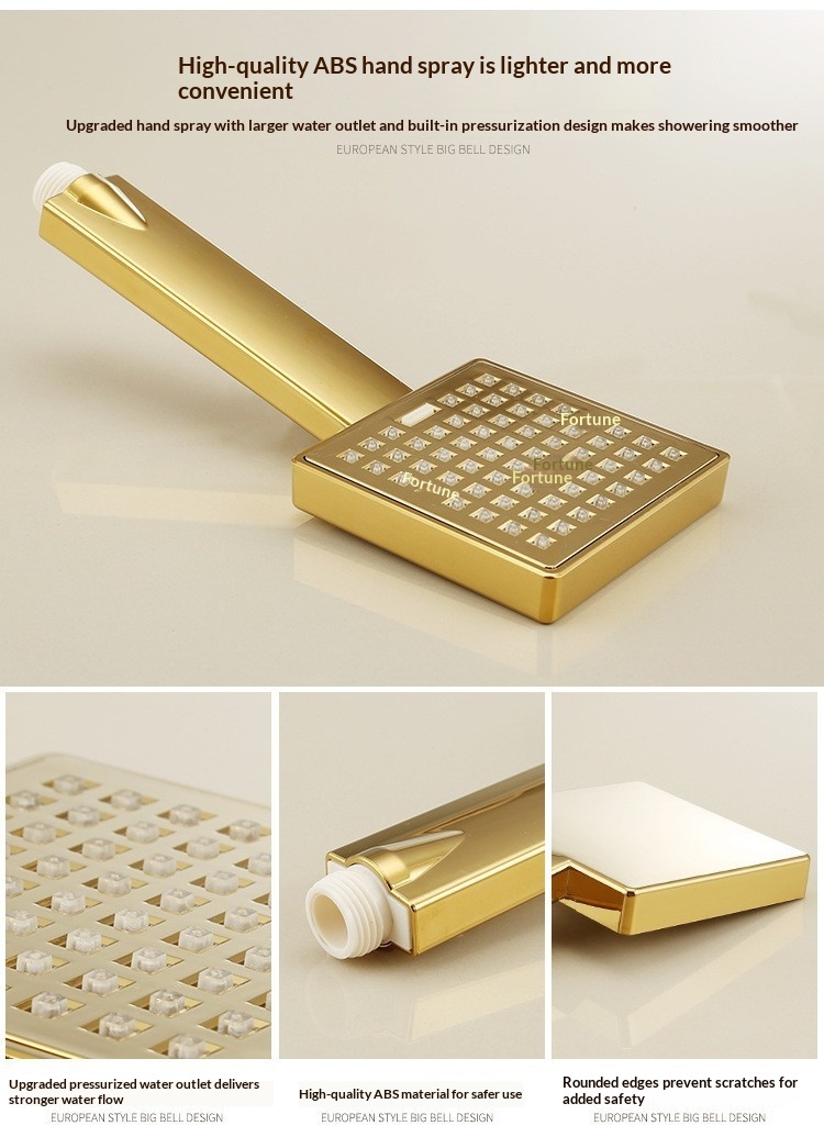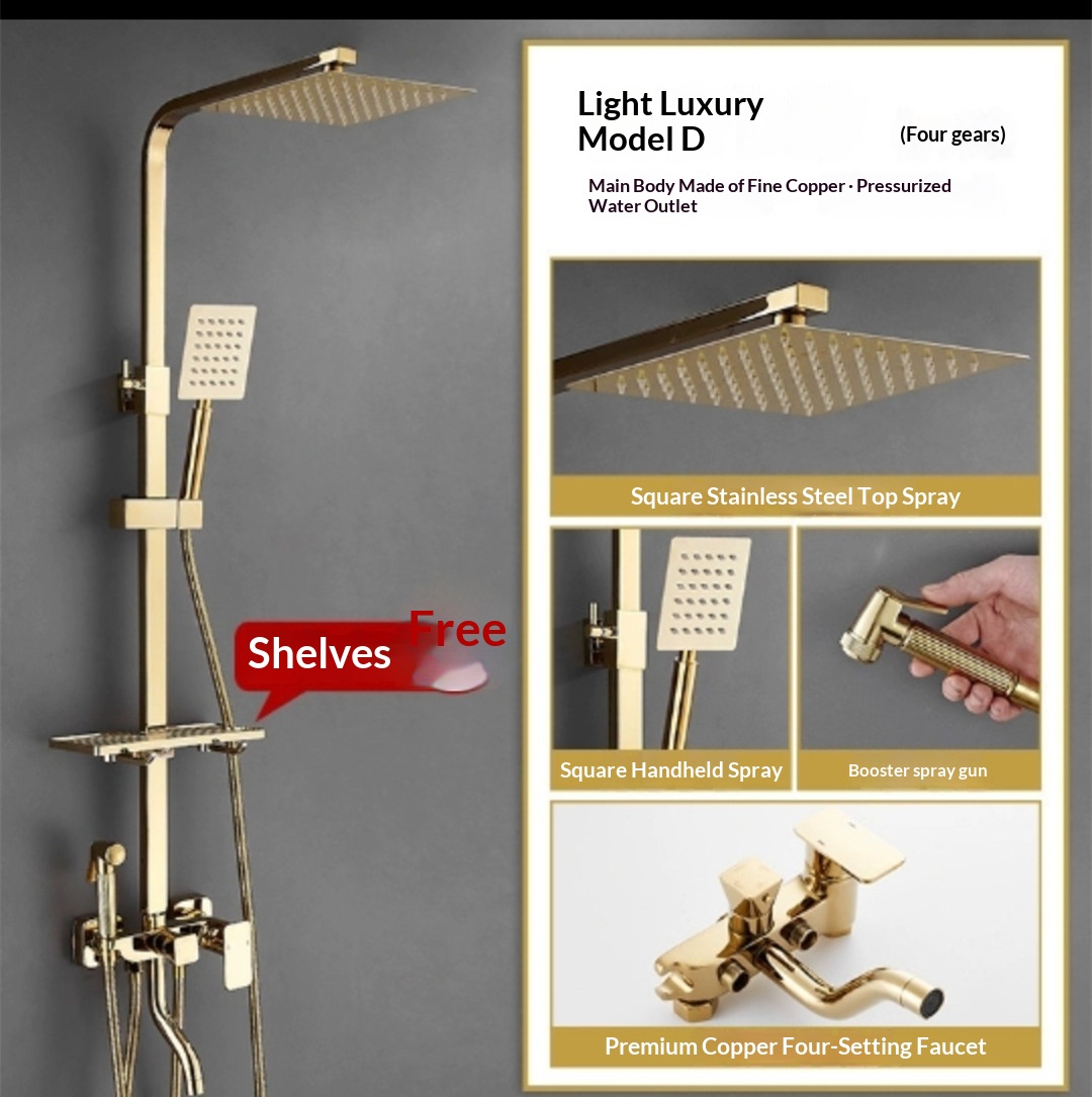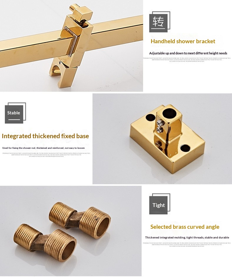 Specifications: Gold three-setting showerhead, Gold four-setting showerhead B1, Gold four-setting push-button showerhead, Gold knob-operated showerhead A1, Gold knob-operated showerhead A2, Gold four-setting showerhead B2, Gold mid-cross four-setting showerhead B3, Gold mid-cross four-setting showerhead B4