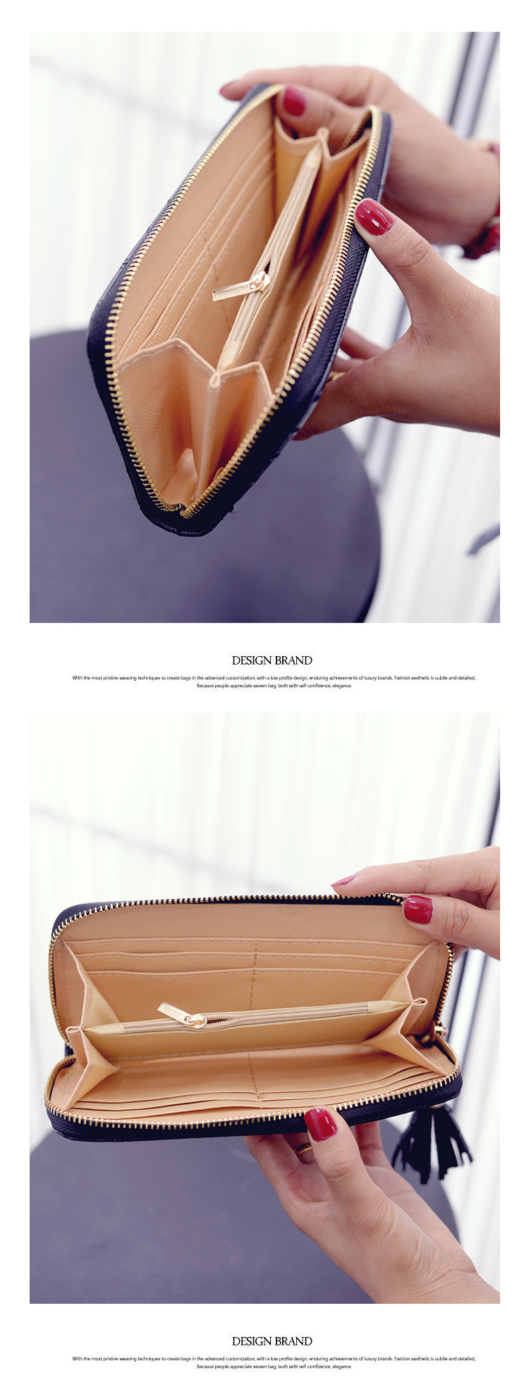 The internal structure of the small bag: zipper, banknote clip, card position, change position, document position