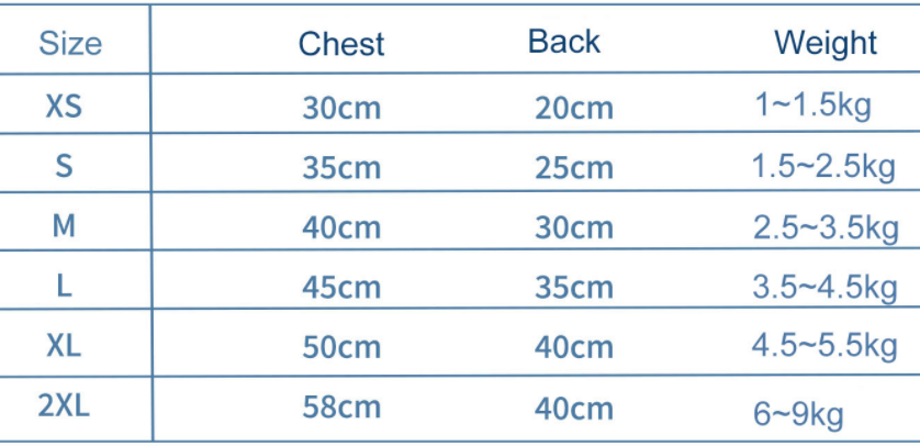 Size: XS (chest circumference 30 back length 20cm), S (chest circumference 35 back length 25cm), M (bust circumference 40 back length 30cm), L (chest circumference 45 back length 35cm), XL (bust circumference 50 back length 38cm), 2XL (bust circumference 58 back length 40cm)
