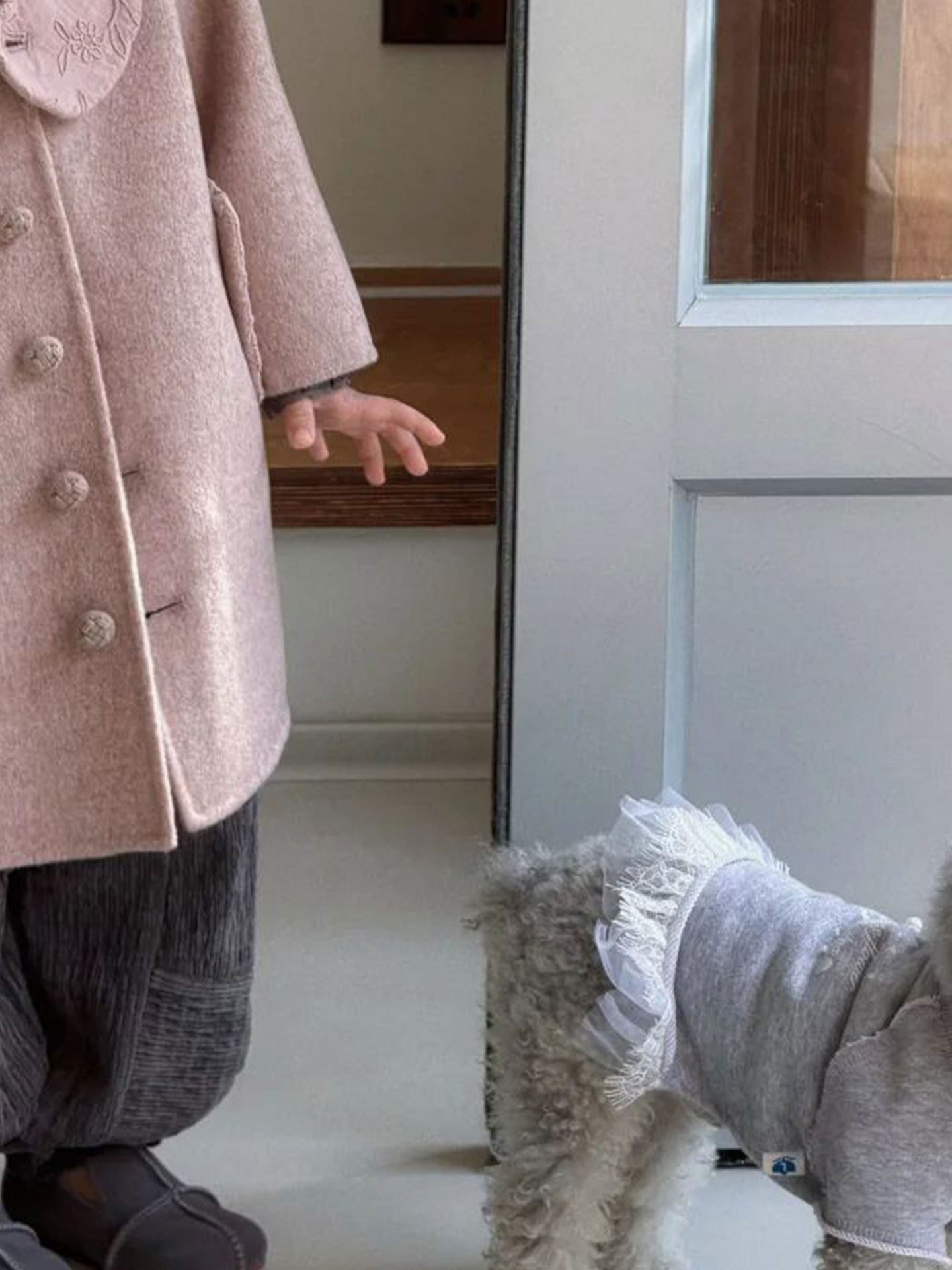 Color options: Pink wool coat, dark gray trousers