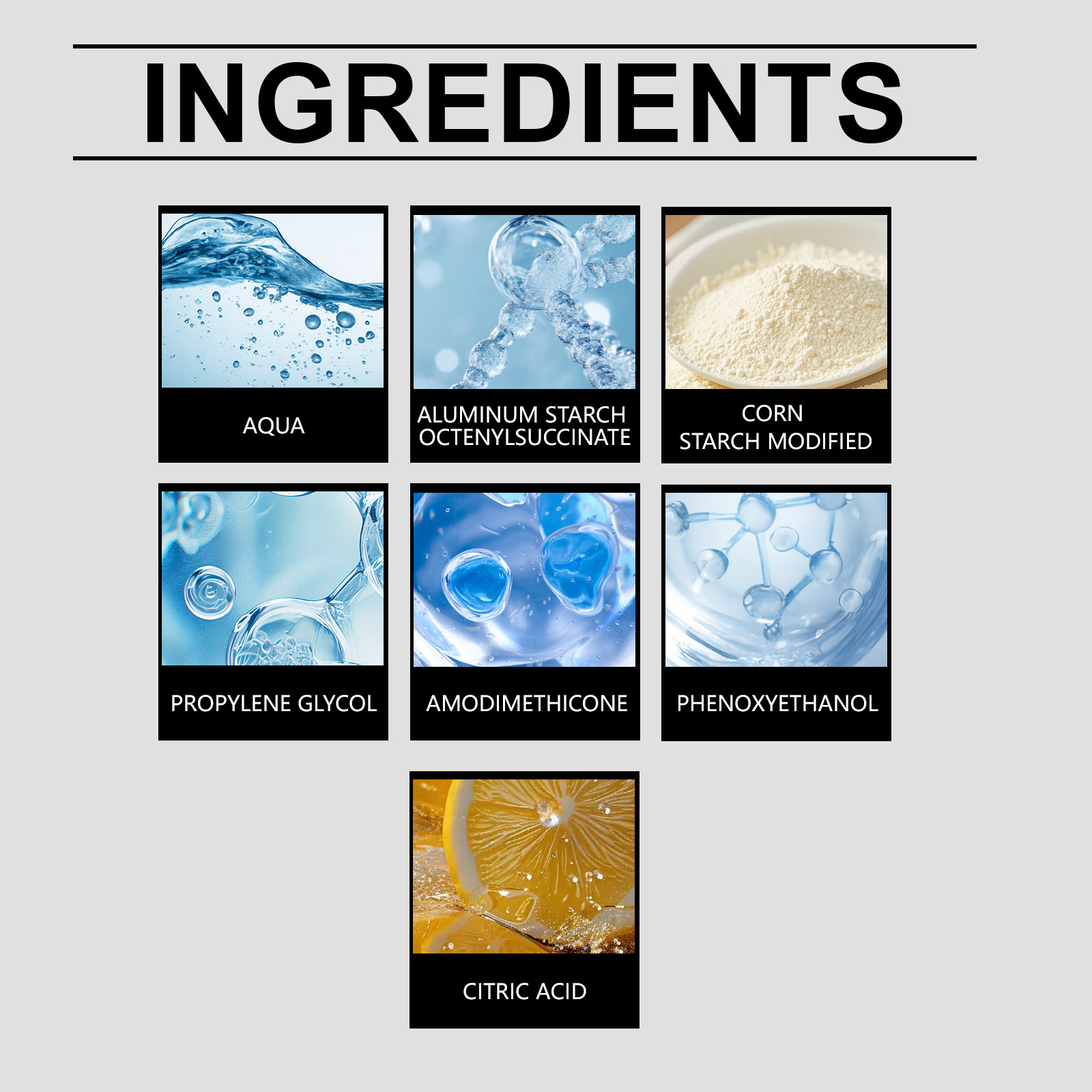 Ingredients: water, starch octenyl aluminum succinate, modified corn starch, propylene glycol, ammonia-terminated polydimethylsiloxane, phenoxyethanol, citric acid.
