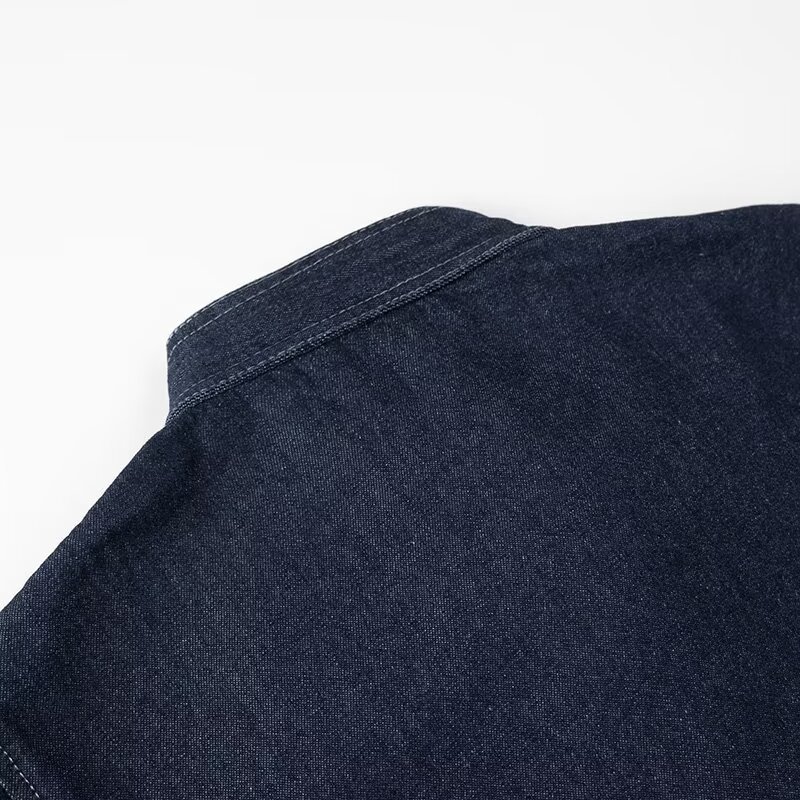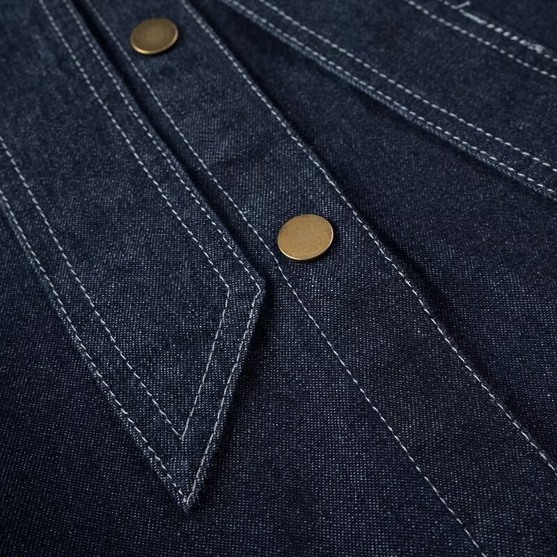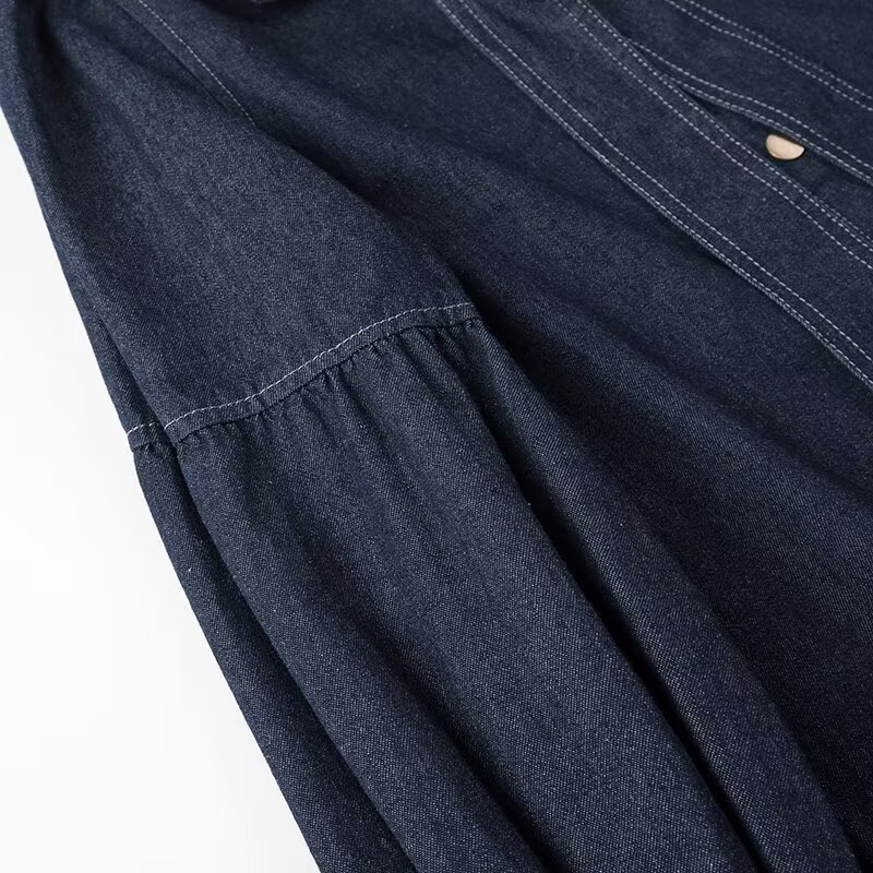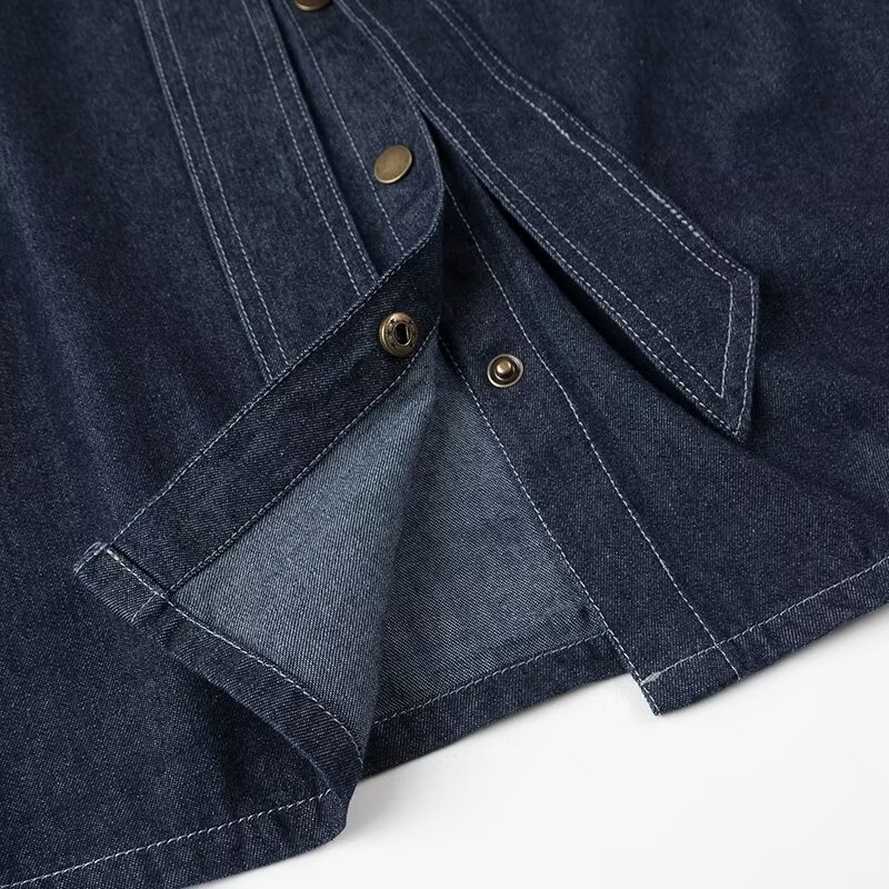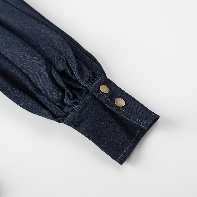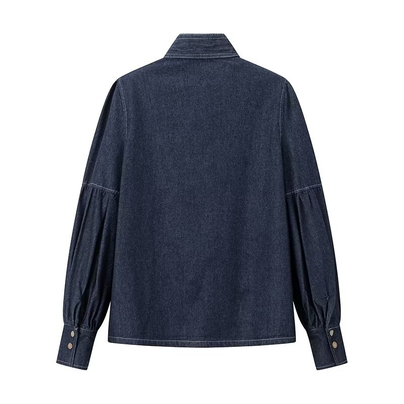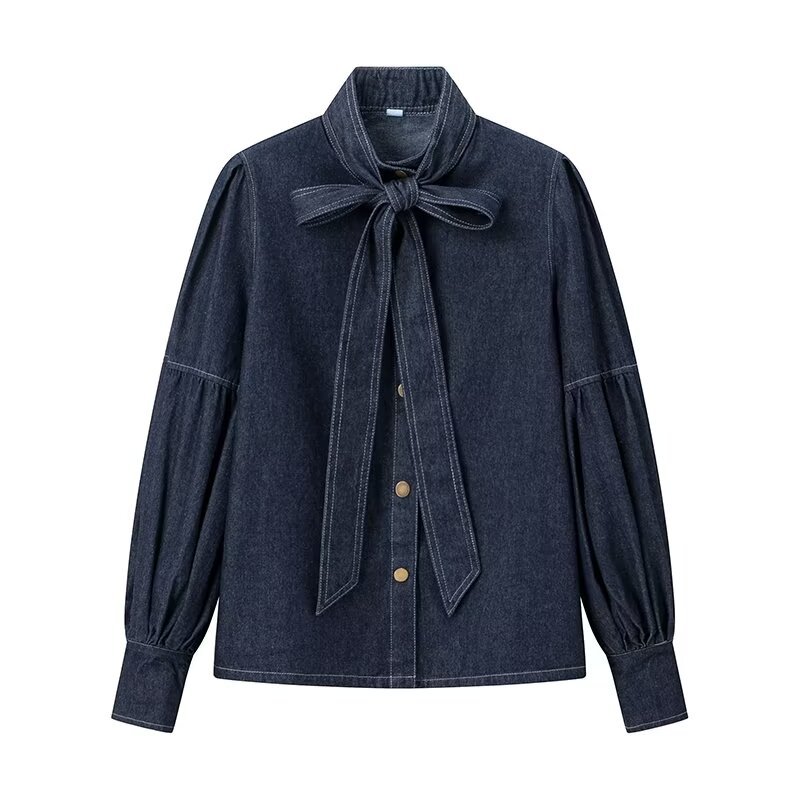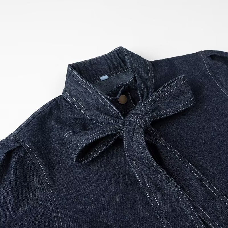 Washed Dark Blue Casual All-match Lace-up Bow Denim Shirt