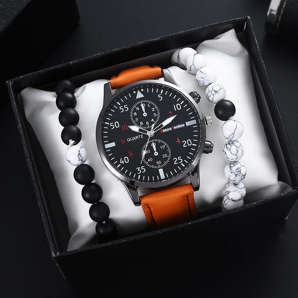 Color: Brown belt watch + black and white double beads + box, black belt watch + black and white double beads + box, brown belt alone watch, black belt alone watch, black and white double beads