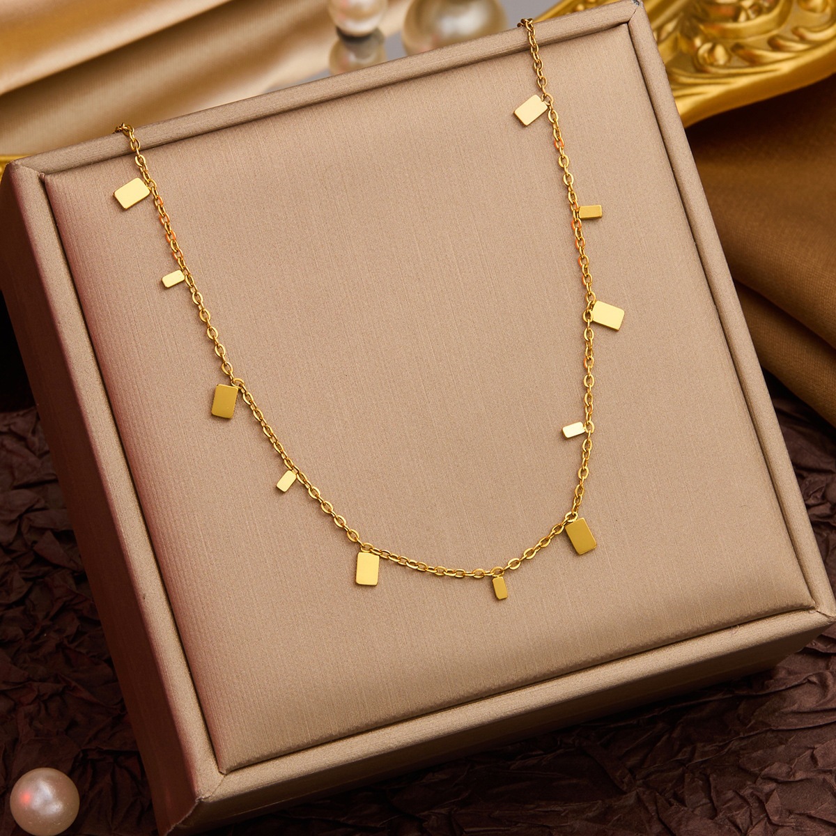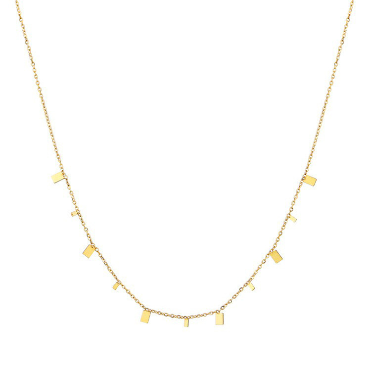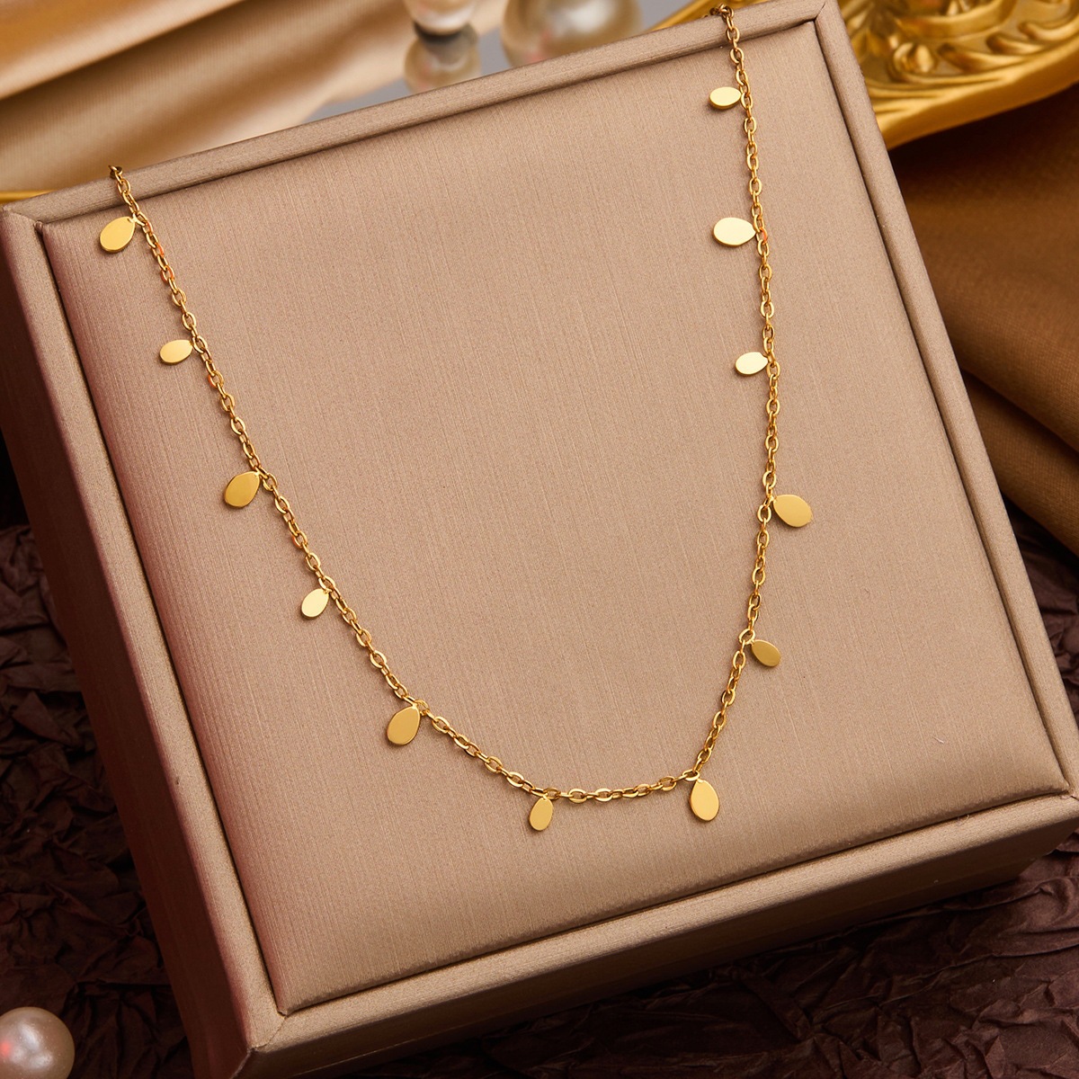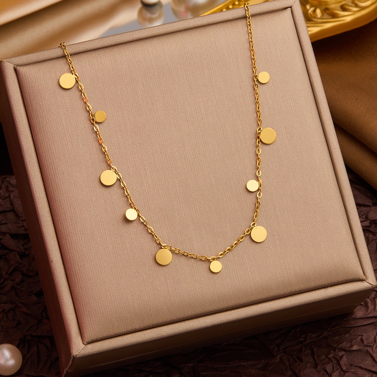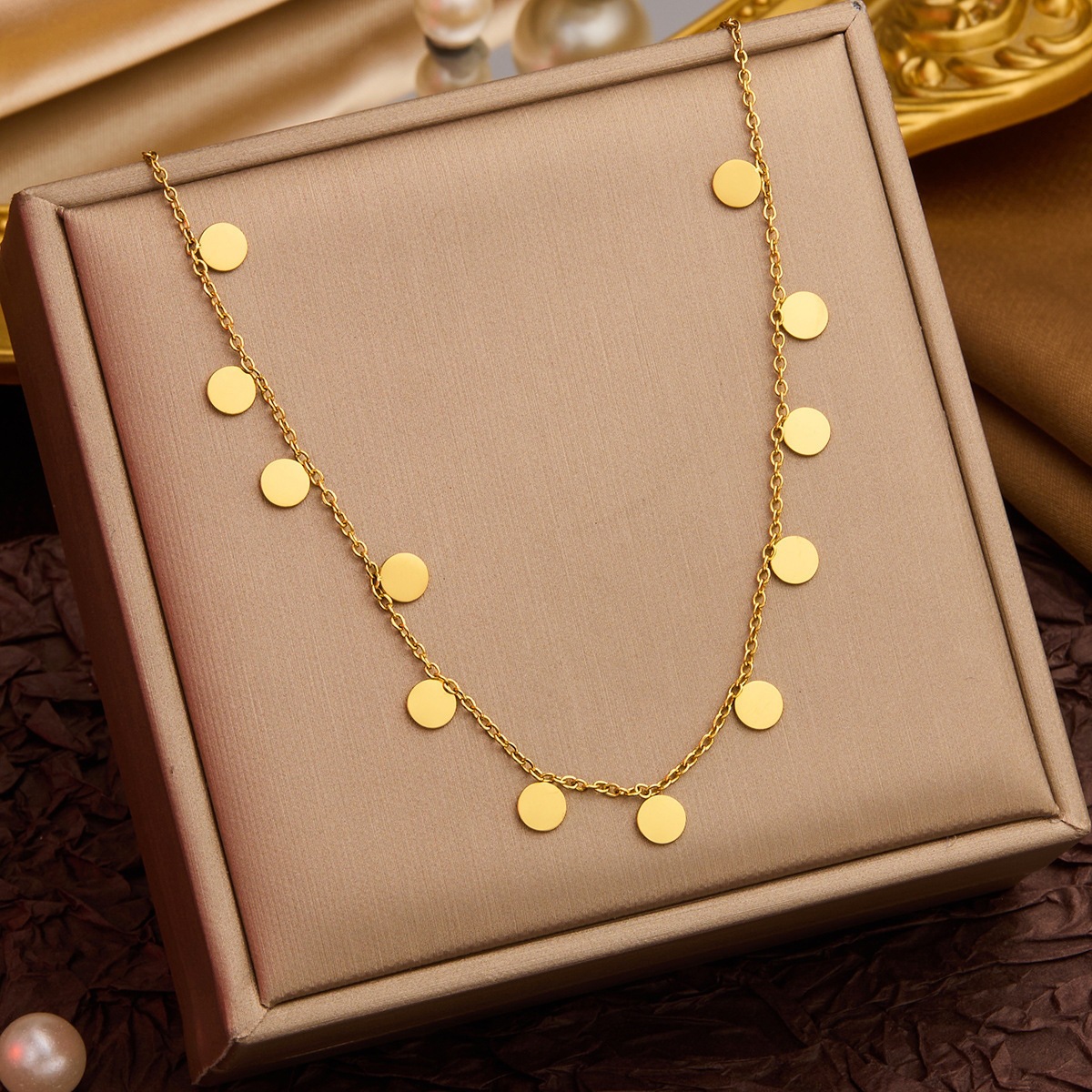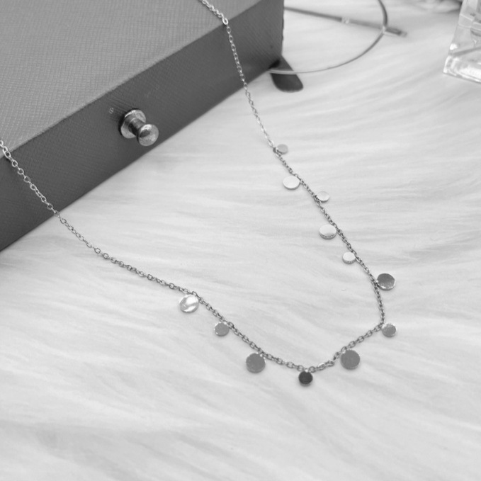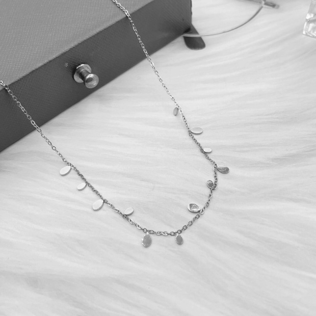 Colors: XL8010J Large and Small Disc Necklace — Gold; XL8010Y Large and Small Disc Necklace — Steel Color; XL8011J Large and Small Water Drop Necklace — Gold; XL8011Y Large and Small Water Drop Necklace — Steel Color; XL8012J Large and Small Square Disc Necklace — Gold; XL8012Y Large and Small Square Disc Necklace — Steel Color; XL8013J Twelve Disc Necklace — Gold