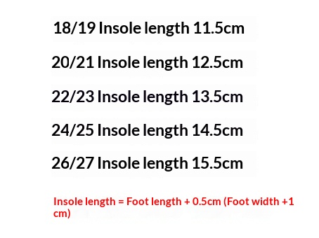 Sizes: 18/19 (inner length 11.5 cm), 20/21 (inner length 12.5 cm), 22/23 (inner length 13.5 cm), 24/25 (inner length cm), 26/27 (inner length cm)