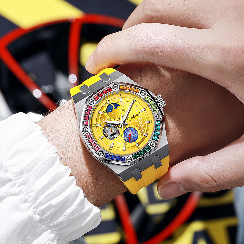 Colors: 6030F stainless steel strap in sunshine orange, 6030F stainless steel strap in light blue, 6030F stainless steel strap in yellow, 6030F rubber strap with black dial, 6030F rubber strap in light blue, 6030F rubber strap in sunshine orange, 6030F rubber strap in yellow, 6030F stainless steel strap with black dial