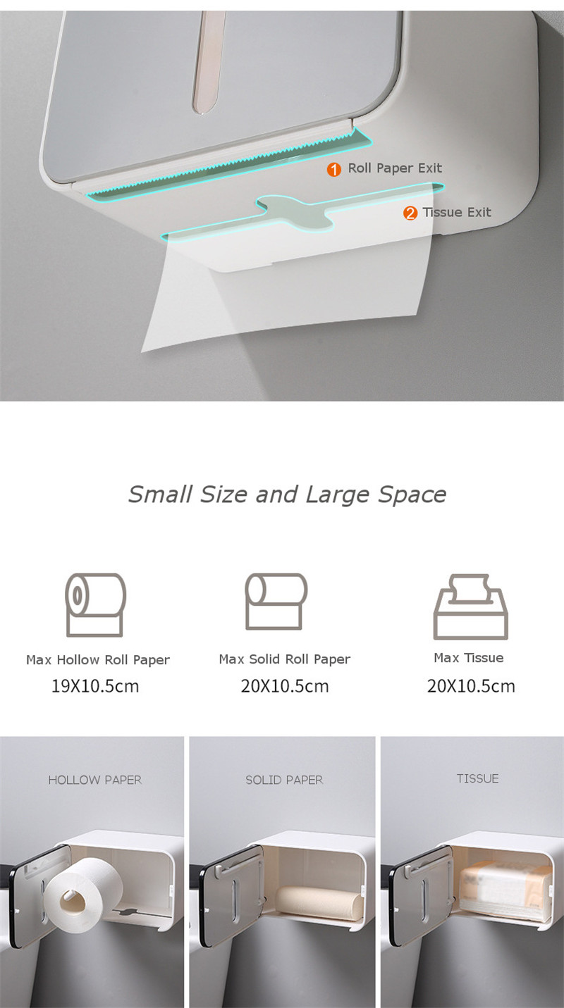 It is simple appearance, rod-type paper, double paper exit, large storage, one-button opening, nail-free wall hanging, transparent window and waterproof and moisture proof.