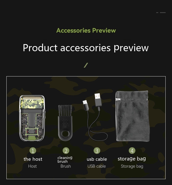 Razor * 1+cleaning brush * 1+USB cable * 1+storage bag * 1