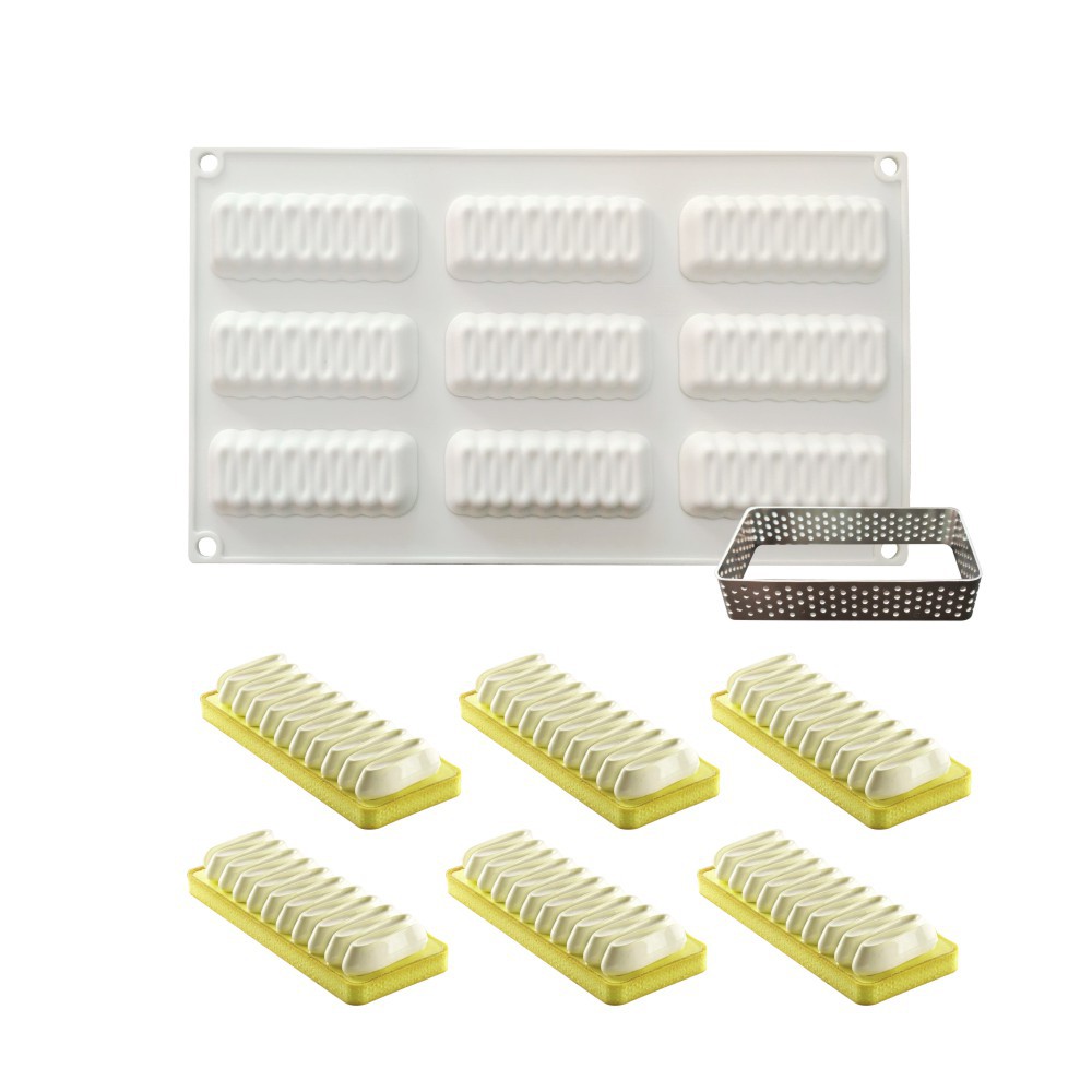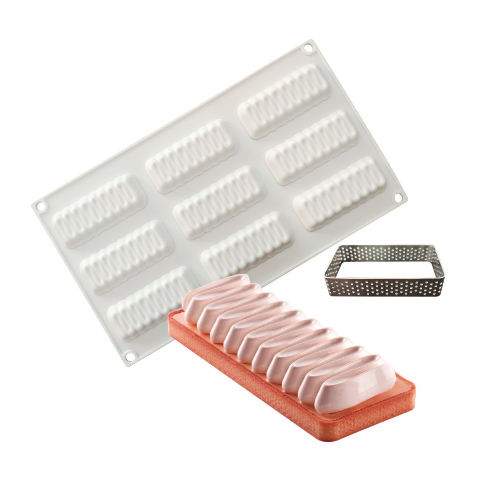 El kit está compuesto por dos elementos: anillos en material termoplástico compuesto a prueba de golpes adecuado para hornear y crear la base y un molde de silicona hecho para hacer una espuma o una crema para colocar sobre la masa corta. Los anillos son antiadherentes y de acero inoxidable, permiten la cocción homogénea y se caracteriza por una alta estabilidad térmica. La tarta creada con el Kit Tarte anillo oblongo se confirma como un perenne cuya modernity clásica te permitirá disfrutar de la sorpresa.