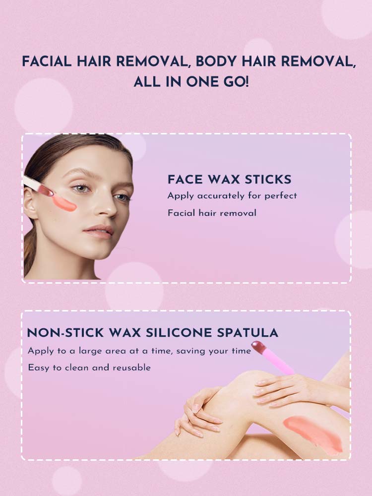 What's Inside: 1. Portable 200cc Wax Warmer for convenient heating 2. Smooth & Silky Wax Beans (50g*2) for effective hair removal 3. Food Grade Non-Stick Silicone Bowl for easy after wax cleaning 4. Non-Stick Wax Silicone Spatula for body application 5. 5 Face Wax Sticks for detailed facial grooming 6. User Guide for hassle-free setup and usage tips.