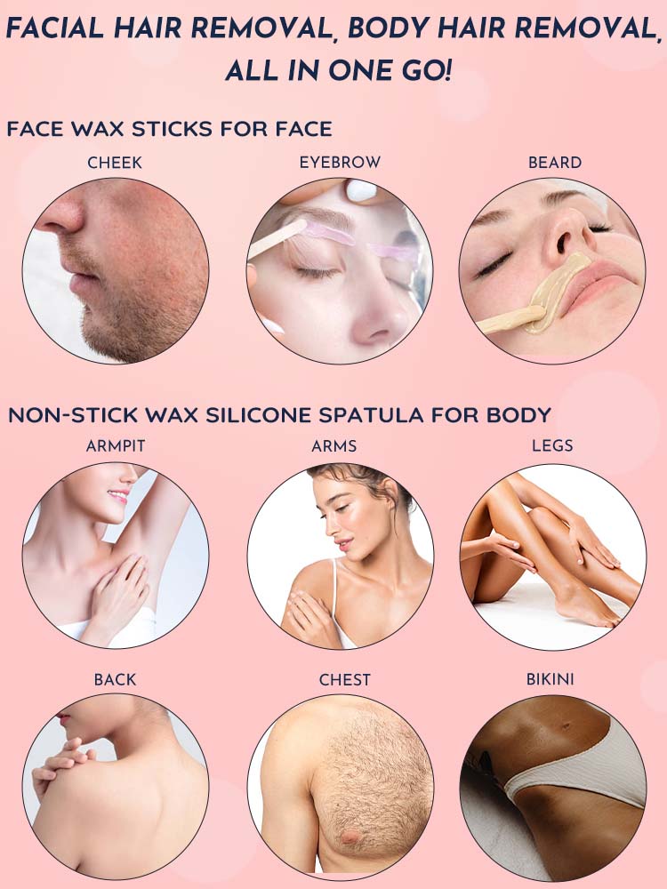 What's Inside: 1. Portable 200cc Wax Warmer for convenient heating 2. Smooth & Silky Wax Beans (50g*2) for effective hair removal 3. Food Grade Non-Stick Silicone Bowl for easy after wax cleaning 4. Non-Stick Wax Silicone Spatula for body application 5. 5 Face Wax Sticks for detailed facial grooming 6. User Guide for hassle-free setup and usage tips.