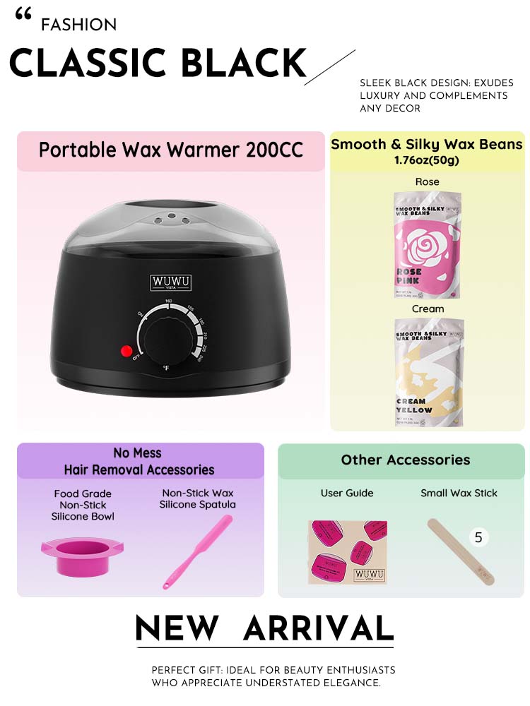 Discover the WUWUVISTA Wax Beads Kit for effortlessly smooth, hair-free skin wherever you go! This all-inclusive kit ensures a gentle yet powerful hair removal experience, suitable for all hair types from fine to coarse, and even sensitive skin.