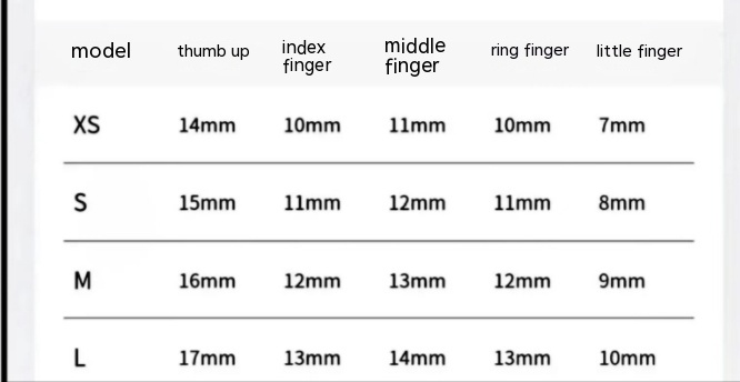 Specifications: ultra-small XS, small size S, medium M, large L
