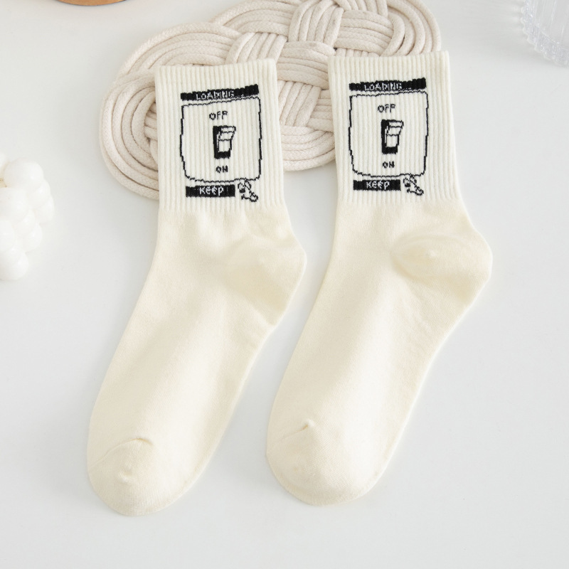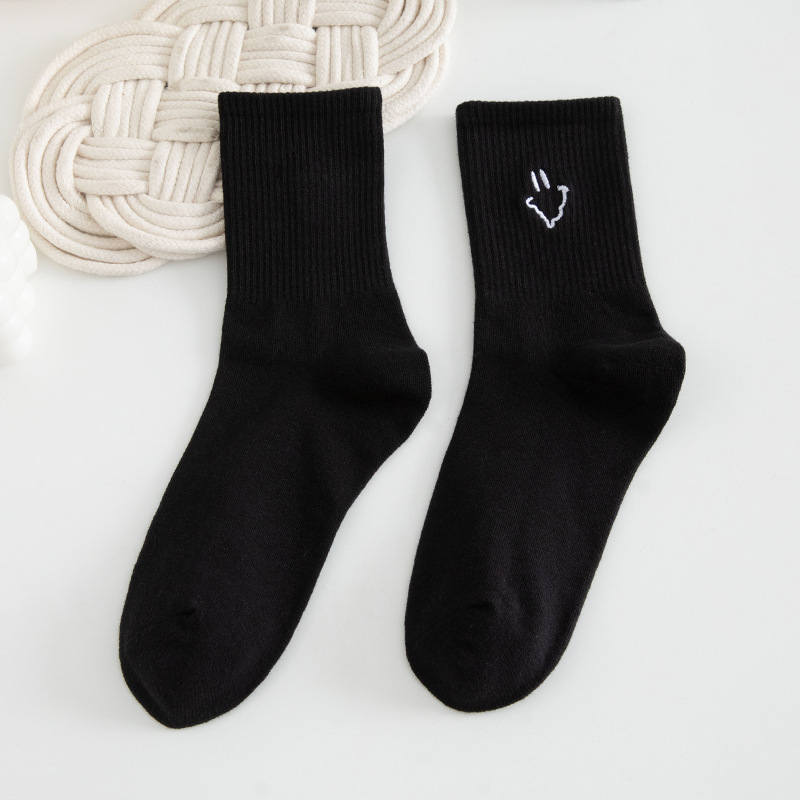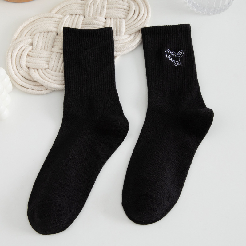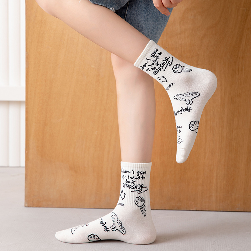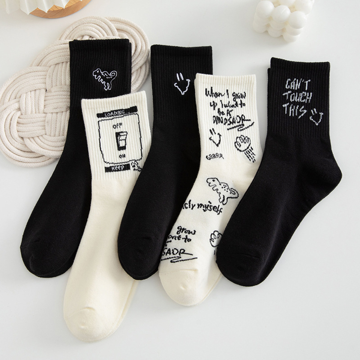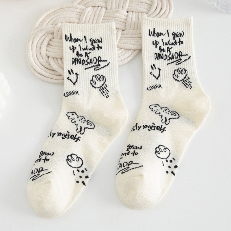 Color: black smiley face letter, black smiley face, black little dinosaur, white graffiti, white button