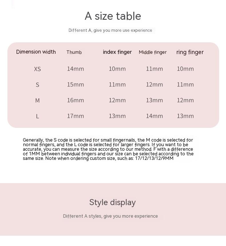Color classification: extra small XS [including five sets], small size S [including five sets], medium M [including five sets], large L [including five sets]]