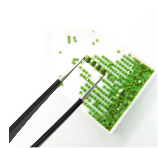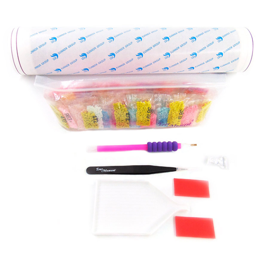 Canvas, rhinestones, bag, tweezers, plates, pens and glue.