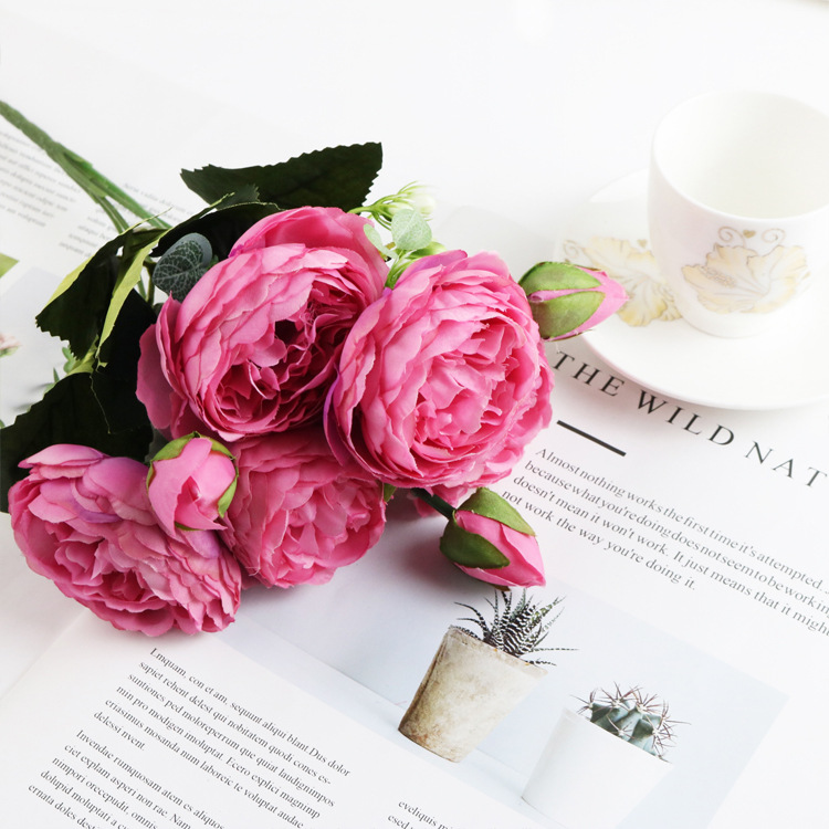 1 bundle Silk Peony bouquet home decoration accessories wedding Party scrapbook fake plants diy pompons artificial roses flowers Material: Silk, Plastic Size: flower diameter 6cm, Whole length 30cm Application: wedding, party, home decor Package Includes: 1 bunch flower ( Each bunch has 5 flower heads )