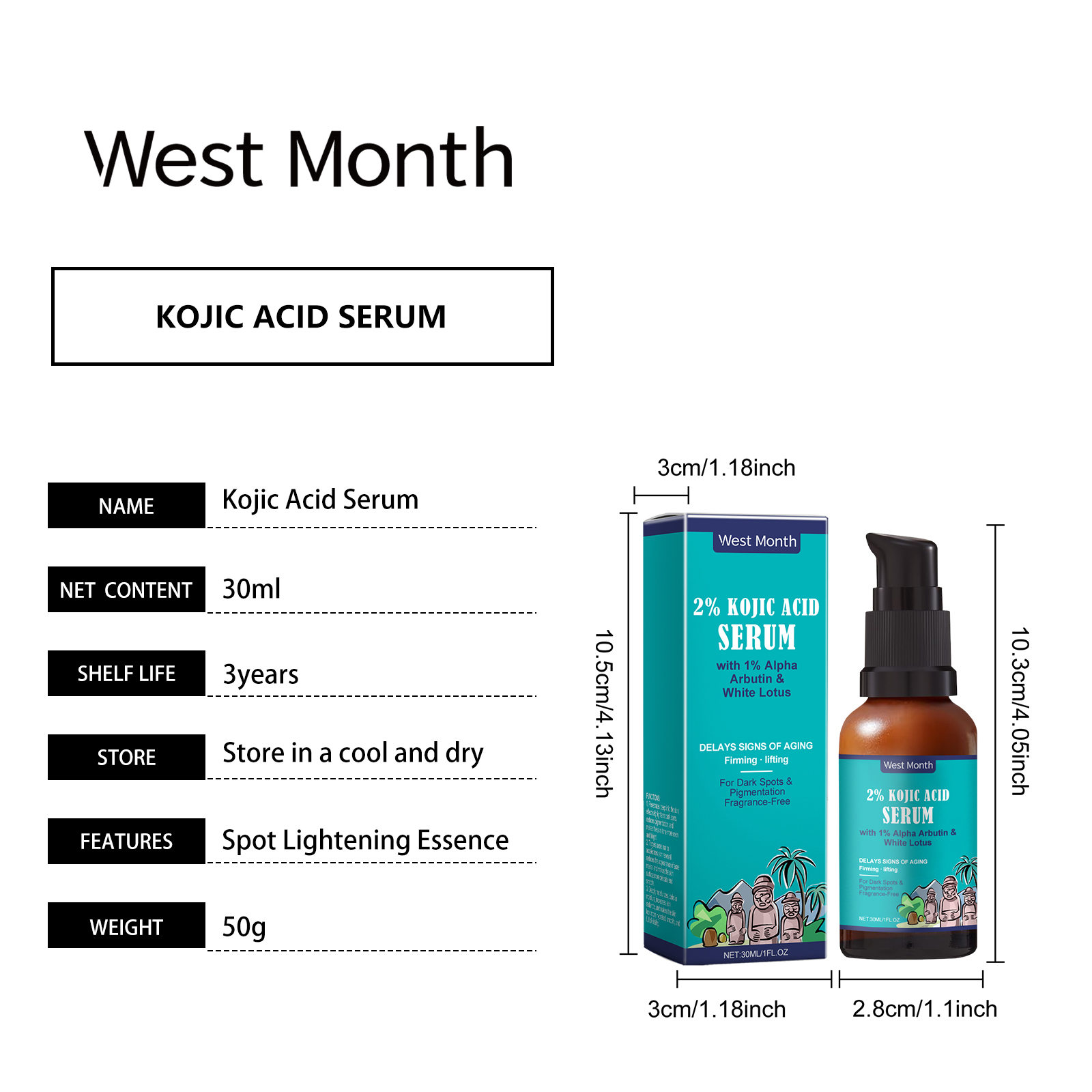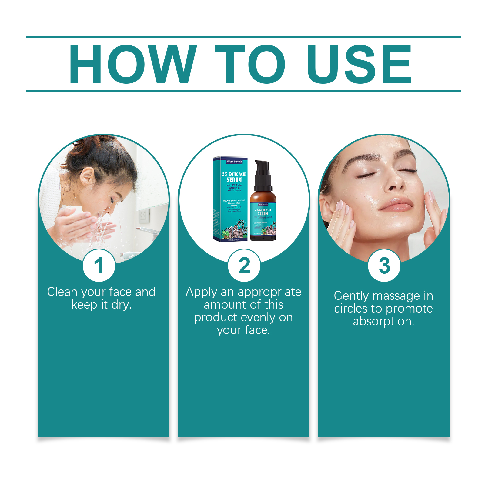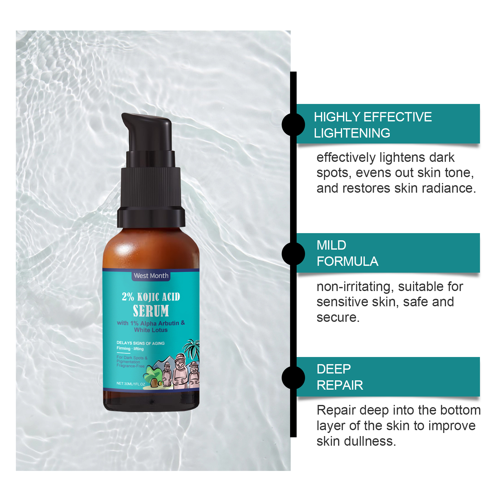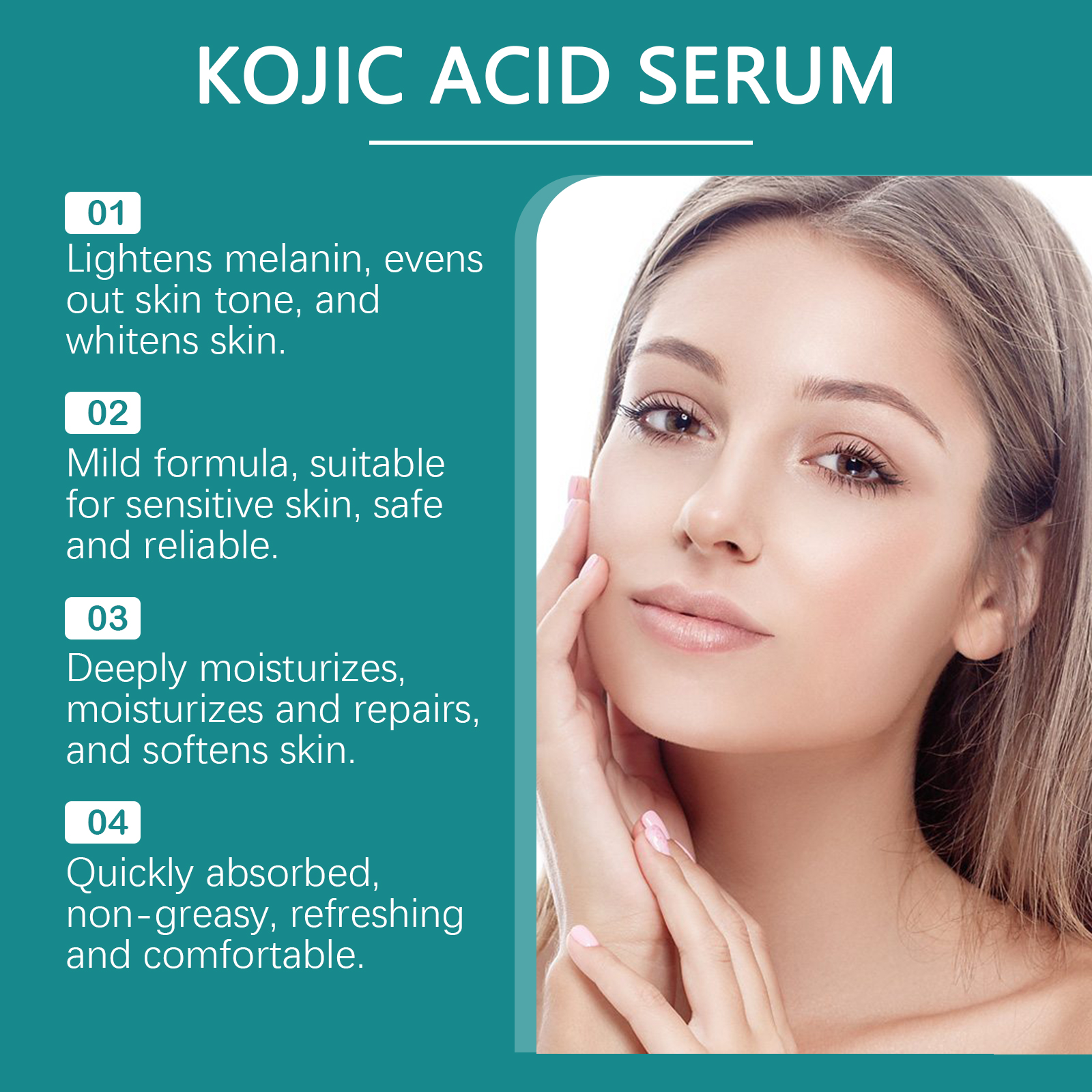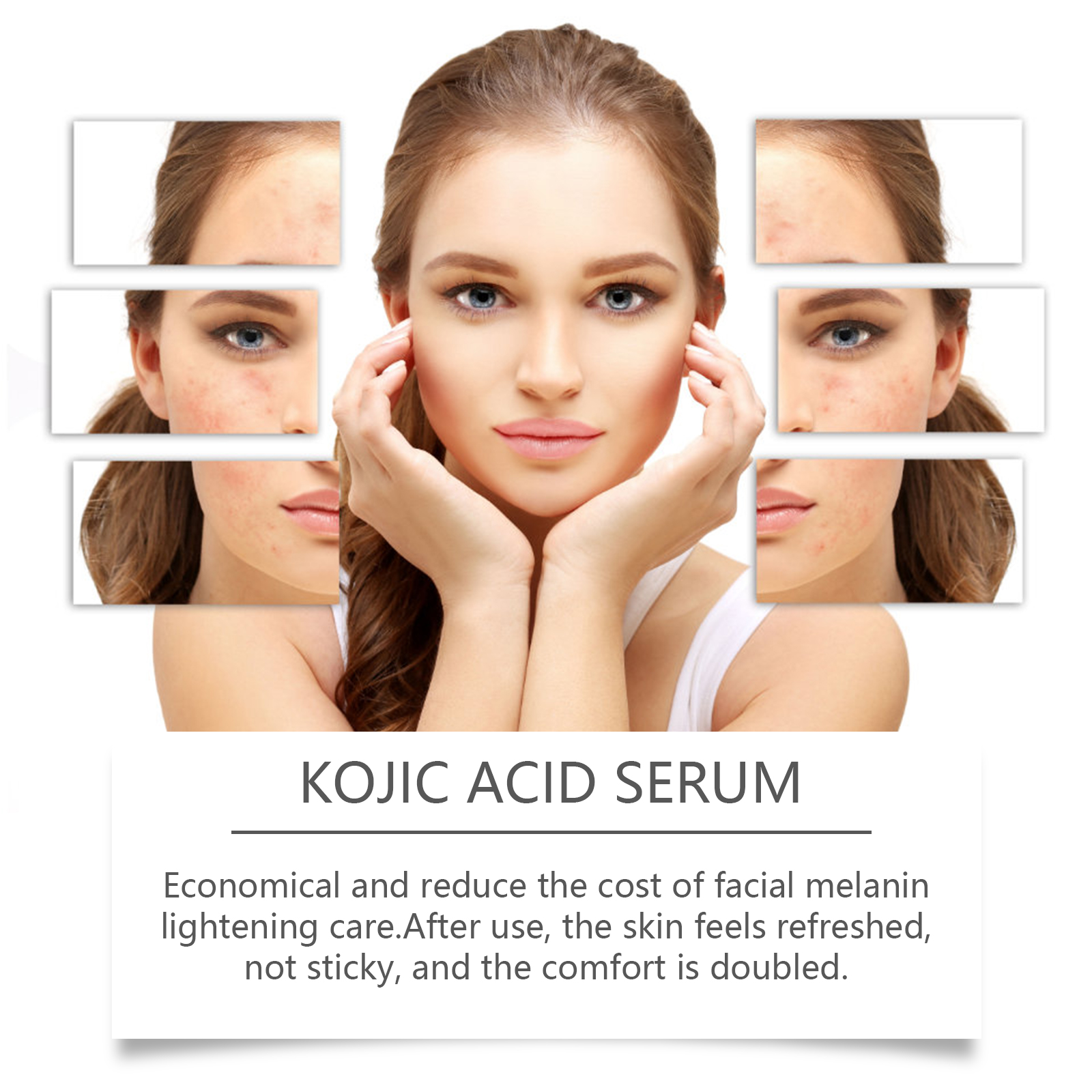 Our Kojic Acid Light Spot Facial Serum contains arbutin and kojic acid, which provides lasting moisture and keeps skin soft and smooth: helps repair damaged skin and enhances skin barrier function. Its use method is very simple: clean your face, keep dry, apply appropriate amount of this product evenly on the face, gently massage in circles to promote absorption. And can improve the texture of the skin, make the skin more delicate and smooth.
