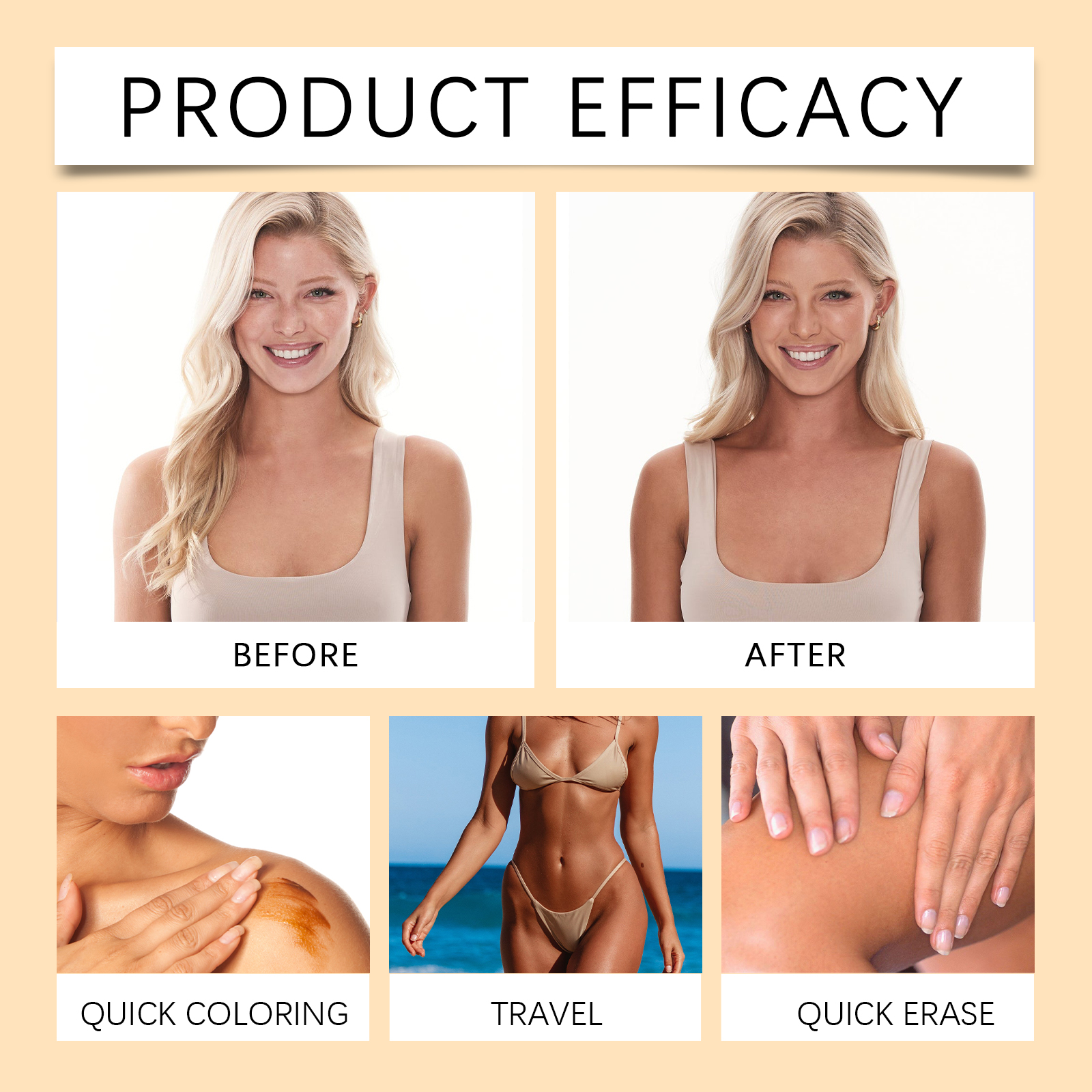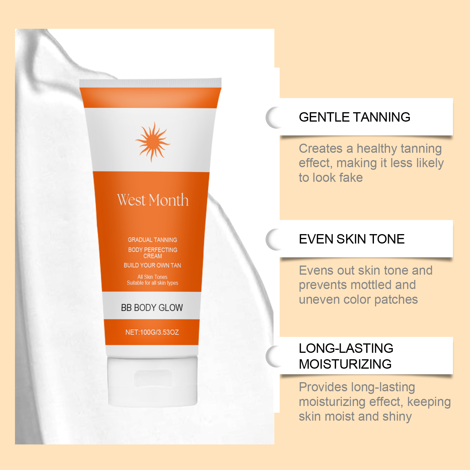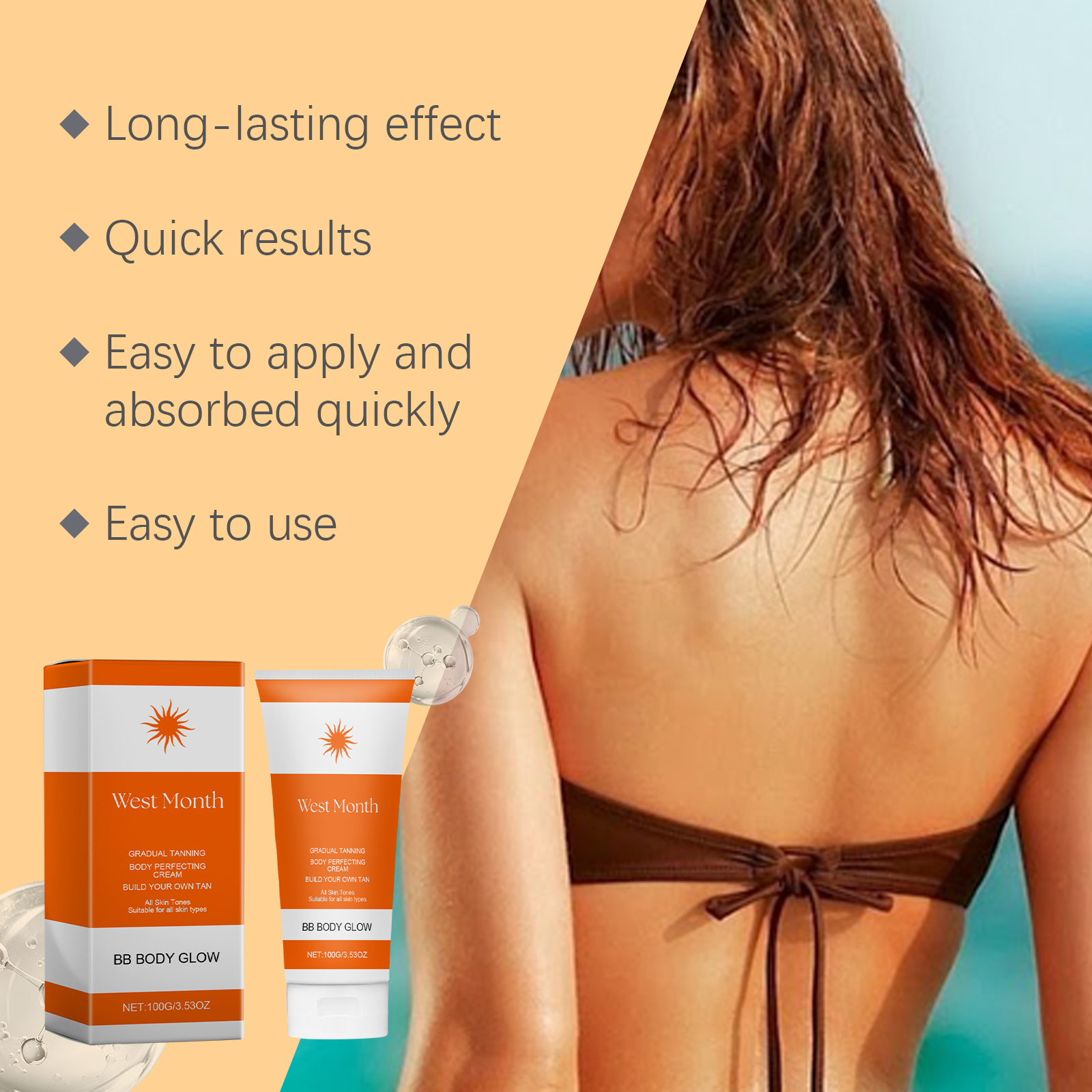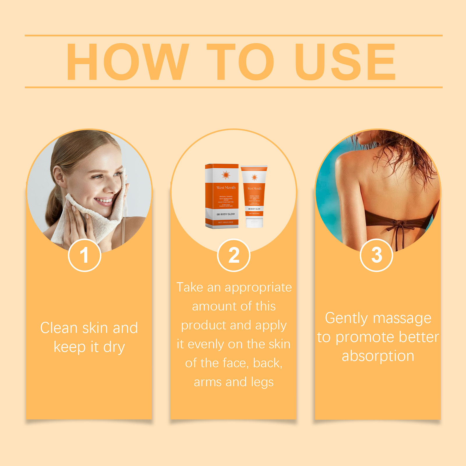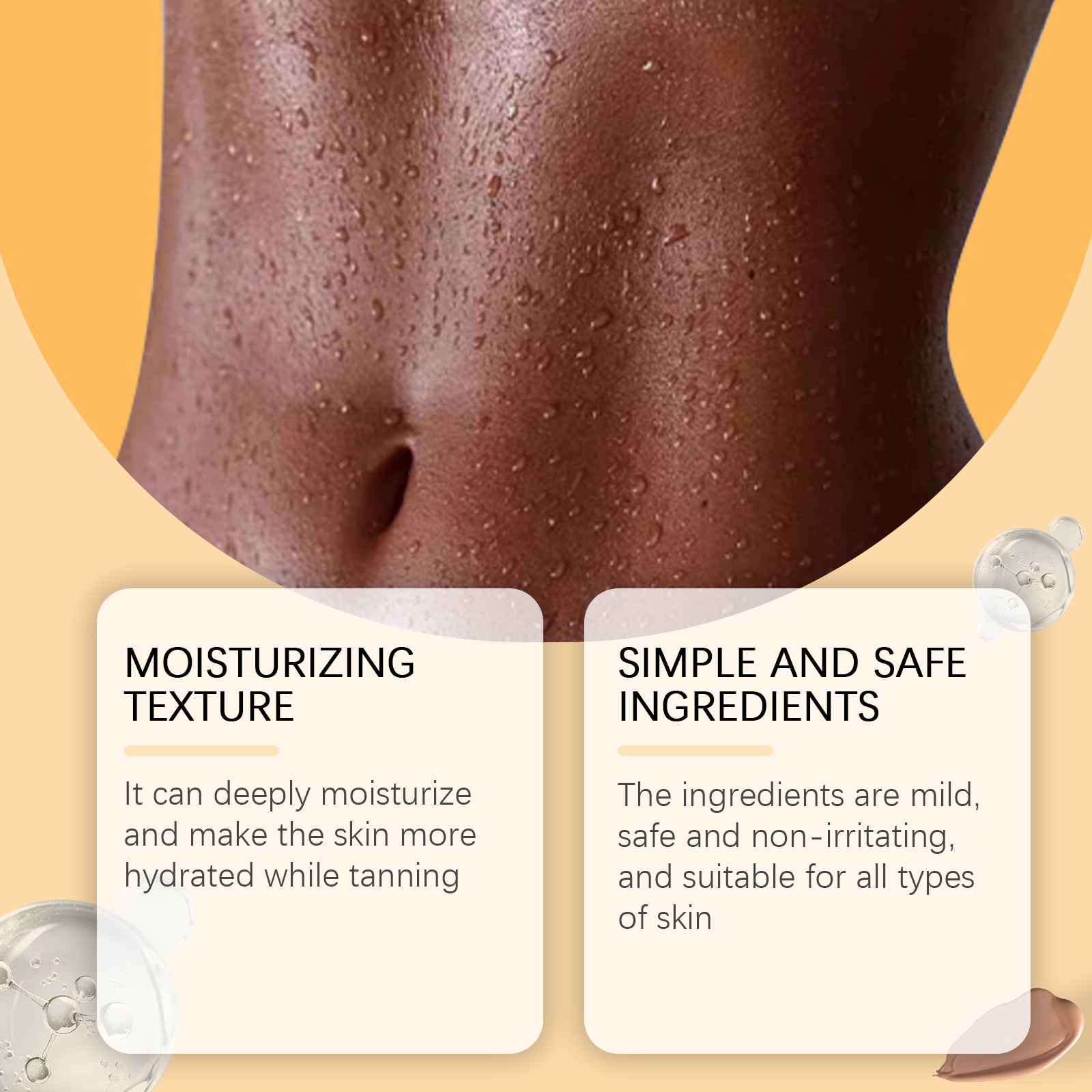 Our darkening cream is carefully formulated with aloe vera leaf extract, honeysuckle extract and tocopherol. Specially designed to give the skin a natural glow. The usage method is extremely convenient: Clean the skin and keep it dry. Take an appropriate amount of this product and apply it evenly to the skin on the face, back, arms and legs. Gently massage to promote better absorption. And it can deeply moisturize, making the skin more hydrated when tanned.