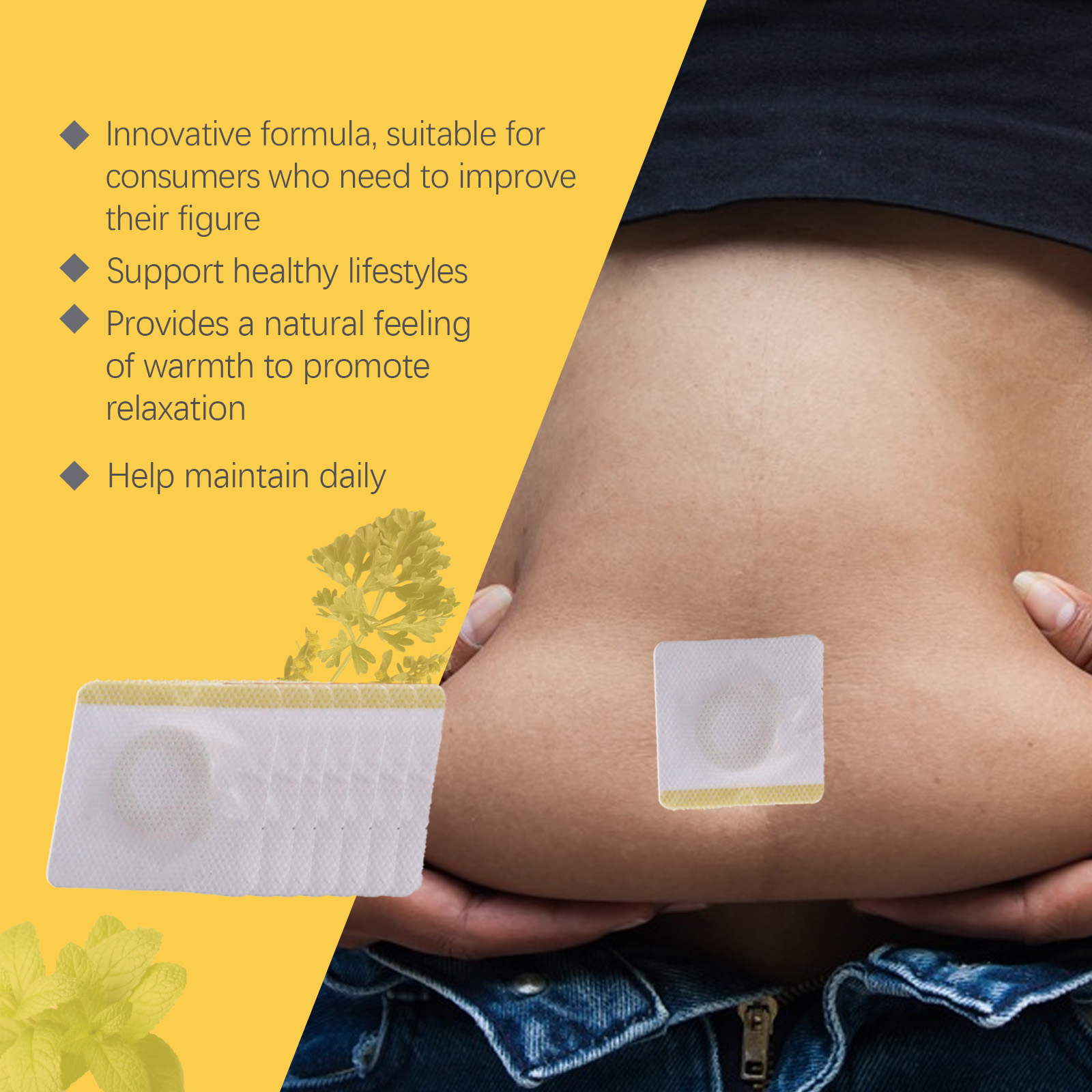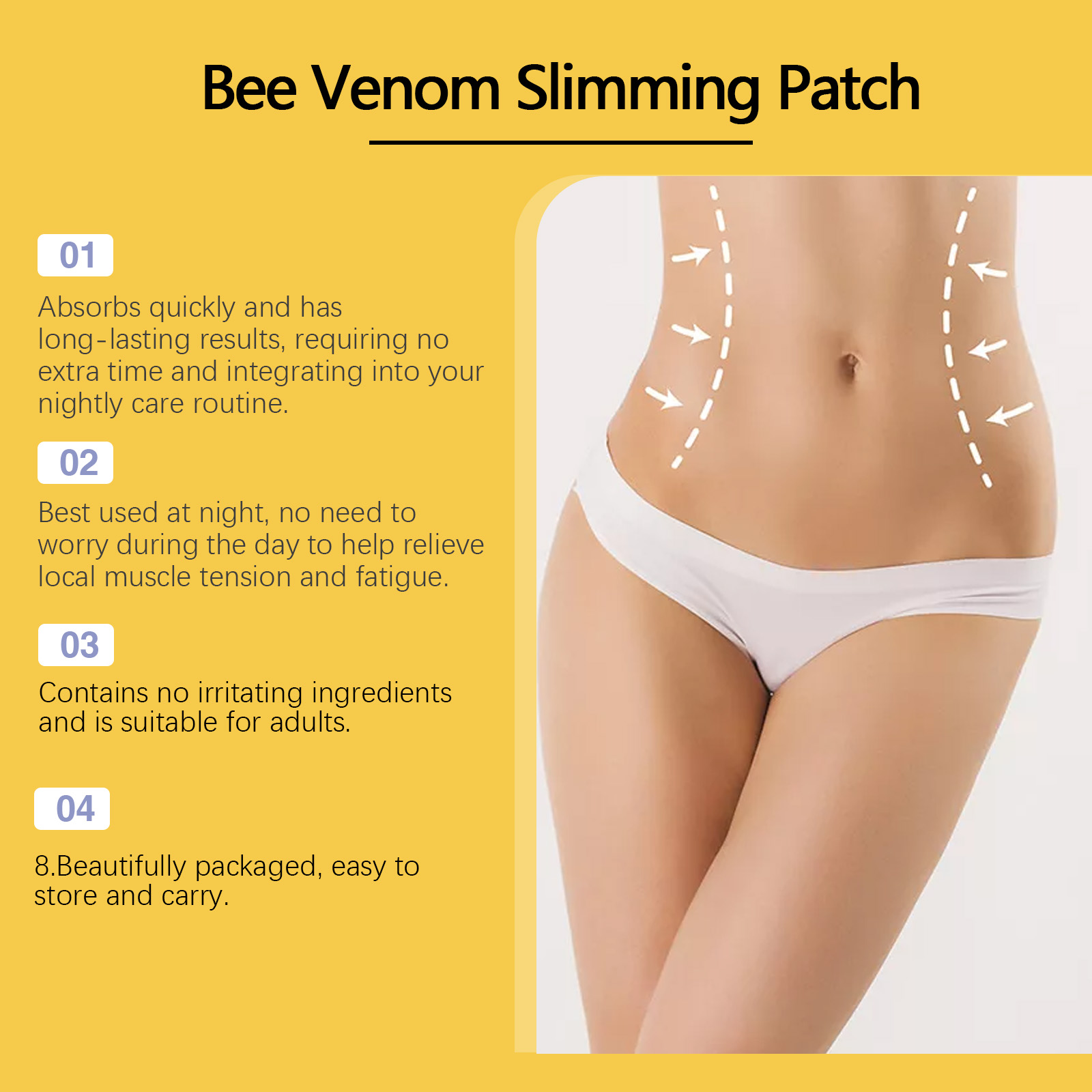 Our bee Venom slimming patch contains bee venom, wormwood and black pepper extract. It can promote body circulation and drainage, reduce edema, make the abdomen flat and firm; Support reduces abdominal discomfort and provides comfort; Promote abdominal blood circulation and increase metabolism. Fit the skin, not easy to fall off when sleeping, uncomfortable, does not affect the appearance. Its use method is very simple: 1. Wash the abdomen and keep dry; 2. Point the patch at the abdomen and press gently to ensure good adhesion; 3. Wait 3-4 hours, then remove. Bee Venom Slimming patch is designed to improve abdominal blood circulation and boost metabolism. Provides continuous comfort and reduces abdominal tightness. Highly absorbent formula, non-greasy skin after use.