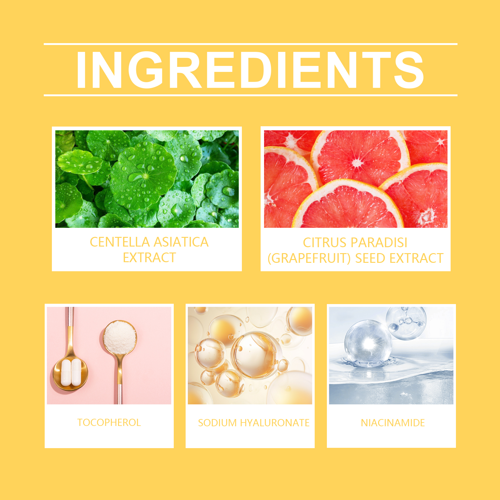 Our grapefruit facial essence is carefully formulated with niacinamide, grapefruit seed extract and vitamin E. Designed specifically for all-round skin nourishment. The usage method is extremely convenient: After cleansing the face, take an appropriate amount of this product and apply it evenly to the facial skin. Gently massage in circular motions to promote absorption. It can also repair dull skin, improve overall radiance, and help the skin retain moisture throughout the day without worrying about a dry environment.