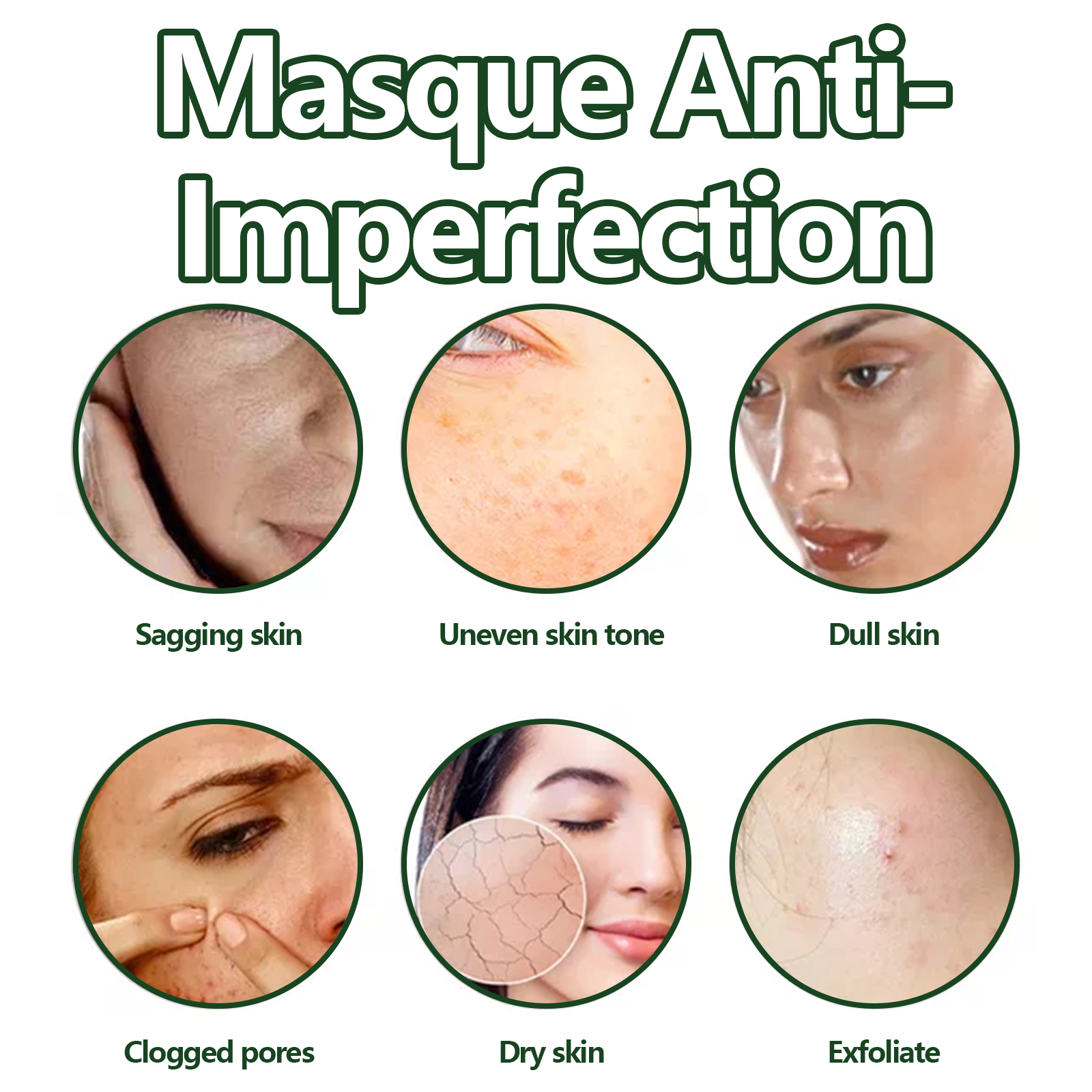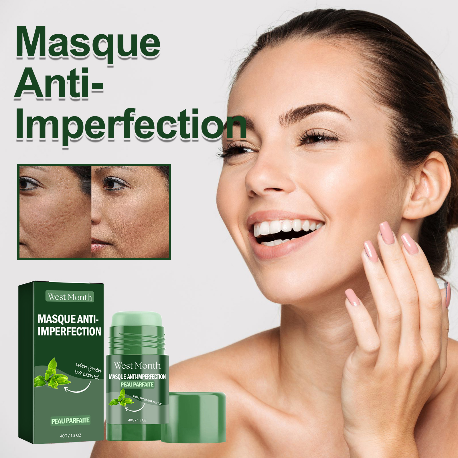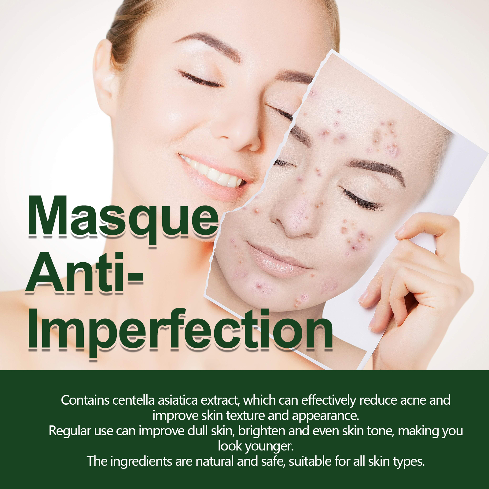 Our Masque Anti-Imperfection contain glycerin, green tea extract, vitamin E. It can effectively remove facial blemishes, make skin more fresh and clean, effectively shrink pores, reduce pore expansion, and make skin more delicate and smooth. The way to use it is very simple: apply the product evenly on your face, let it sit for 15 minutes, and then rinse it off with water. Can effectively reduce pimples, improve skin texture and appearance Regular use can improve dull skin, brighten complexion and make you look younger.