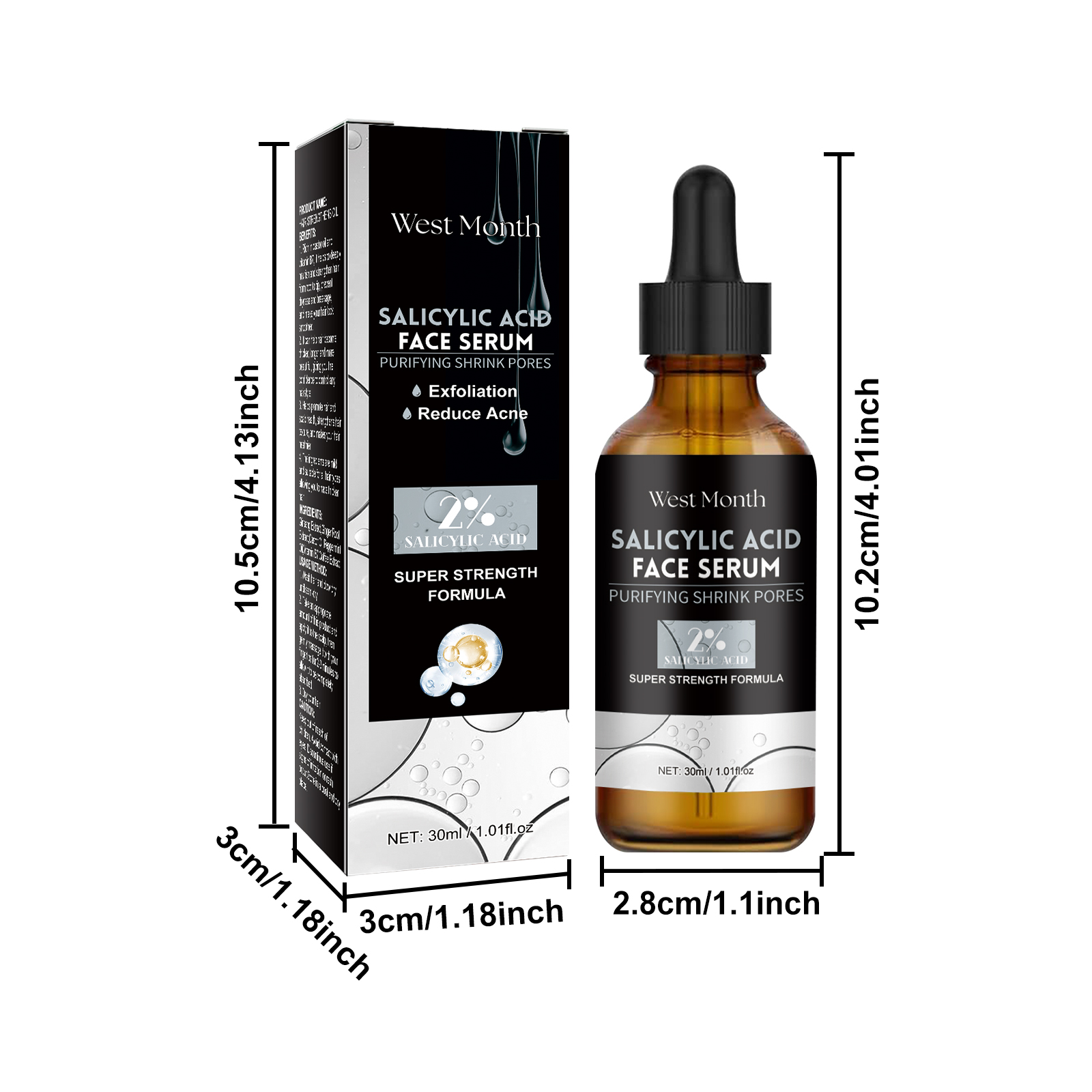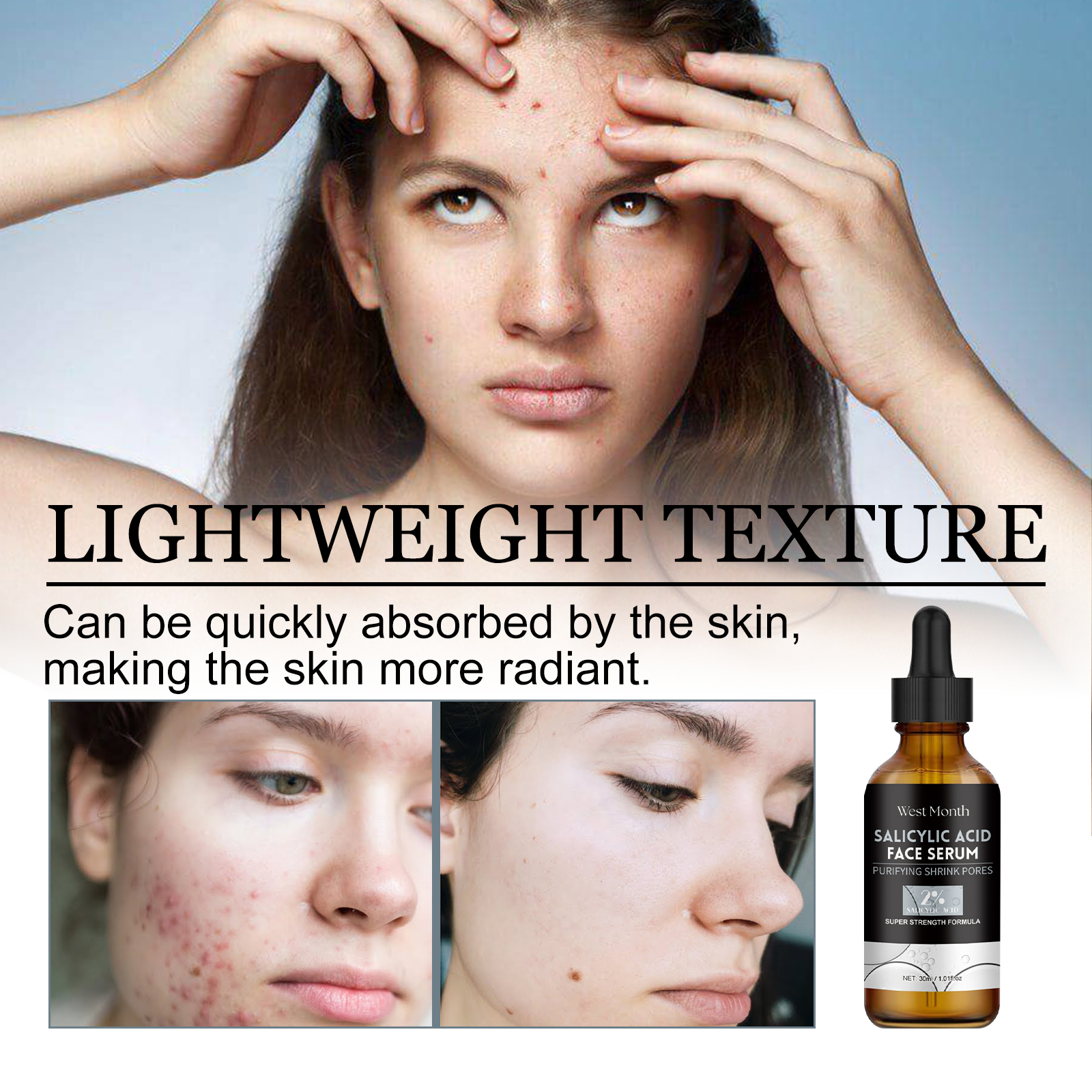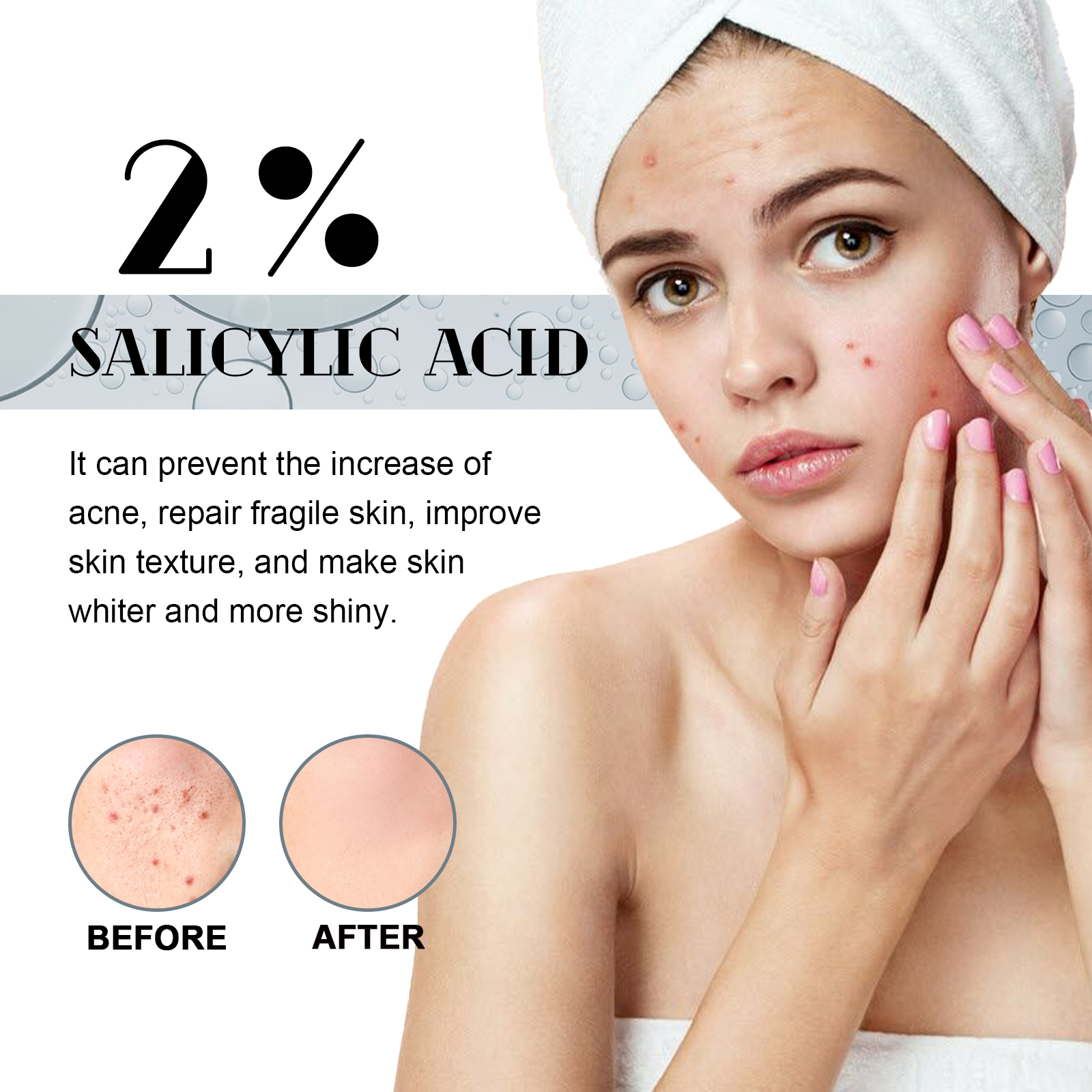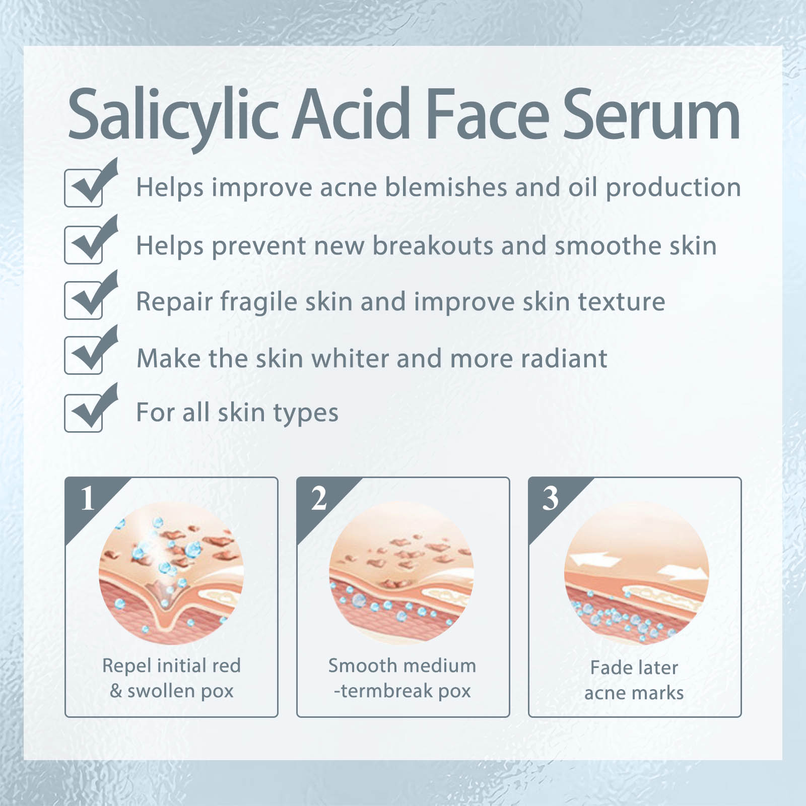 Our salicylic acid facial serum contains salicylic acid, collagen. It can help improve acne blemishes and oil production, help prevent new pimples and smooth the skin, repairing fragile skin. The way to use it is simple: after cleansing, dry your face. Apply appropriate amount to face evenly. Massage gently with your fingertips until fully absorbed. And can effectively reduce skin oil, make the skin more refreshing and not greasy, increase the comfort of your face.