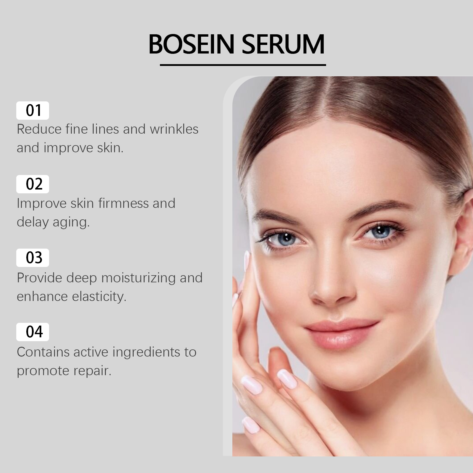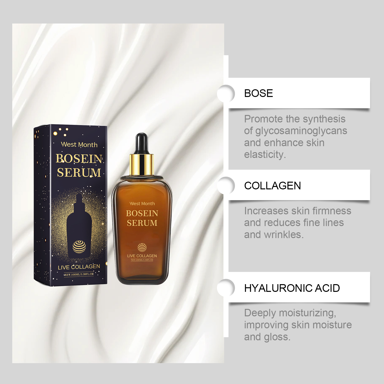 Our Hyaluronic Acid essence lotion is carefully formulated with collagen, hyaluronic acid and acetyl tripeptide-1. Designed specifically to provide deep and long-lasting moisturizing effects. The usage method is extremely convenient: Thoroughly clean and dry the facial skin. Take an appropriate amount of this product and apply it evenly to the facial skin. Gently massage to promote better absorption. And it can enhance skin elasticity and rejuvenate the skin.