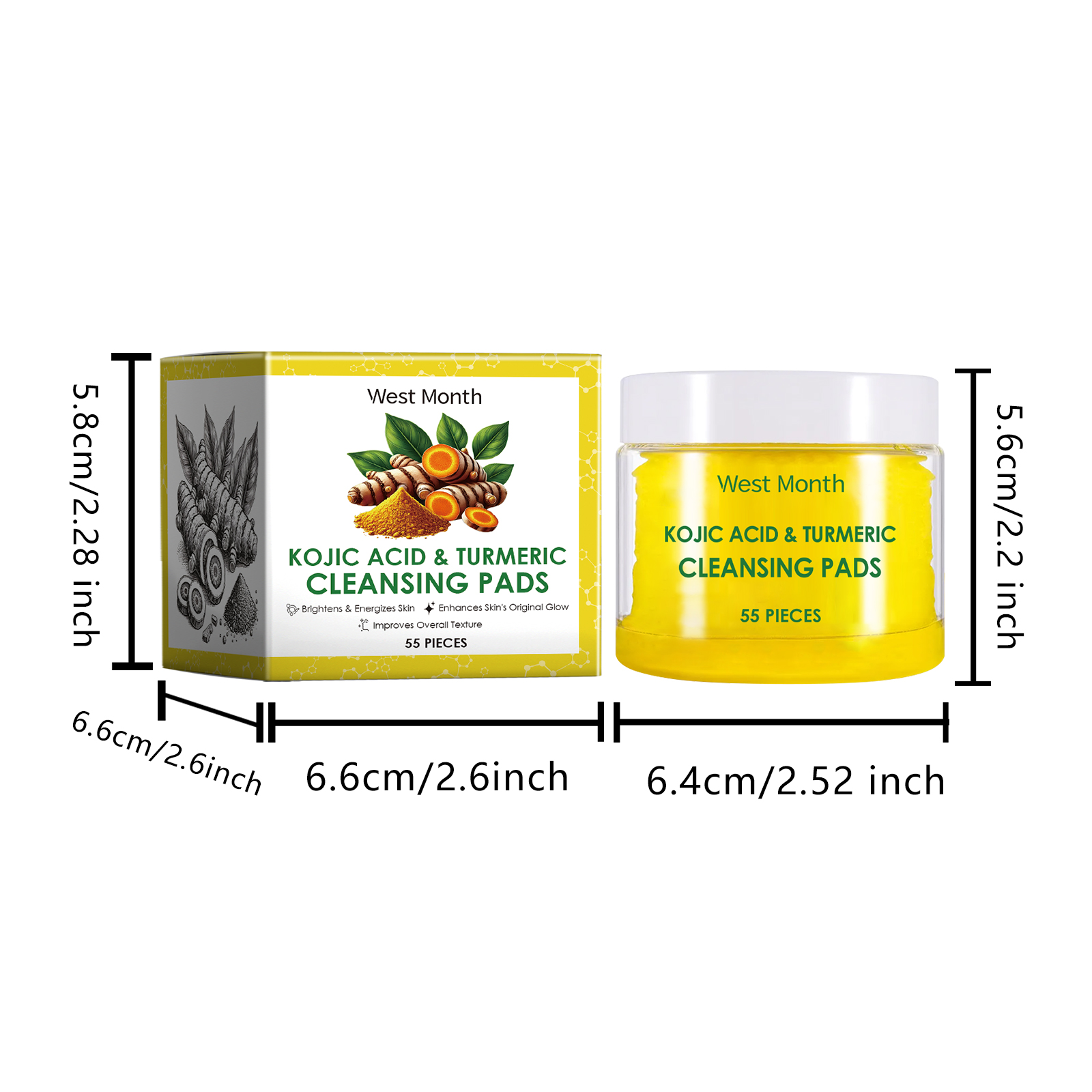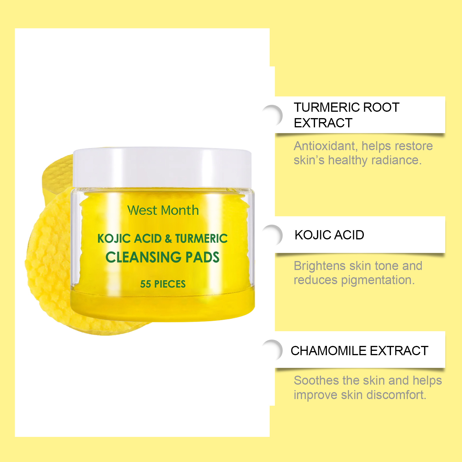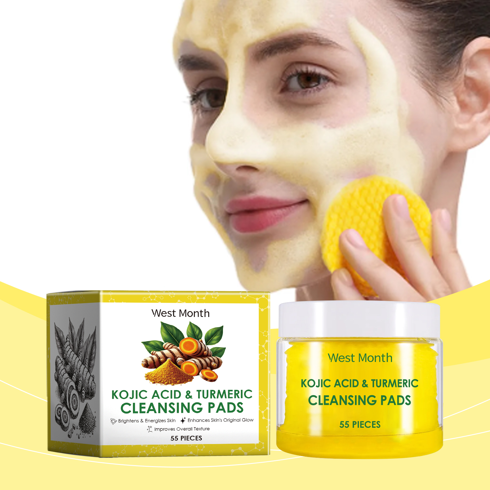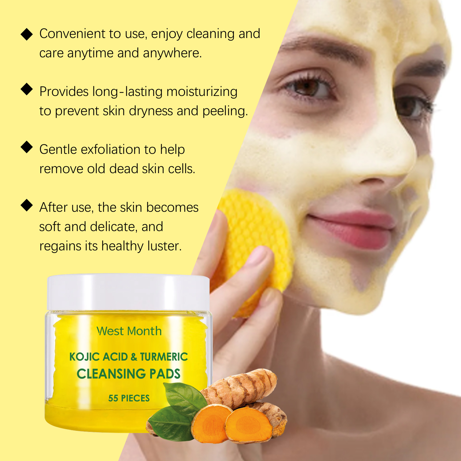 Our turmeric cleaning pads are carefully formulated with turmeric root extract, kojic acid and chamomile extract. Designed specifically for deep pore cleansing, removing dirt and excess oil. The usage method is extremely convenient: 1. First, moisturize the facial skin. 2. Take one tablet of this product, gently apply it to the face, and massage in circular motions to promote absorption. 3. Wait for 1 to 2 minutes and then rinse with clean water. It can also brighten the complexion, reduce facial dullness, effectively fade pigmentation, and make the skin more even and radiant.