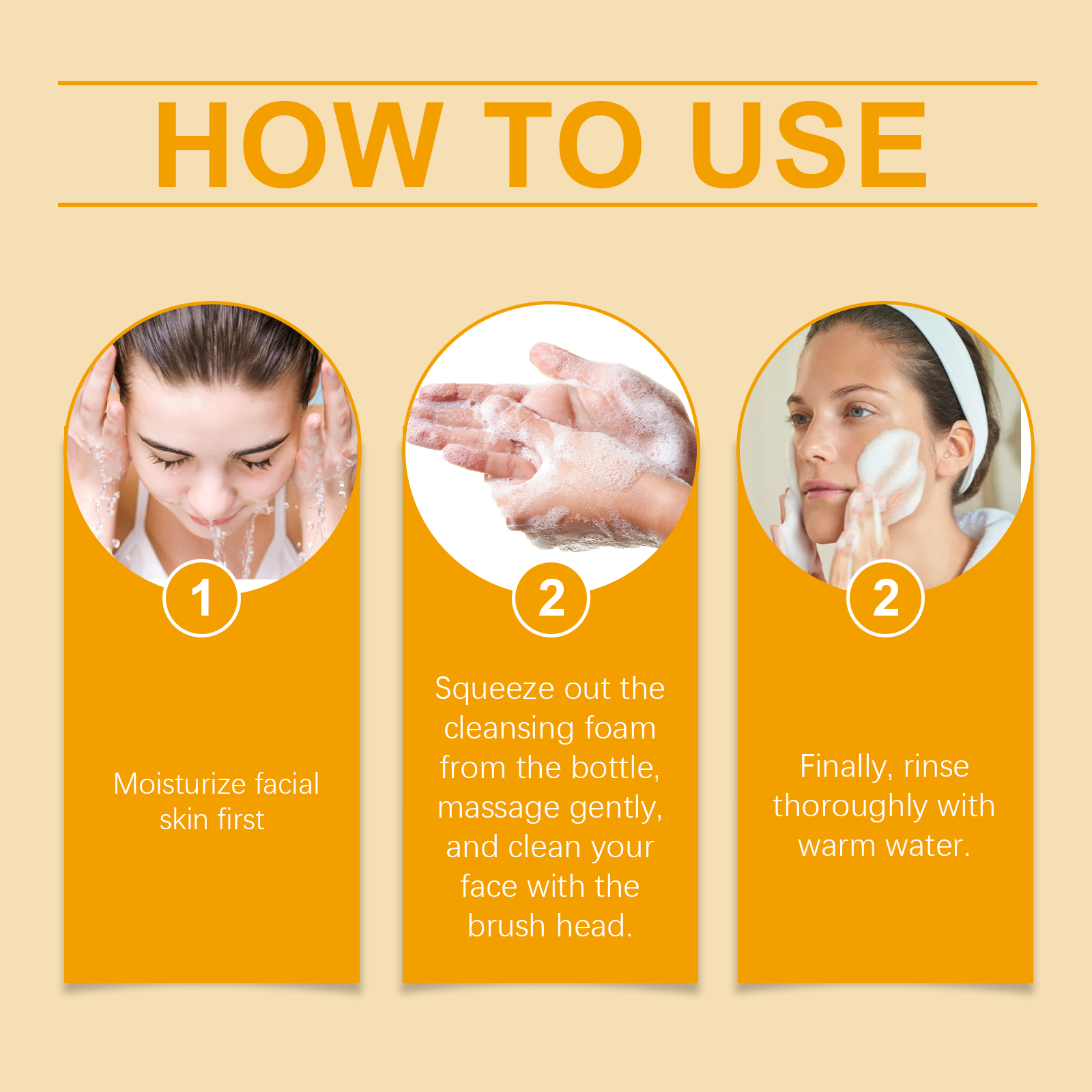 Our turmeric facial cleanser is carefully formulated with turmeric root extract and kojic acid. Specially designed for antibacterial and anti-inflammatory purposes and to prevent acne. The usage method is extremely convenient: First, moisturize the facial skin, squeeze out the facial cleanser from the bottle, gently massage, clean the face with a brush head, and finally rinse thoroughly with warm water. And it can effectively reduce blackheads and improve skin texture.
