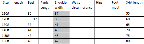 Size 10 (recommended height around 100cm), size 120 (recommended height around 110cm), size 130 (recommended height around 120cm), size 140 (recommended height around 130cm), code 150 (recommended height around 140cm), yards 160 (recommended height around 140cm) About 150cm)