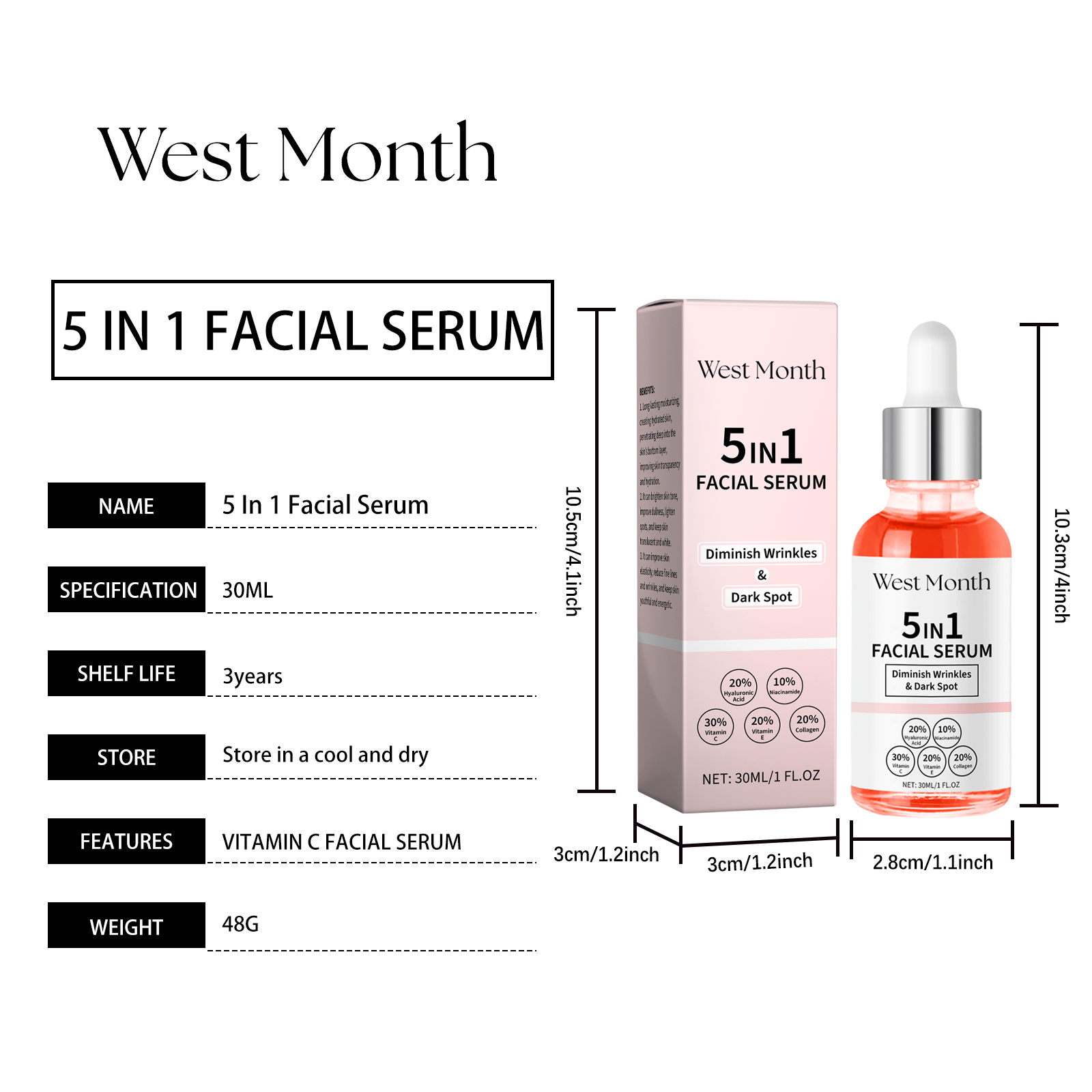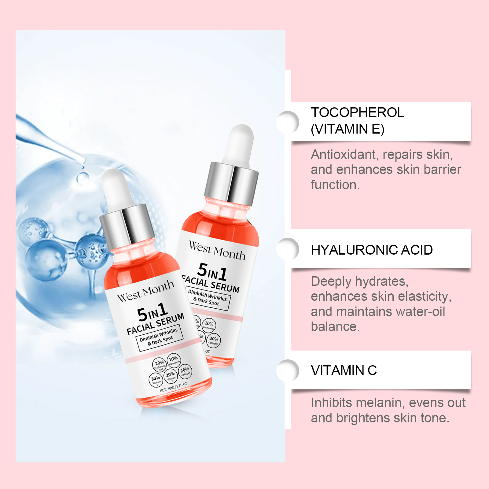 Our serum contains ascorbic acid (vitamin C), tocopherol (vitamin E), collagen. It can deeply repair, fade fine lines and wrinkles, and restore smooth skin. With continuous use, the skin's fineness will be significantly improved. Its application method is very simple: clean and dry facial skin, apply an appropriate amount of essence evenly on the face, gently massage until absorbed. It can also improve the transparency of the skin and make it glow.