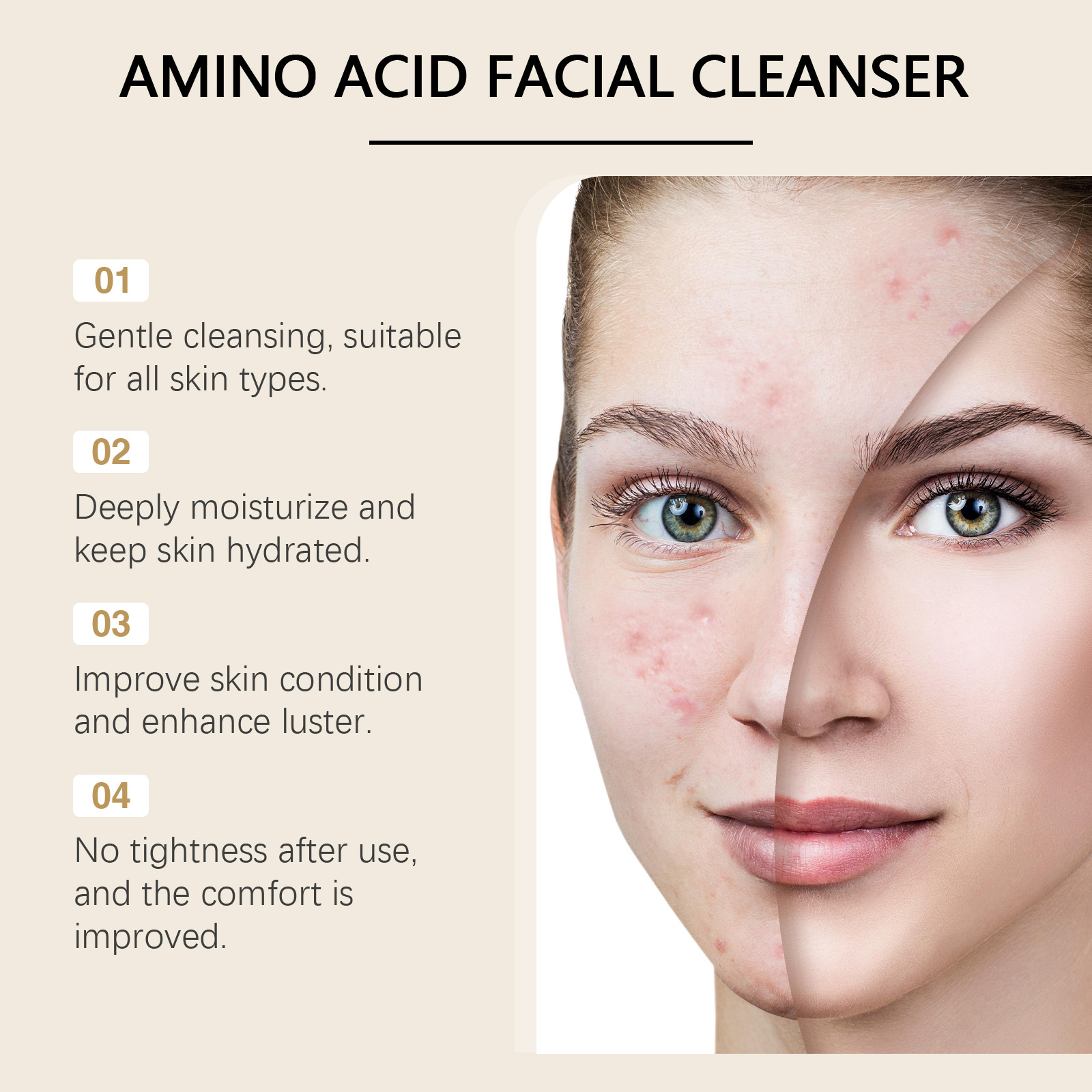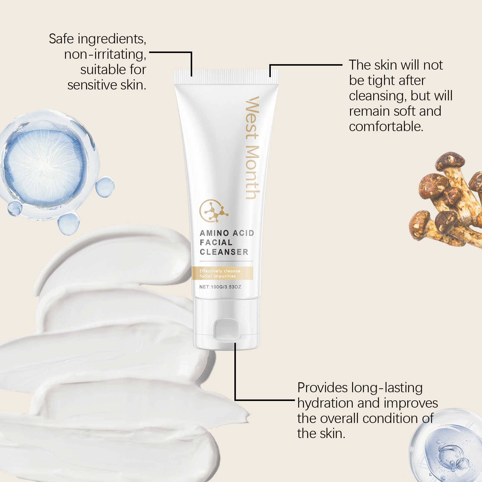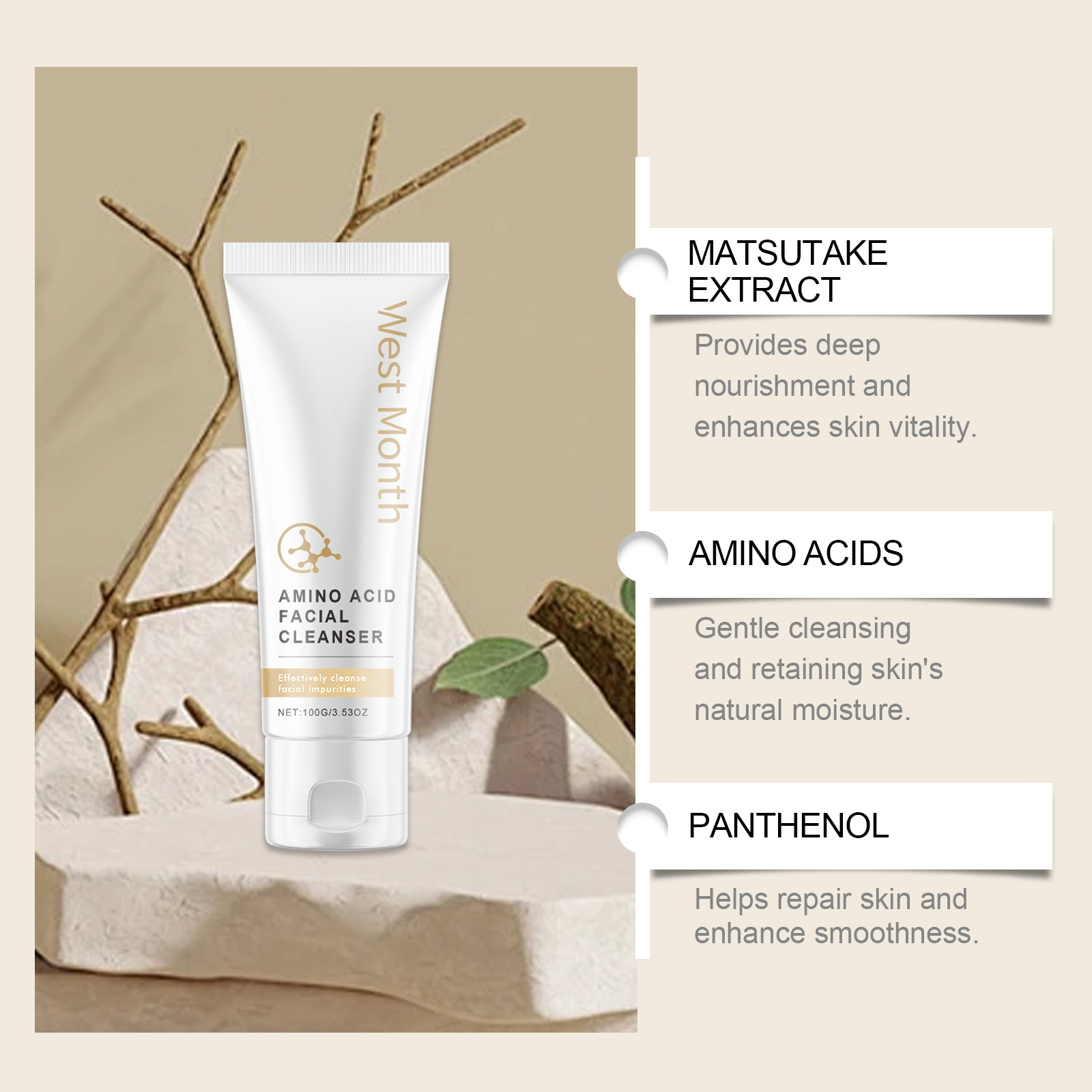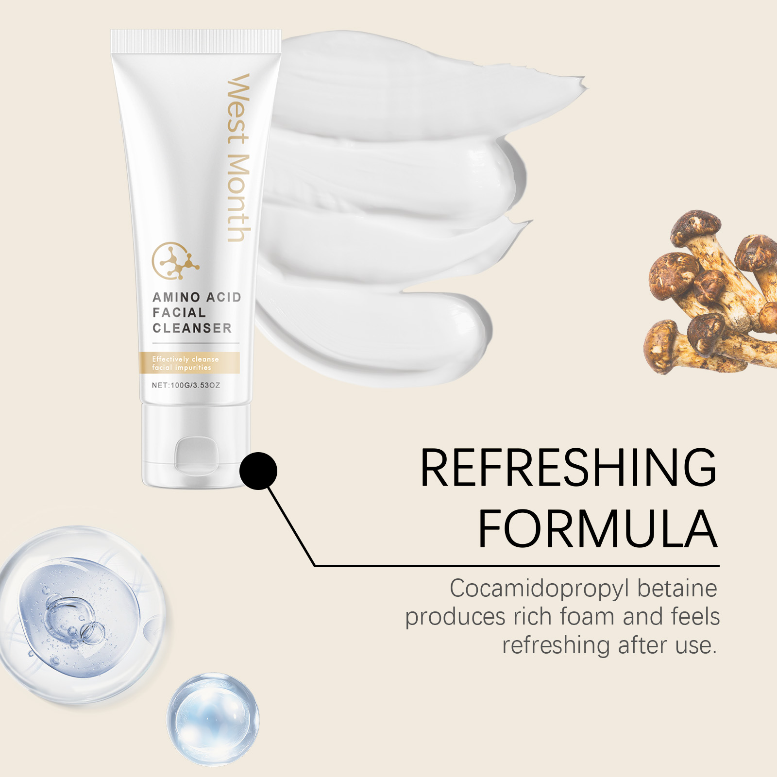 Our amino acid cleanser contains matsutake extract, amino acids, panthenol. It can help repair the skin and improve shine and smoothness. The way to use it is very simple: 1. Clean your hands and wet your face with warm water; 2. Take proper amount of facial cleanser, add a little water and rub until foaming. 3. Apply the foam evenly to your face with your fingertips; 4. Wash your face with water. Rich in amino acids, gentle removal of dirt and oil, suitable for daily use. Matsutake essence and hyaluronic acid moisturize skin effectively and keep skin hydrated.
