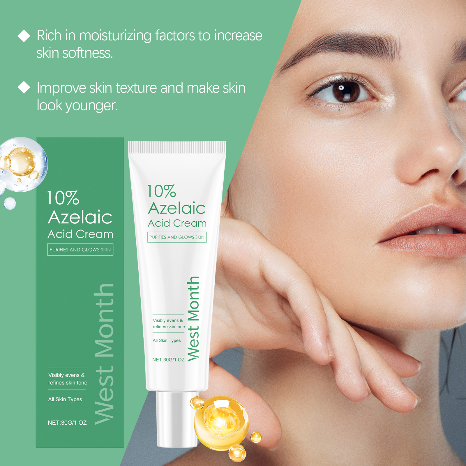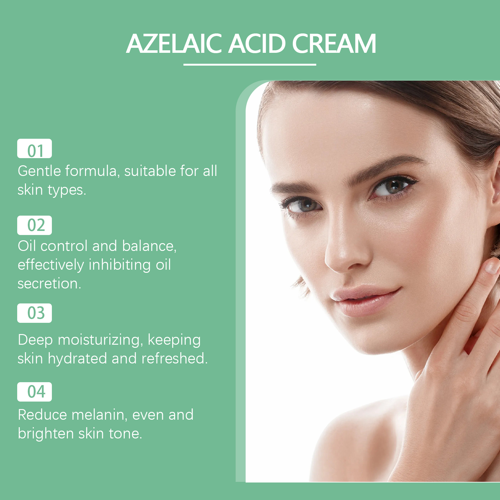 Our azelaic acid cream contains azelaic acid and vitamin C. It reduces melanin deposits, equalizes skin tone, and brightens skin. The way to use it is simple: clean and dry your facial skin, apply the right amount of cream evenly on your face, and gently massage until absorbed. And mild formula, suitable for all skin types.