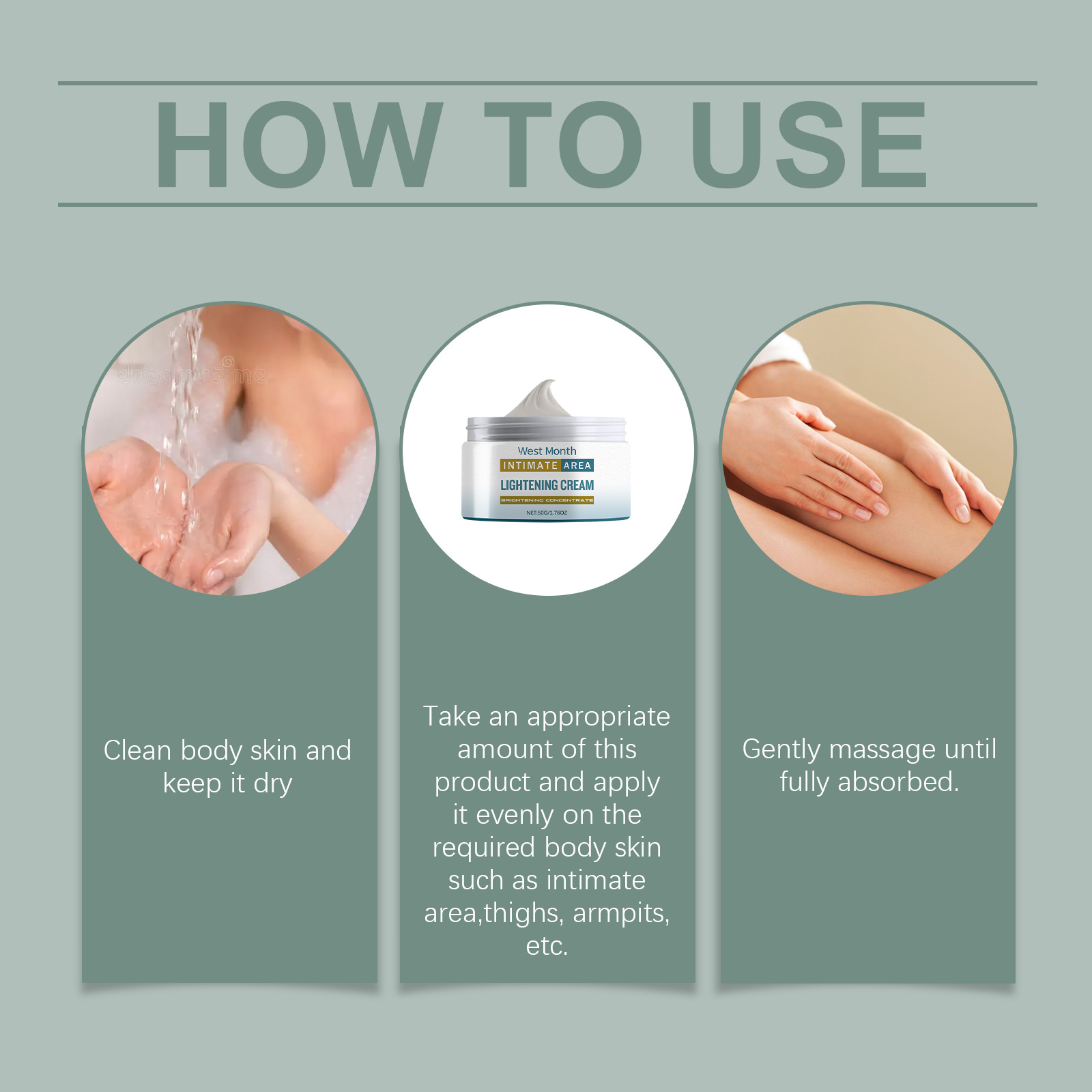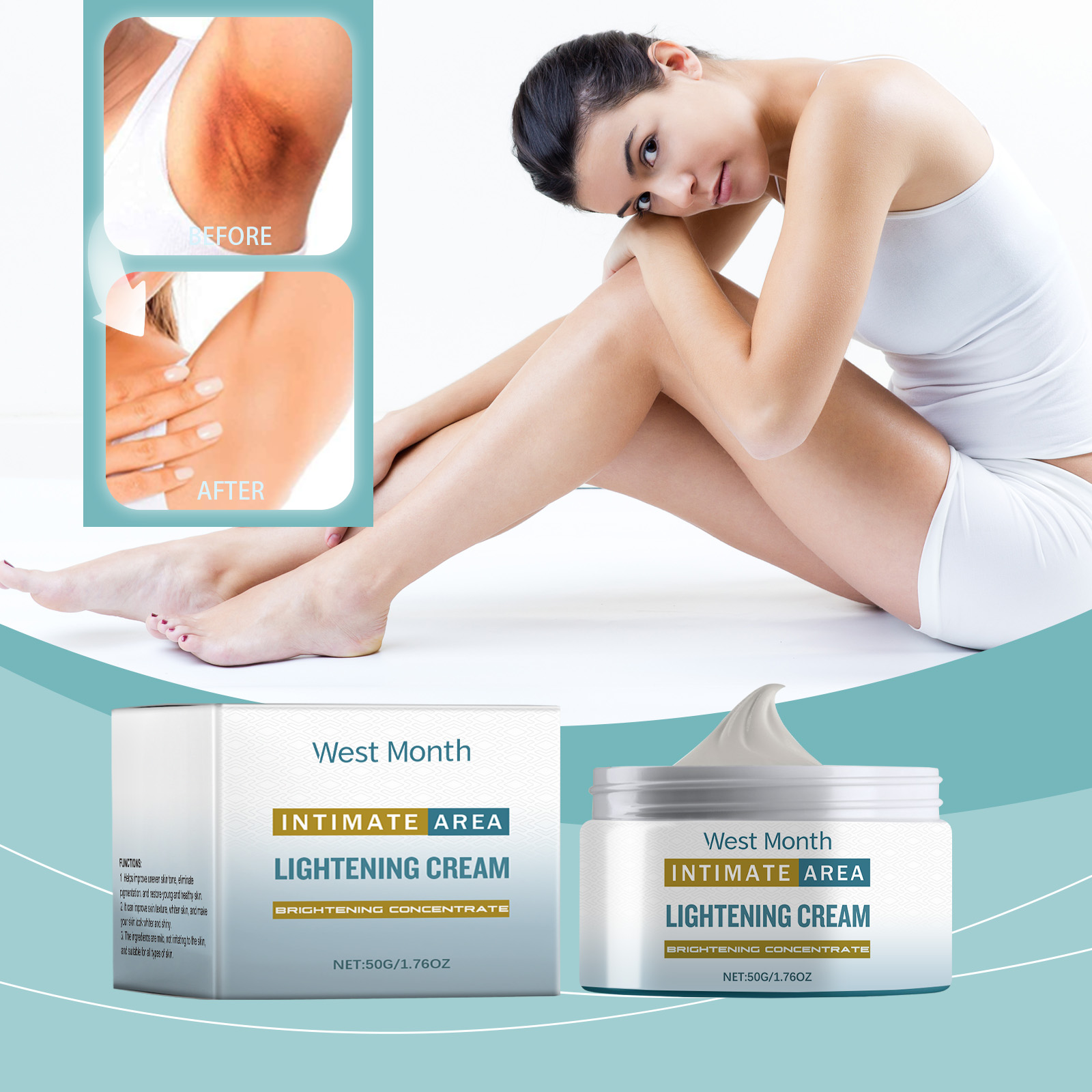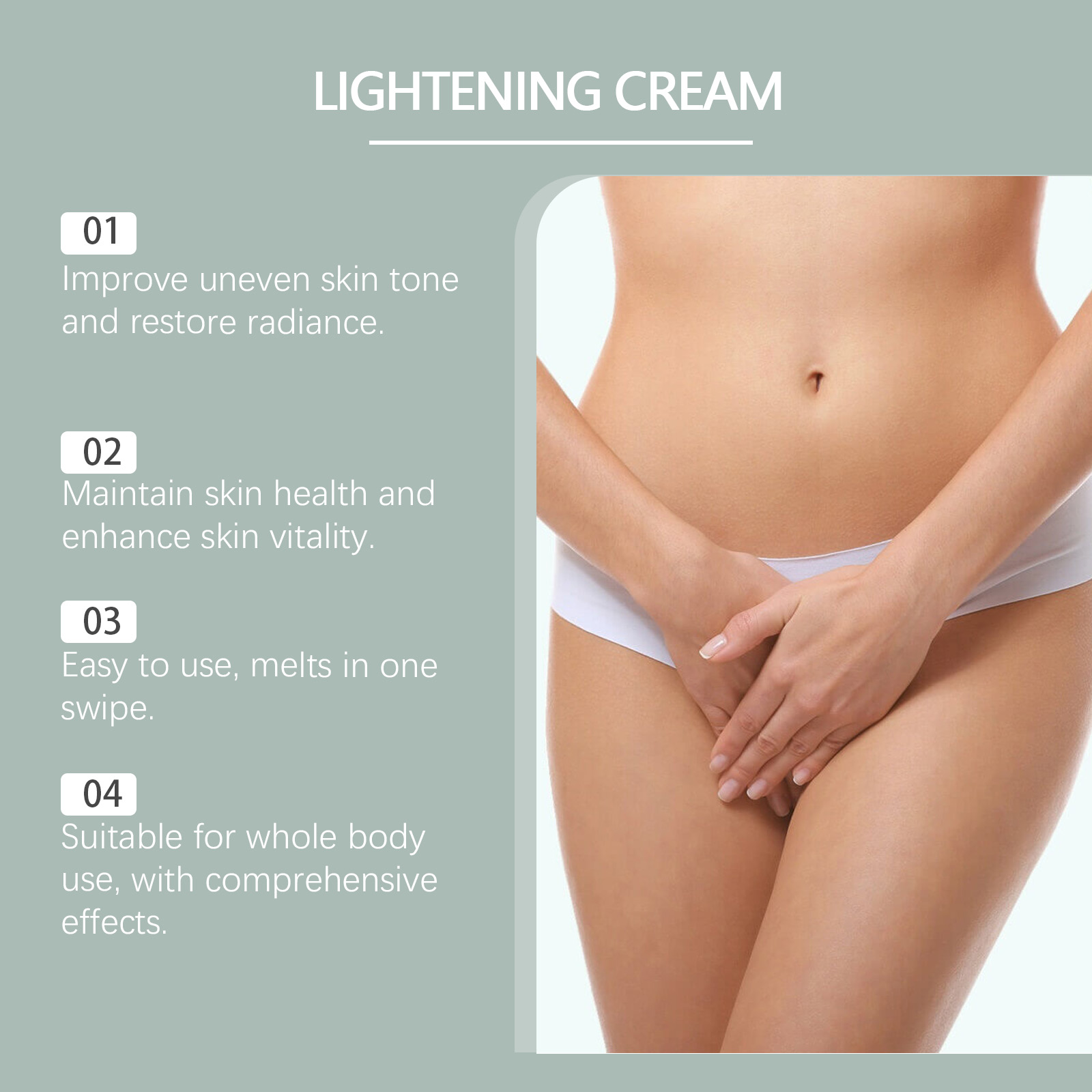 Our body care cream is carefully formulated with licorice root extract, niacinamide and glycerin. Designed specifically to reduce pigmentation and brighten the complexion. The usage method is extremely convenient: Clean the skin of the body and keep it dry. Take an appropriate amount of this product, apply it evenly to the desired skin areas of the body, such as the private parts, thighs, armpits, etc., and gently massage until fully absorbed. And it can eliminate pigmentation and restore young and healthy skin.