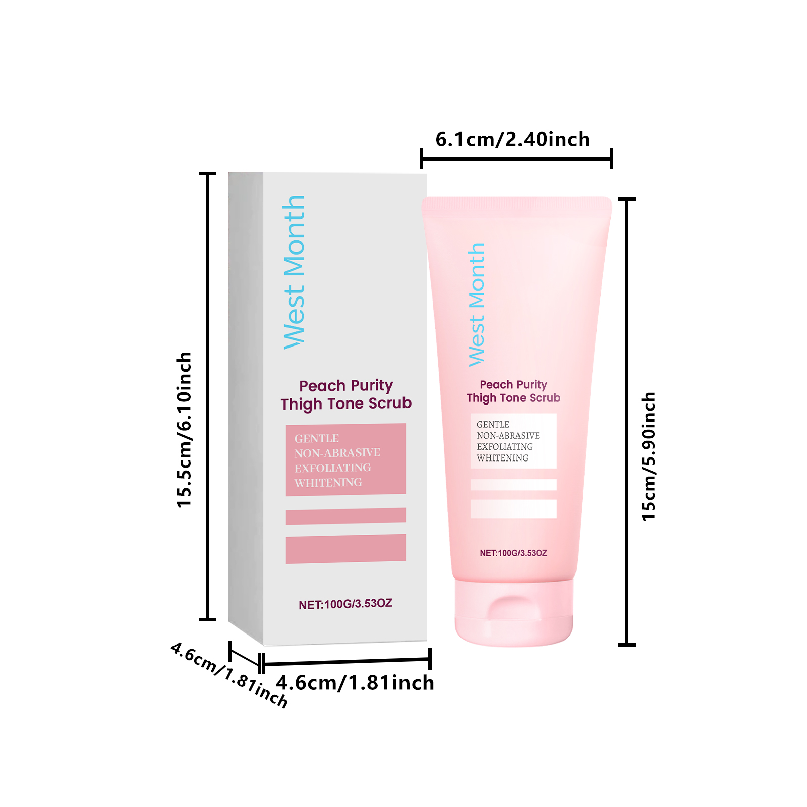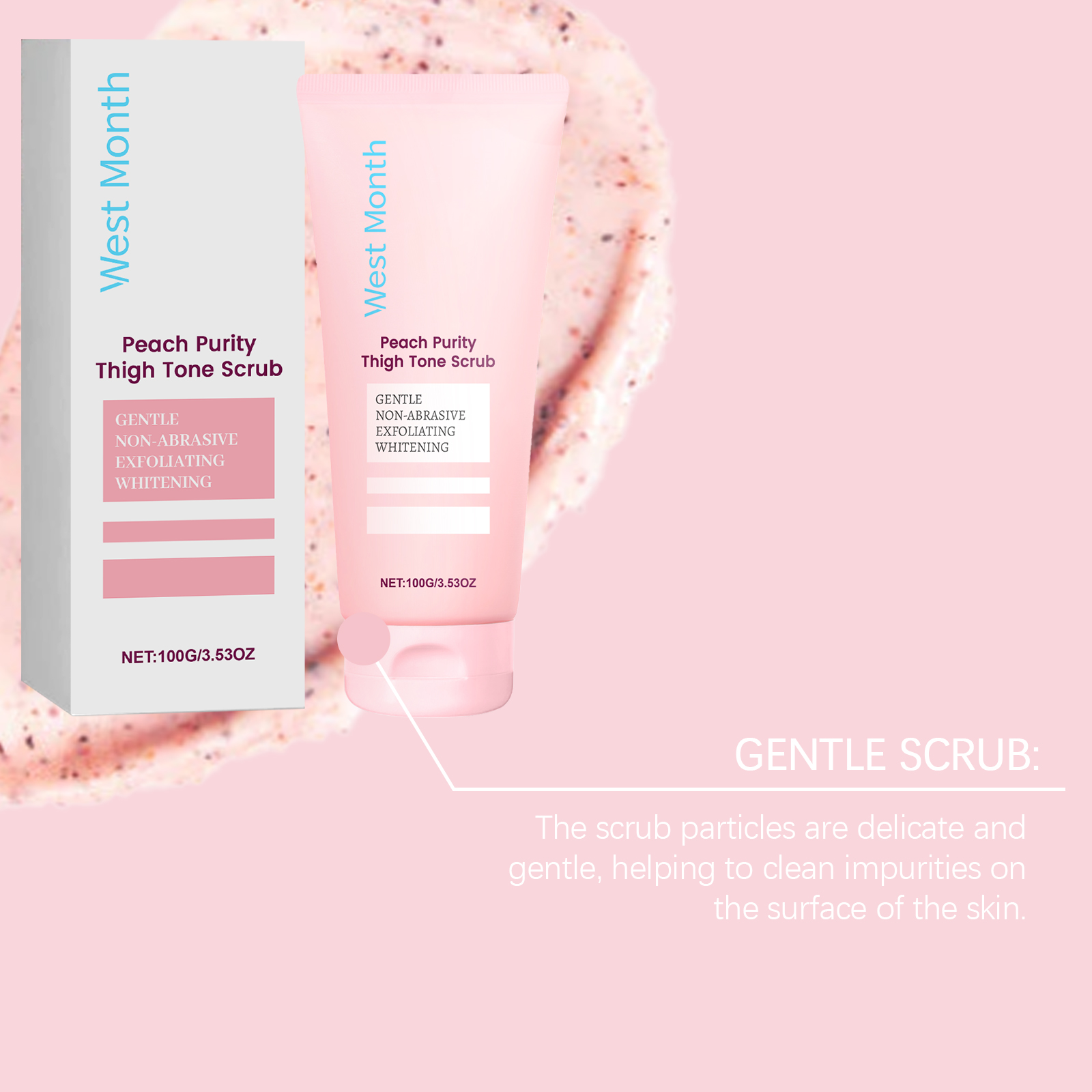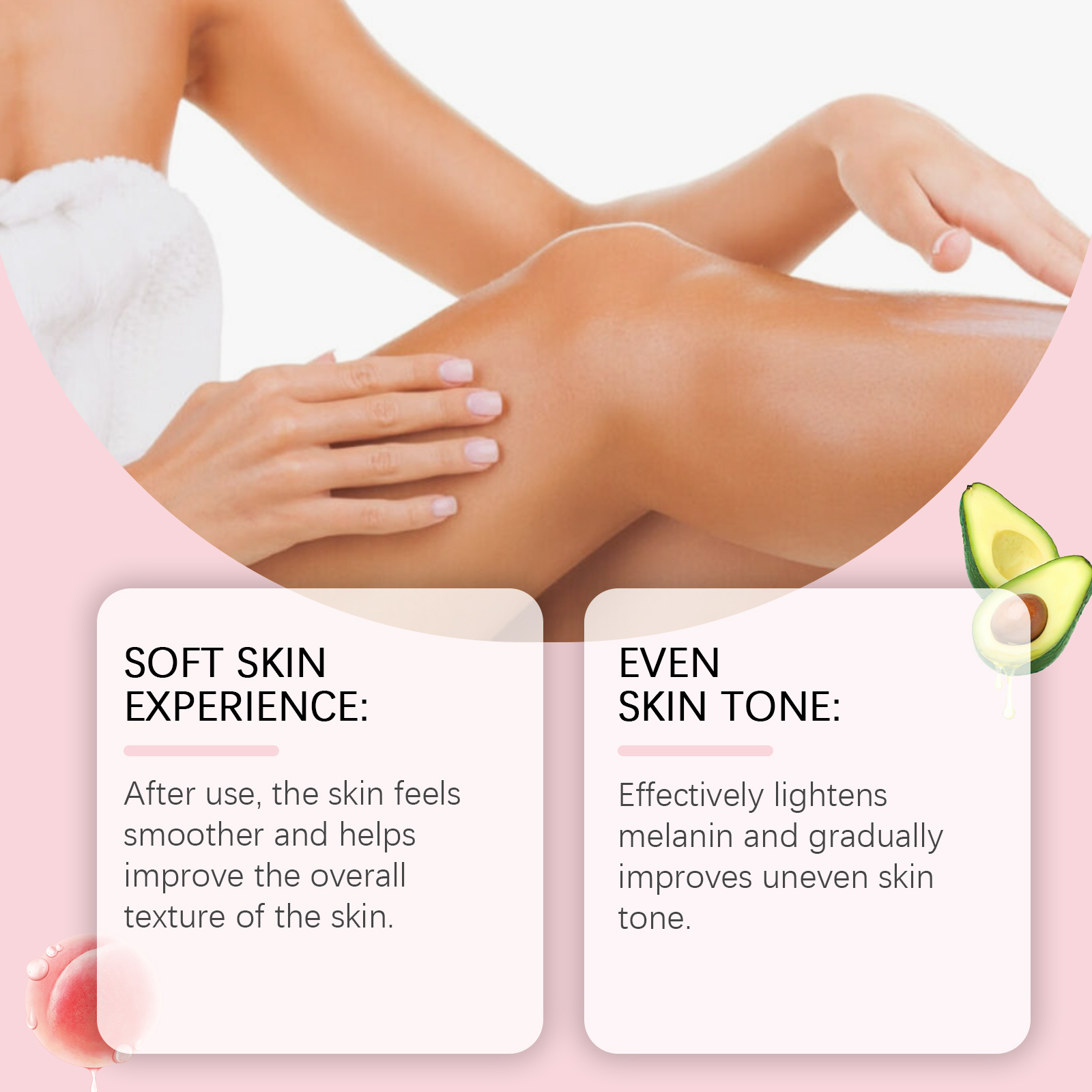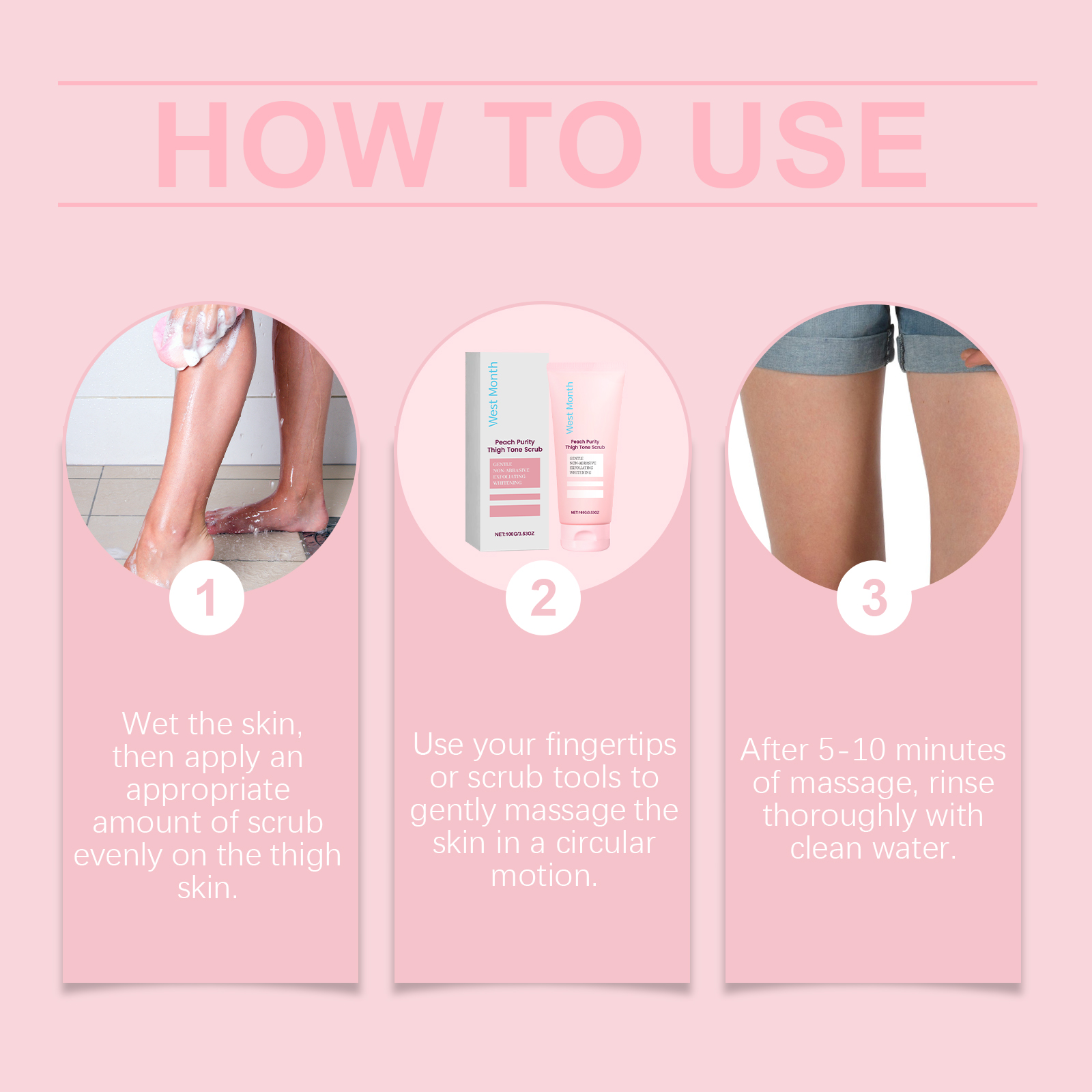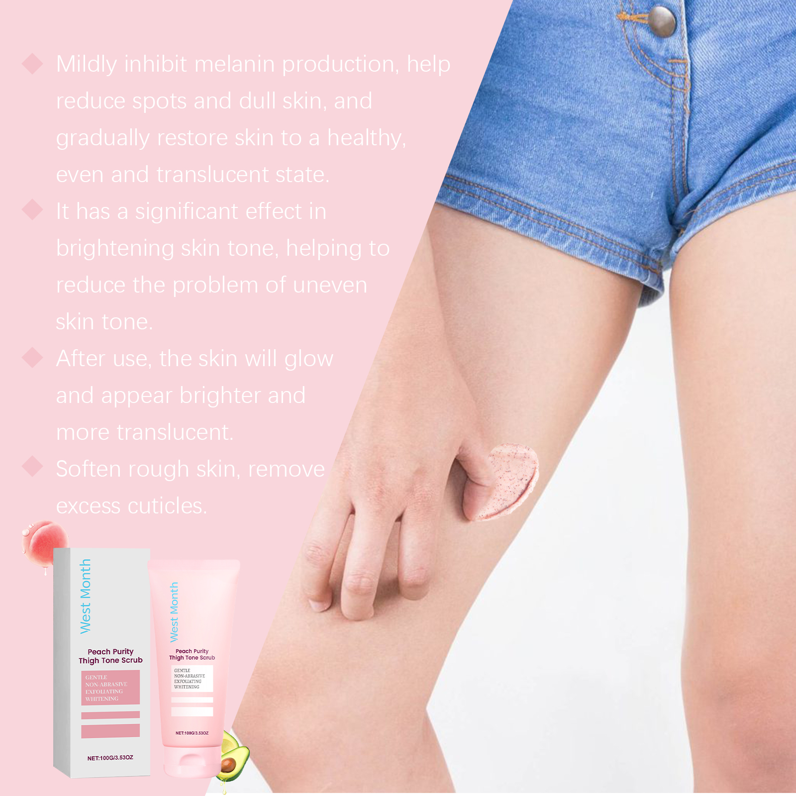 Our body scrub contains avocado oil and peach extract. It can effectively dilute melanin and gradually improve uneven skin tone. The method of use is very simple: moisten the skin, then evenly apply an appropriate amount of the cleanser on the thigh skin, gently massage the skin with your fingertips or wiping tool in a circular motion, massage the skin for 5-10 minutes, and rinse thoroughly with water. And the skin can feel smoother after use, helping to improve the overall texture of the skin. It also has a unique moisturizing ingredient that can keep the skin hydrated for a long time after use.