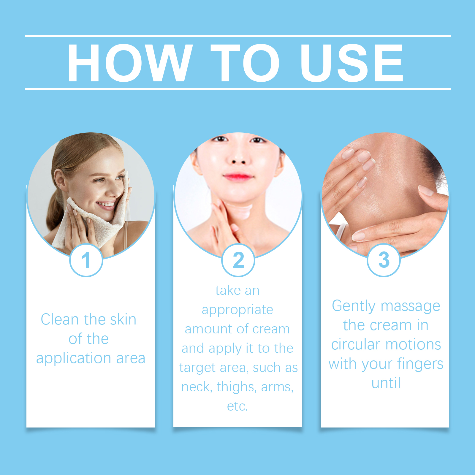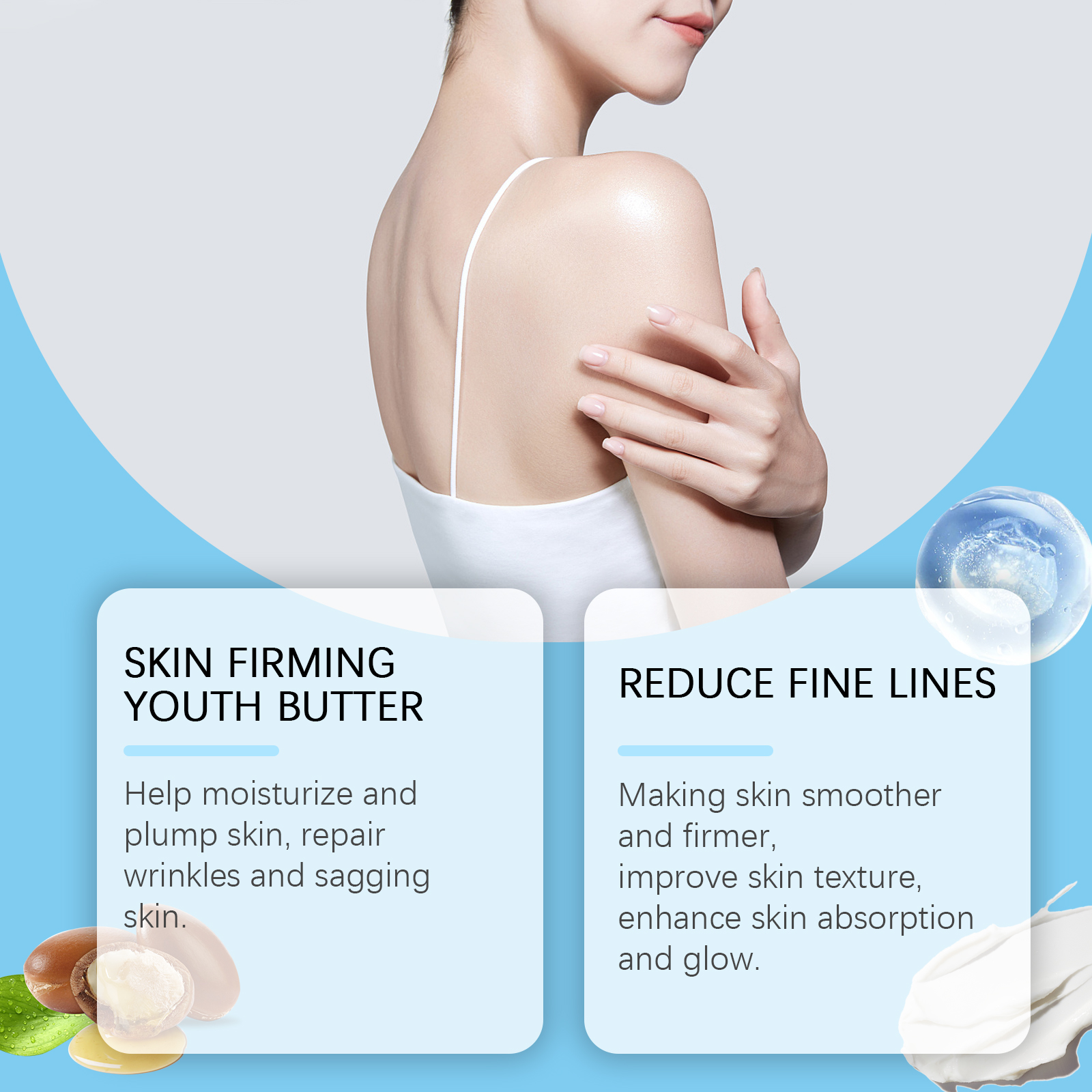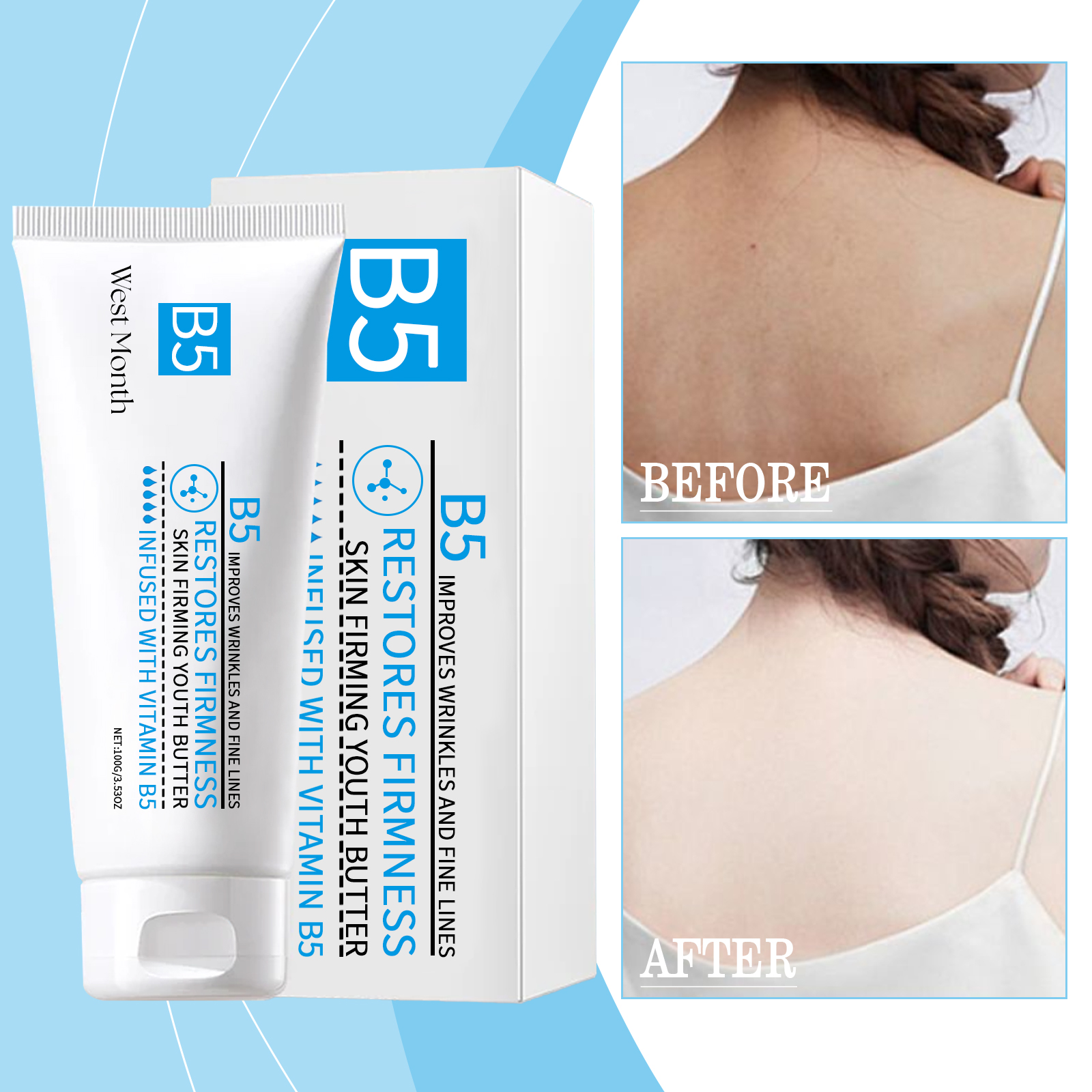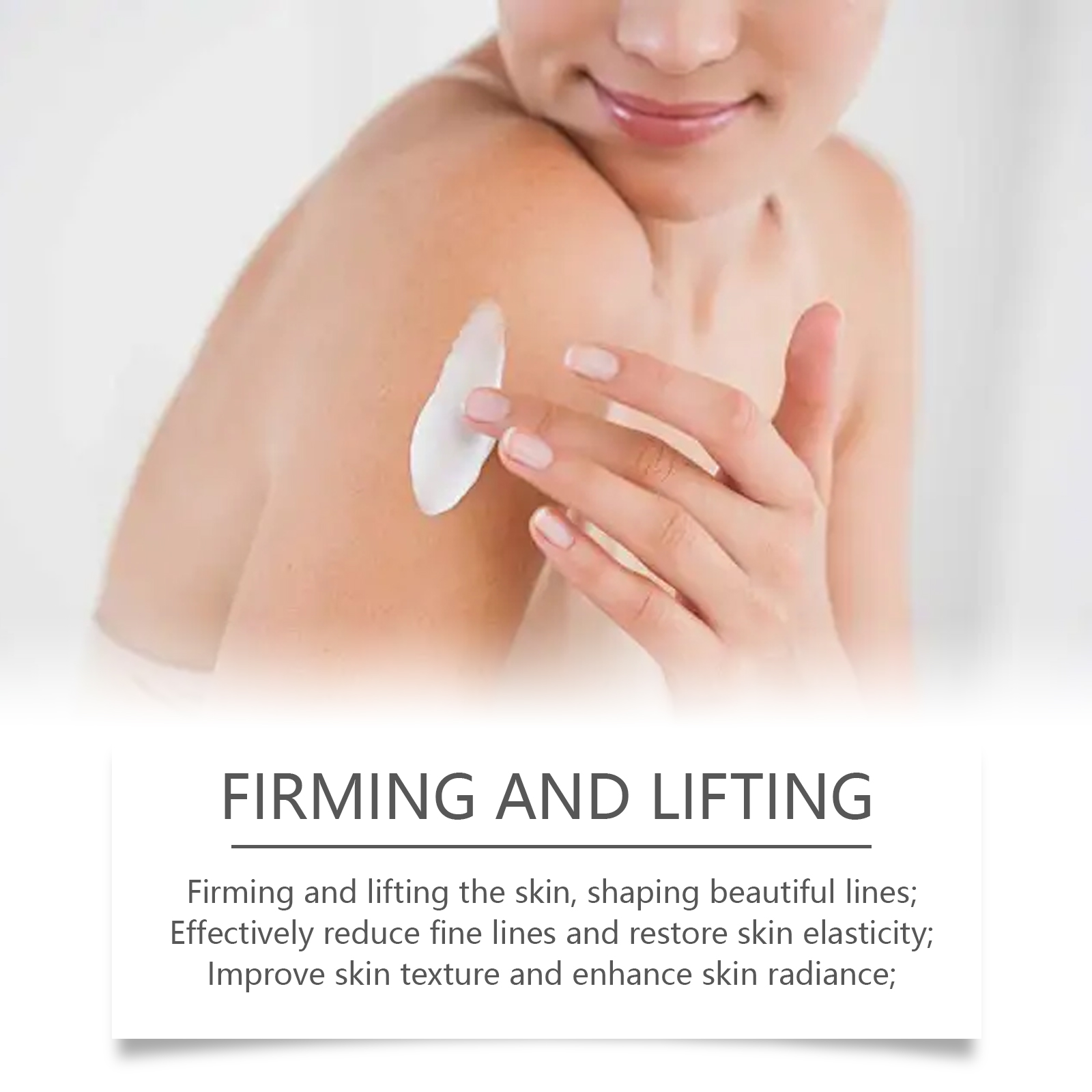 Our body skin firming cream contains hyaluronic acid and niacinamide. It can tighten and brighten the skin, shape beautiful lines, effectively reduce fine lines, and restore skin elasticity; Improves skin texture and enhances skin shine. Its application method is very simple: clean the skin of the application area, apply an appropriate amount of cream to the target area, such as the neck, thighs, arms, etc., and gently massage with your fingers in a circular motion. And can help moisturize and plump the skin, repair wrinkles and sagging skin.