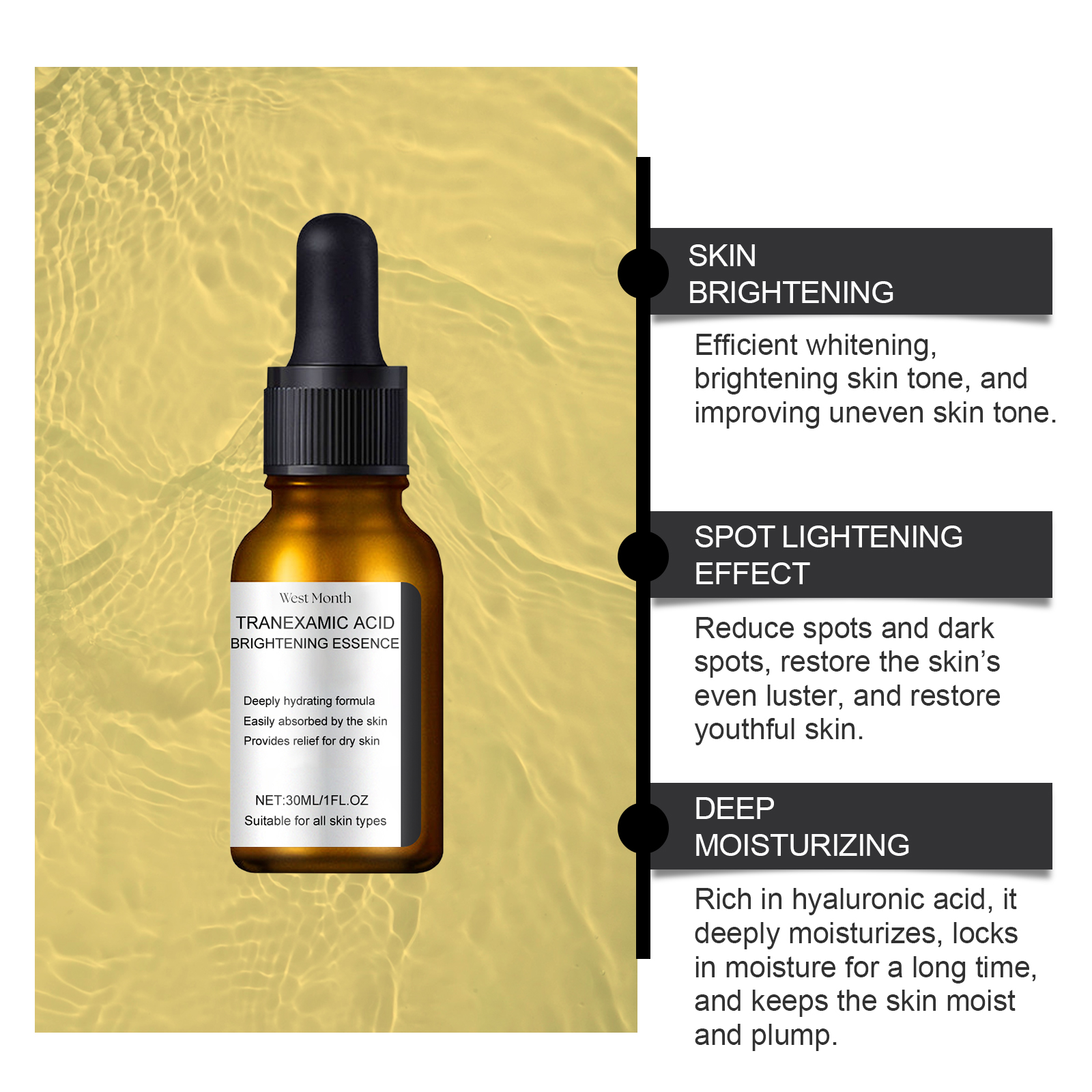 Our brightening serum contains Asiaticum asiatica extract and arbutin. It keeps your skin glowing all day long. Its use method is very simple: thoroughly clean the skin, dry, apply appropriate amount of this product evenly on the face skin, gently massage to promote complete absorption. And can improve skin elasticity, reduce fine lines and wrinkles, make the skin firm and smooth.