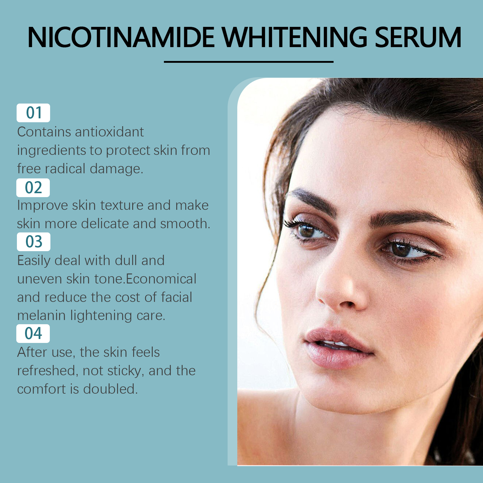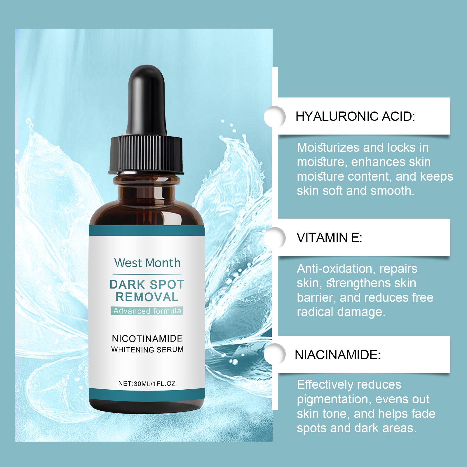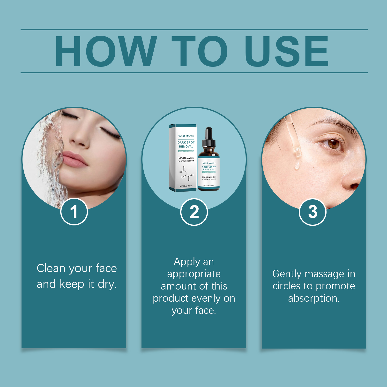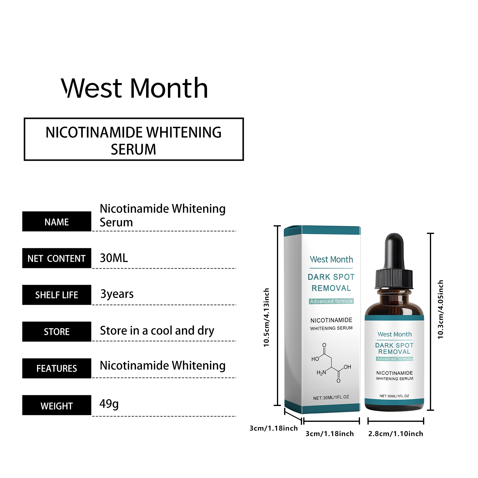 Our brightening serum contains vitamin C and vitamin E. It can easily cope with dull and uneven skin tones. Economical, reduce the cost of facial melanin bleaching care. The way to use it is simple: clean your face and keep dry, apply an appropriate amount of this product evenly on the face, gently massage in circles to promote absorption. And can improve the texture of the skin, make the skin more delicate and smooth.
