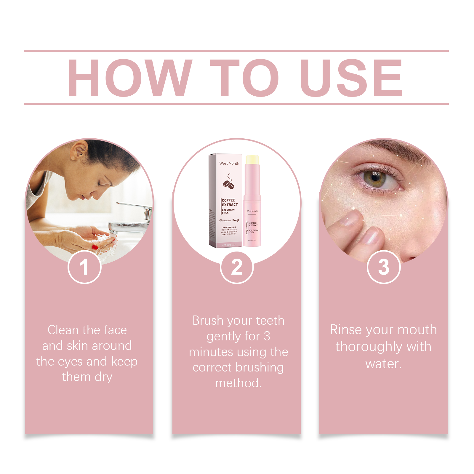 Our caffeine eye cream bars contain vitamin E (tocopherol), glycerin. It is deeply nourishing and provides comprehensive moisture for the eye skin. Its application is simple: clean the skin around the face and eyes and keep it dry; Brush your teeth gently for 3 minutes with the correct brushing method; Rinse your mouth thoroughly with water. And it can improve the turbidity around the eyes and restore bright eyes.