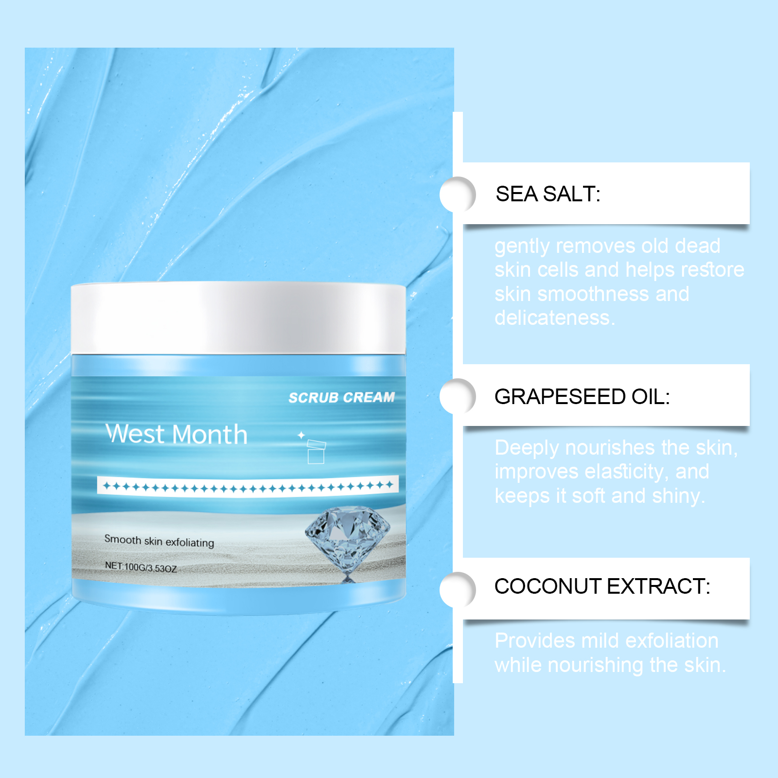 Our exfoliating body scrubs contain sea salt, glycerin. It can help remove old dead skin cells and make the skin smoother and more transparent. Its use method is very simple: moisturize the body skin, apply appropriate amount of this product evenly on the body skin, gently massage in a circular motion for 3 minutes, and then wash off with clean water. And can deeply nourish the skin, keep the skin soft and elastic.