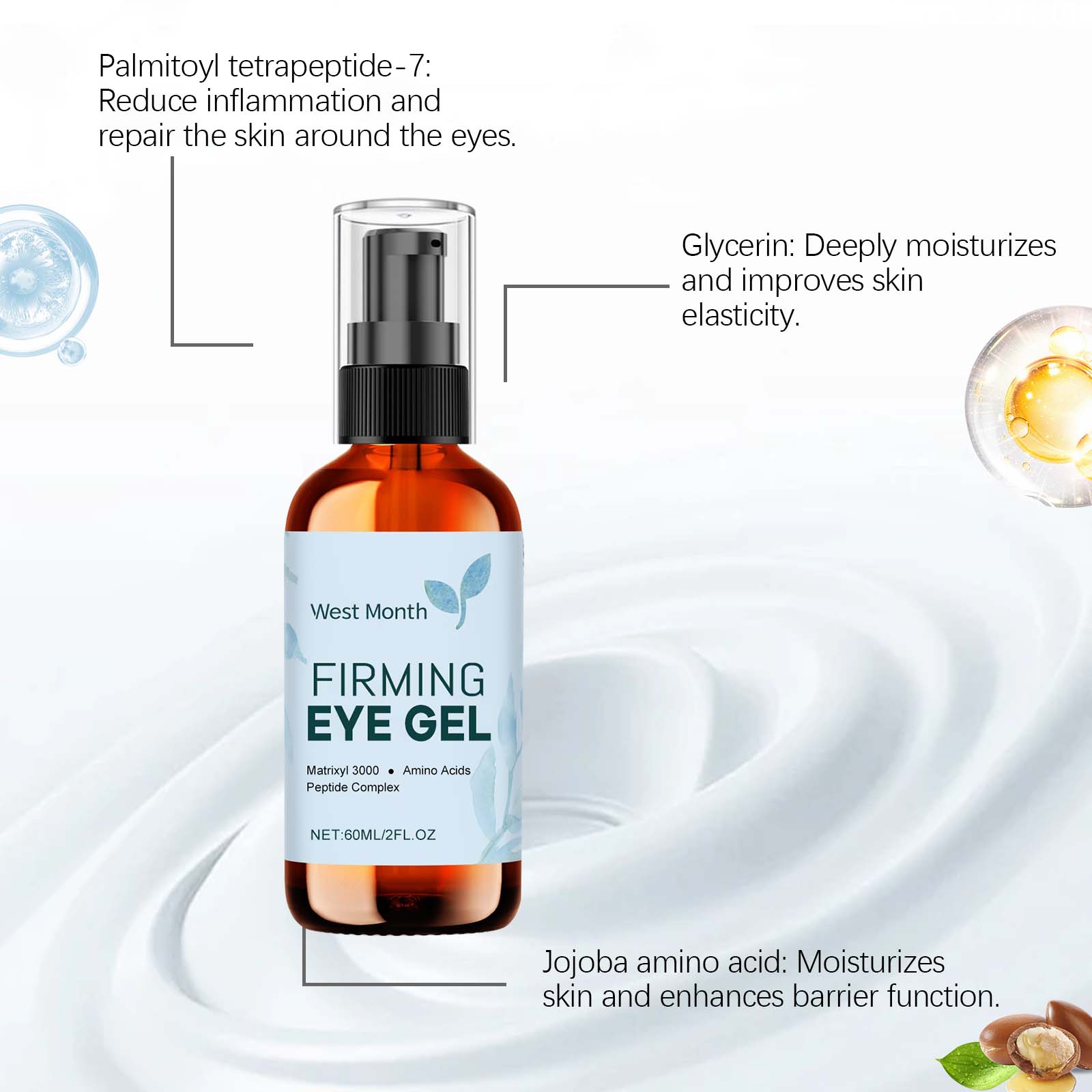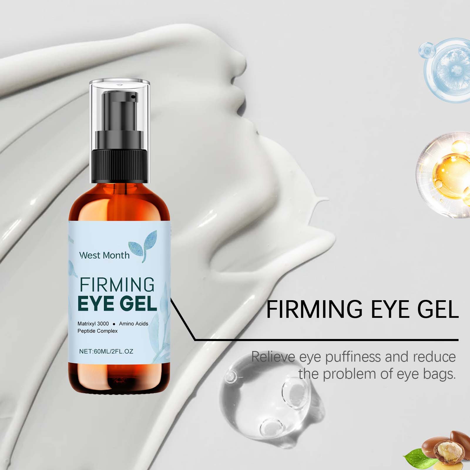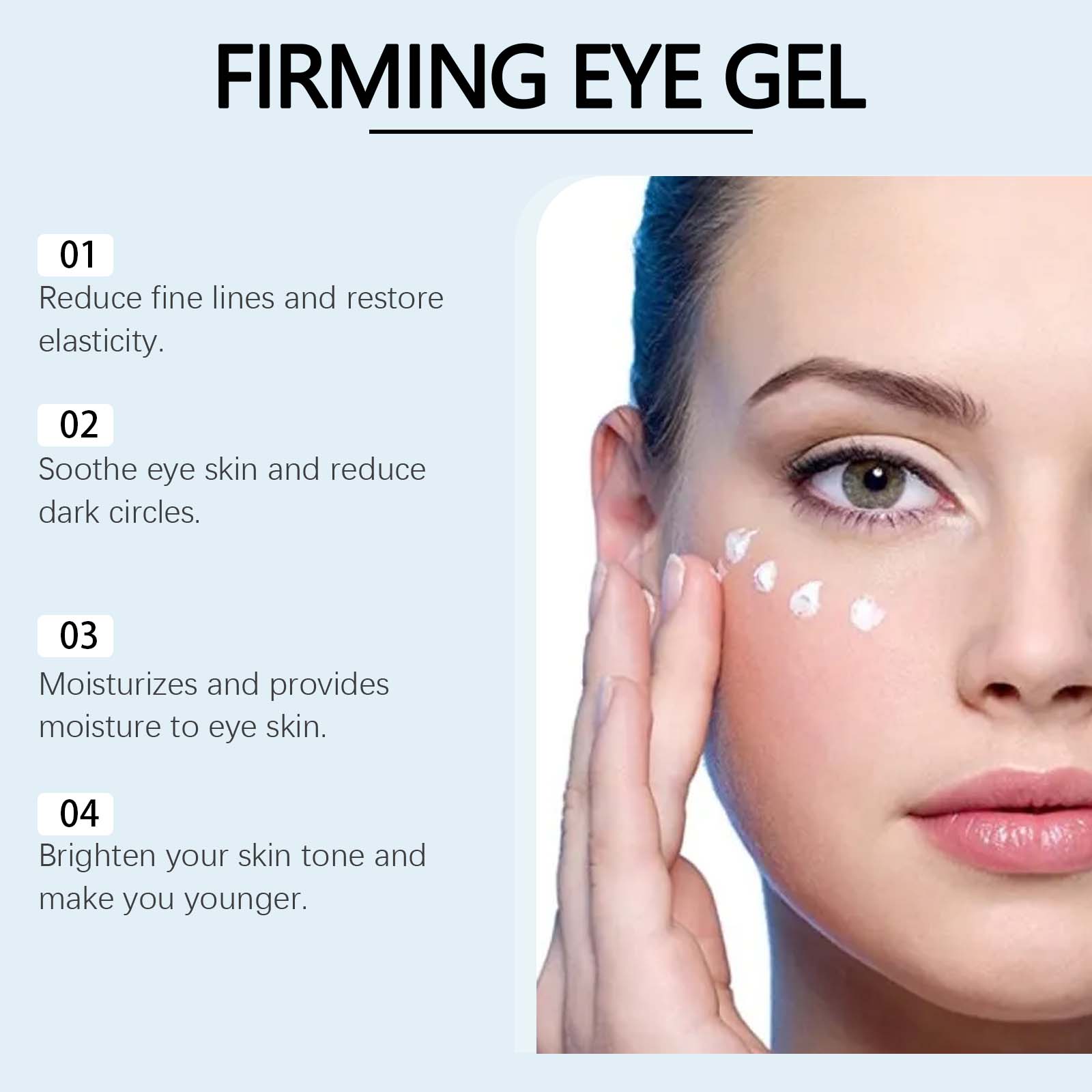 Our eye care gels contain glycerin, carbomer. It can be uniquely formulated to penetrate deep into the skin and effectively reduce fine lines and wrinkles. Improve the elasticity of the skin around the eyes, tighten the bags under the eyes, and improve the black eye roll. Its application method is very simple: thoroughly clean the face and eye skin, and dry it, take a proper amount of this product evenly spoon on the eye. Finally, gently massage to promote absorption. It can also smooth the fine lines around the eyes and make the skin smoother and more delicate.